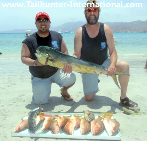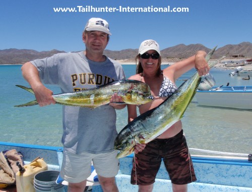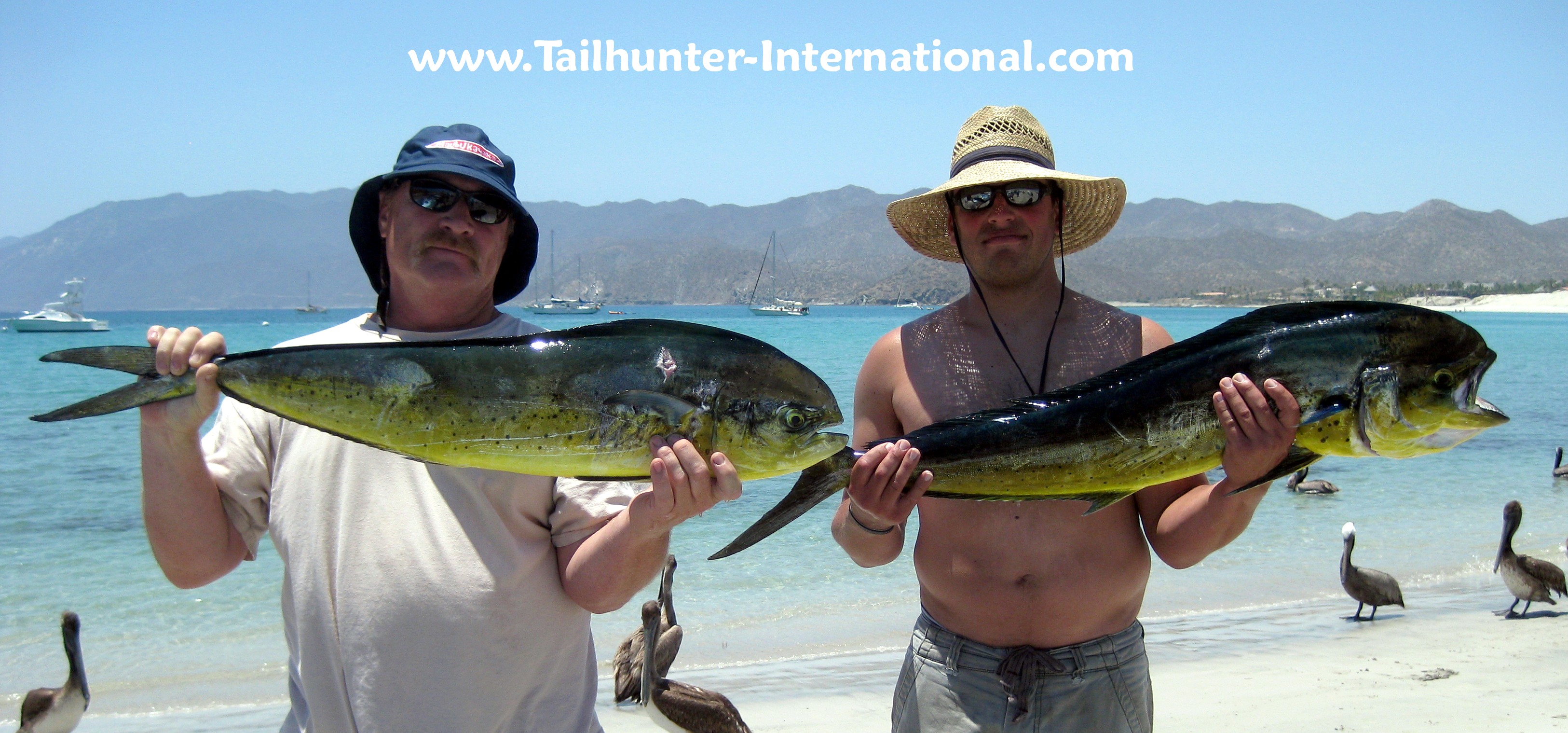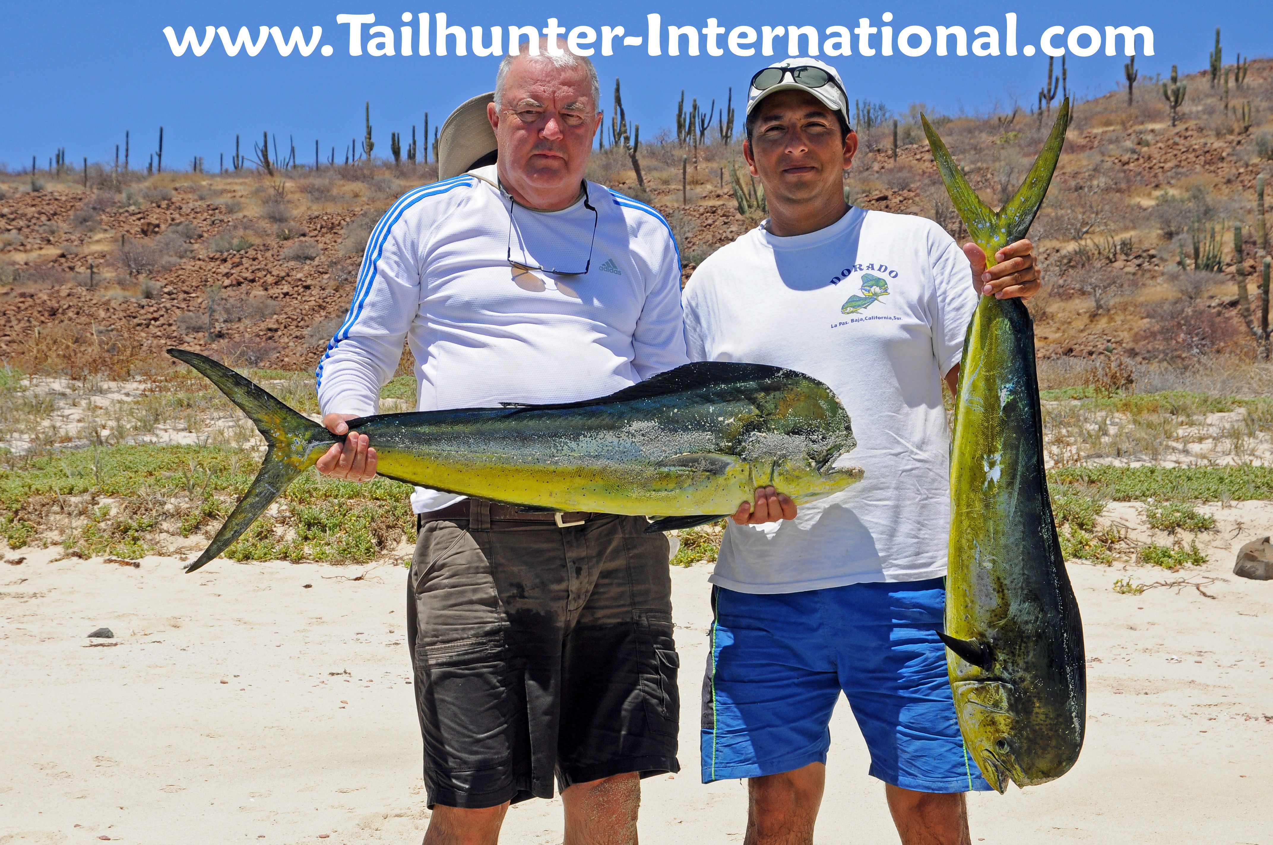 Popular Captain Joel with our Tailhunter La Paz Fleet poses next to Dr. Bruce Beckford from Colorado holding up a pair of their dorado they picked up fishing north of La Paz around the island.