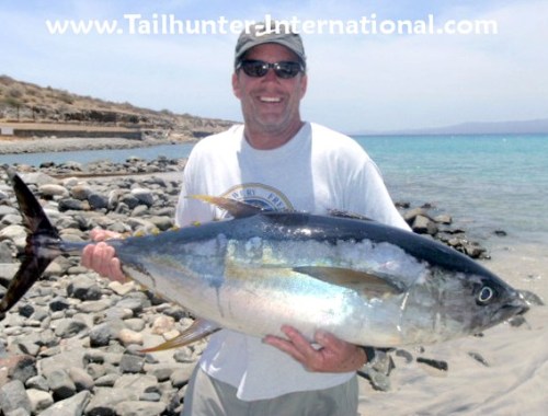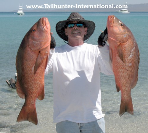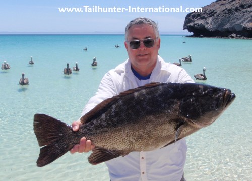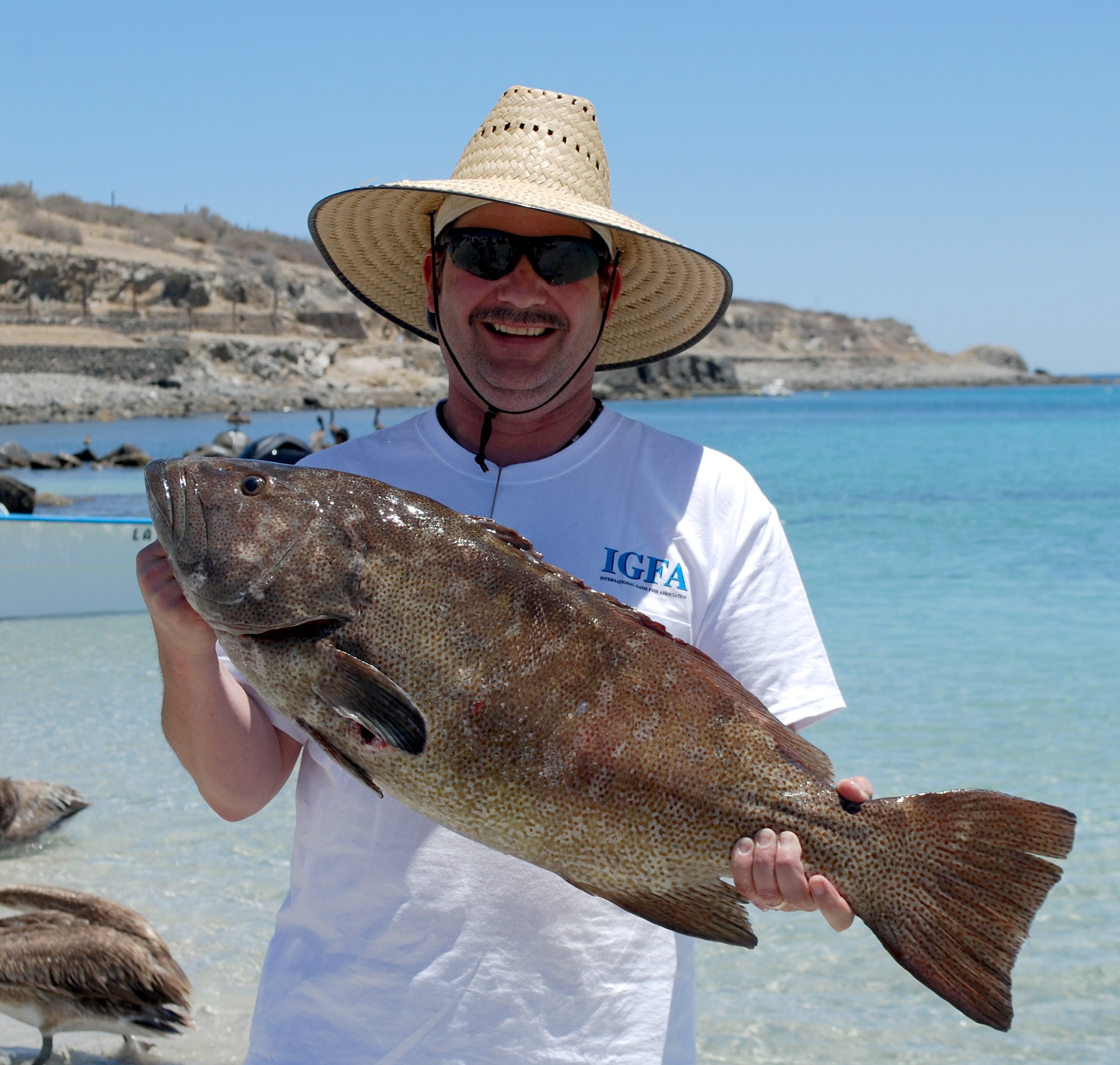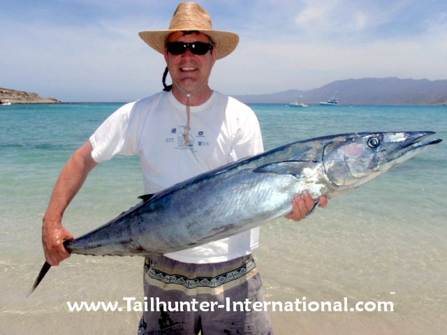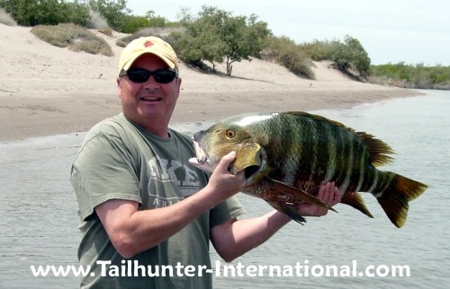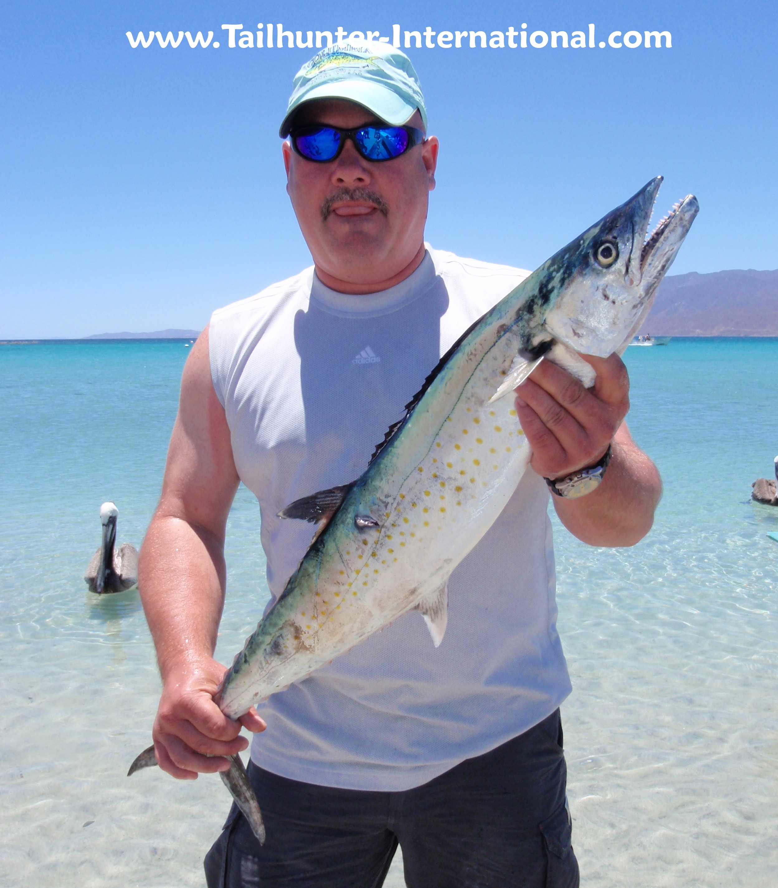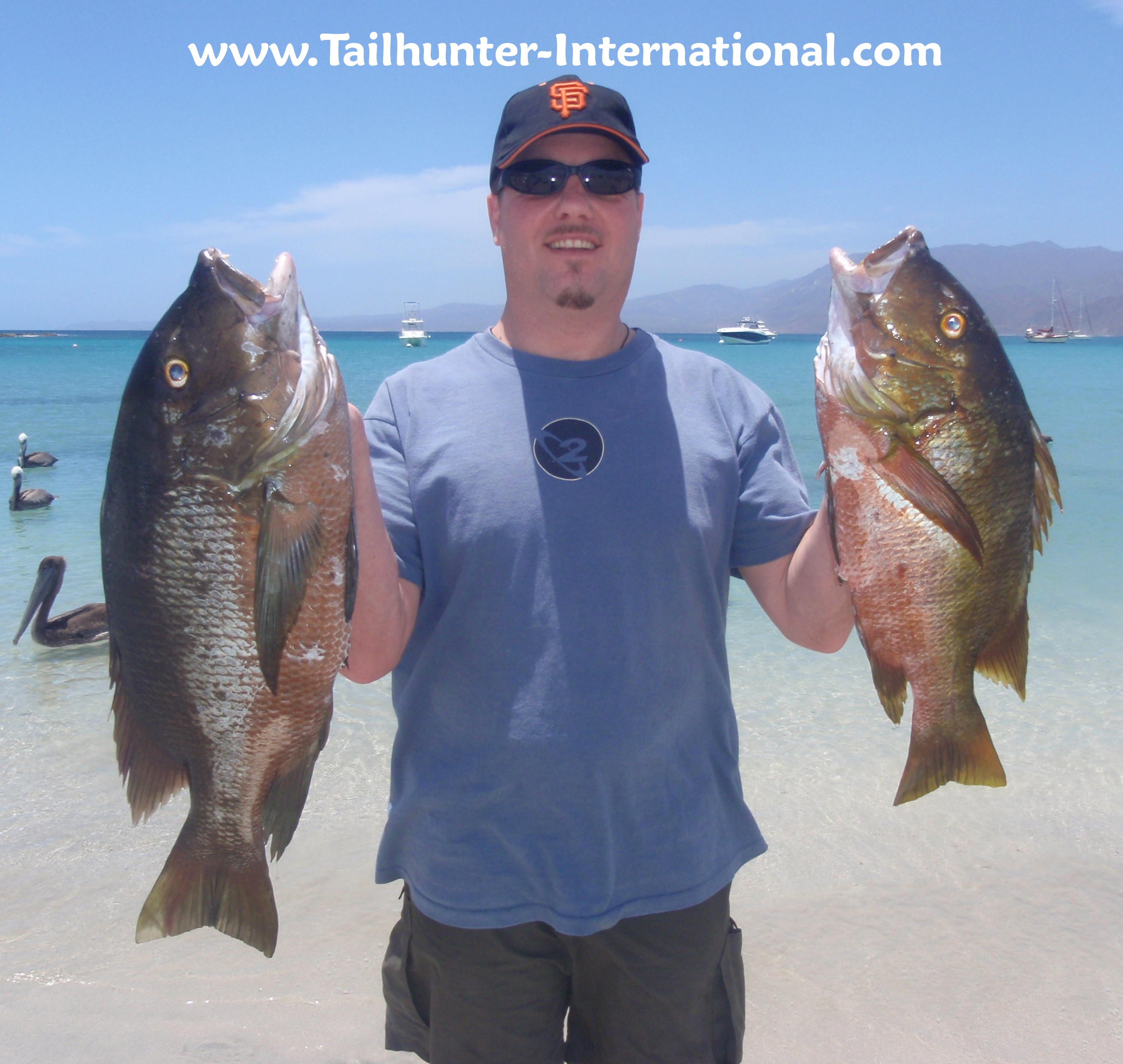It's been a good season so-far for barred pargo and with erratic winds keeping alot of the action close to shore, the pargo fishing helped fill out the ice chests. Mark Bianchi fishing La Paz for his first time holds up two of his pargo standing on the beach at Bahia de Los Muertos