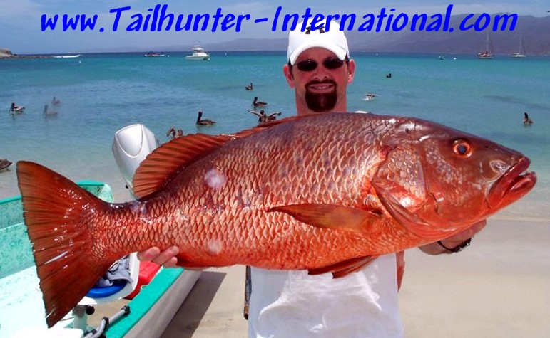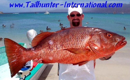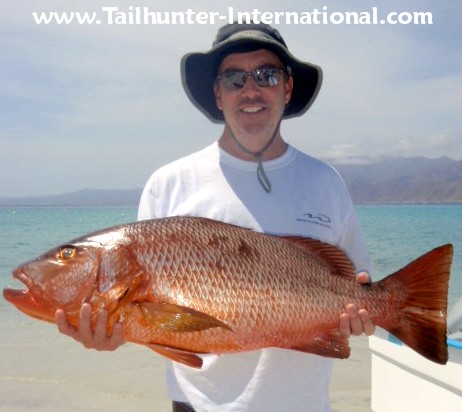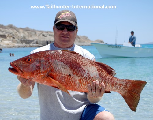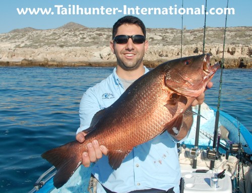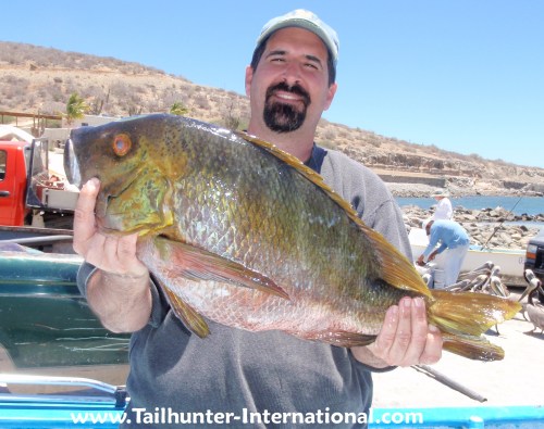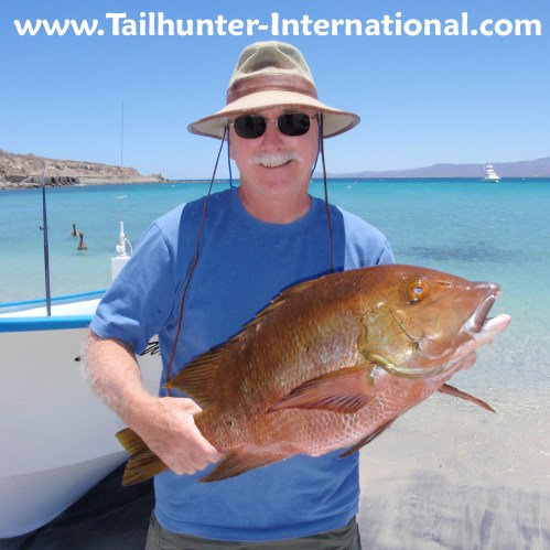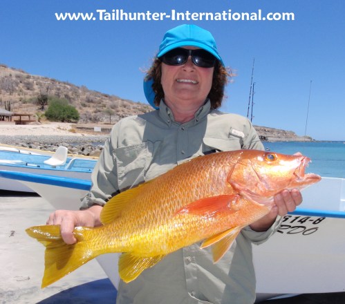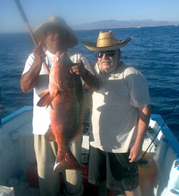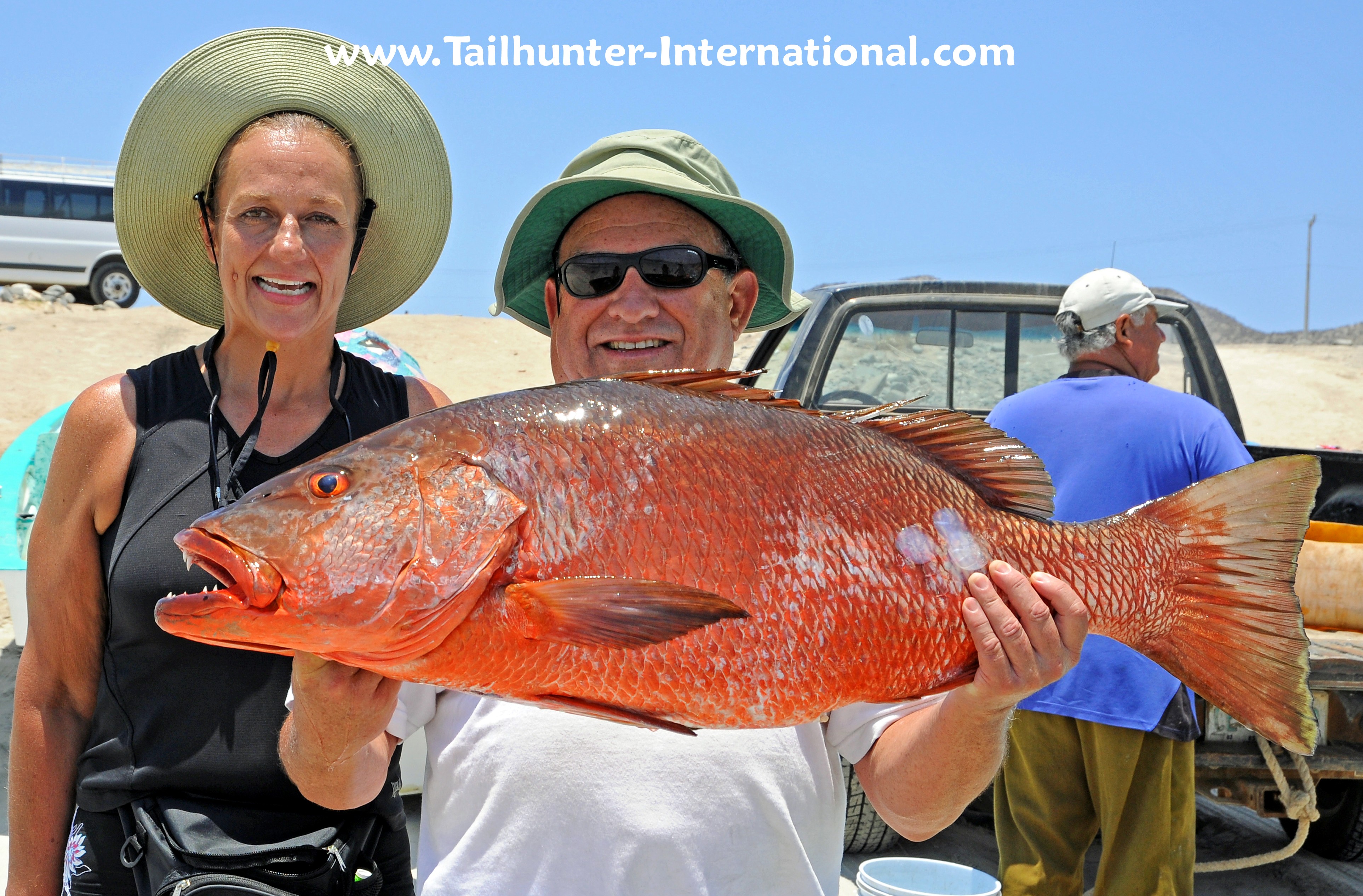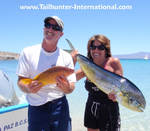 First timers to La Paz Joe Valenzuela and Danna Hill from Anaheim CA, got big fish-of-the-day kudos by pulling this trophy dog-tooth snapper out of the rocks near Bahia de Los Muertos. The big pargo are still around in the shallows