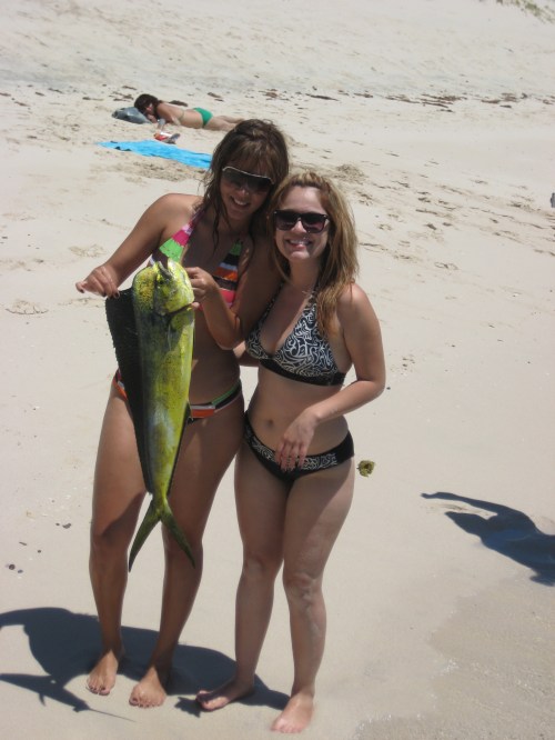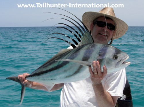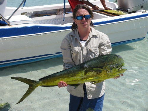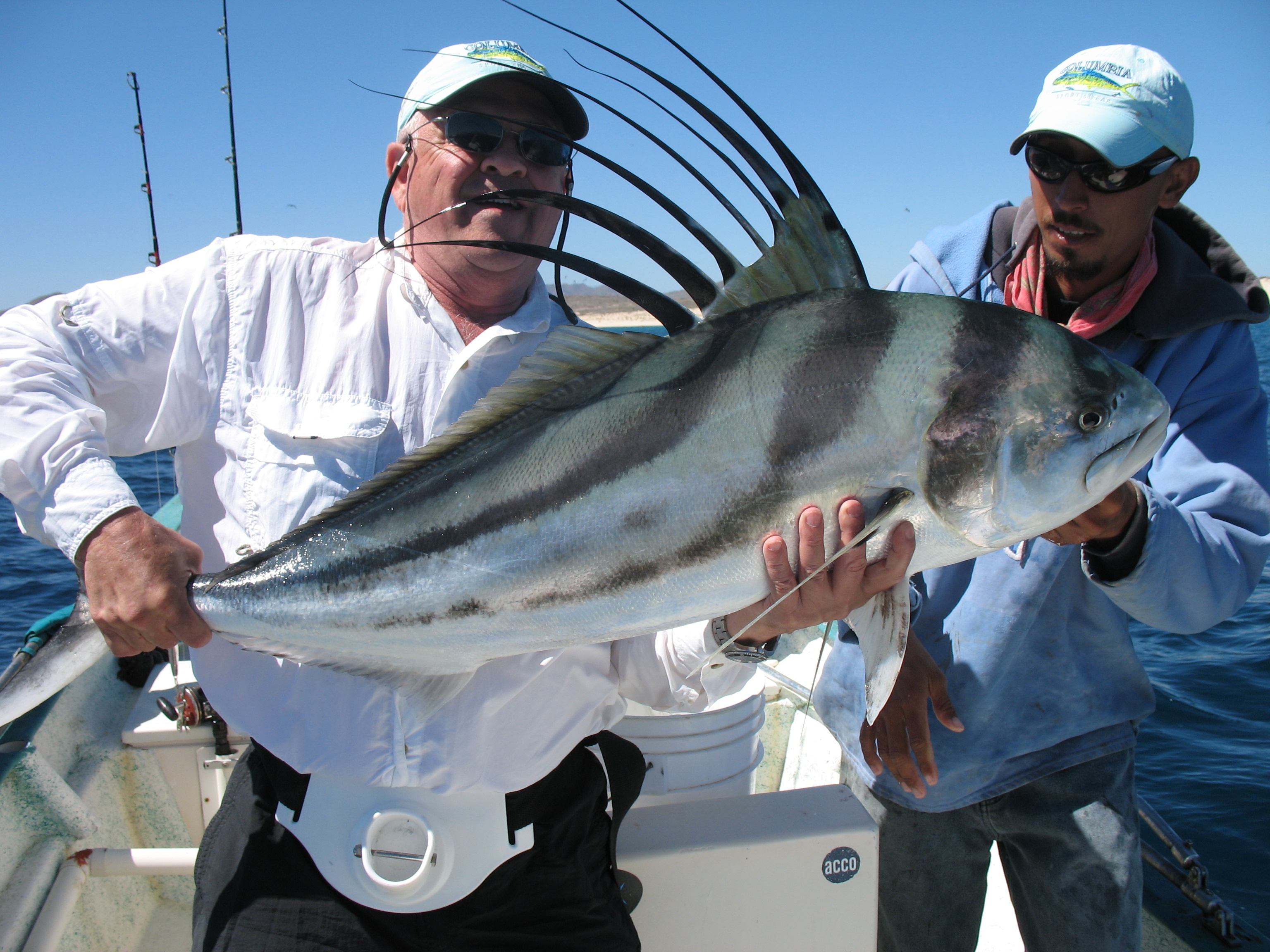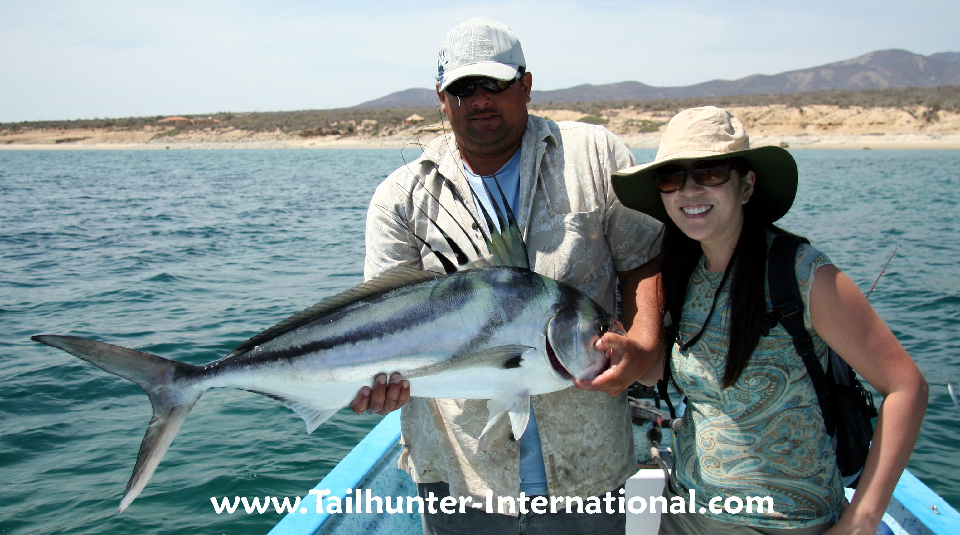 She's an optometrist from Orange Co, but Stephanie Sjauwfoekloy had no trouble seeing this nice roosterfish caught just offshore from Muertos Bay with Captain Armando lending a hand.