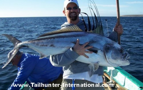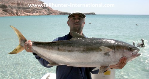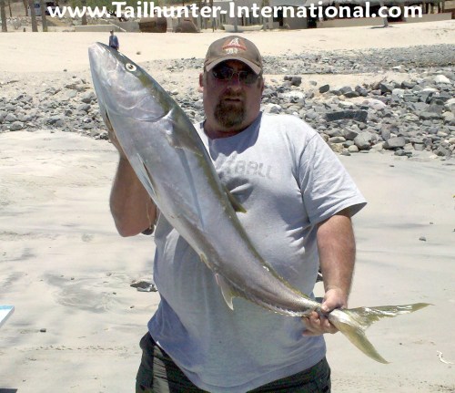 We haven't seen yellowtail in about 3 weeks since waters got warmer, but Bob Blodgett from the San Francisco Bay area got this 30 pound class jurel fishing with Capt. Ramiro out of Muertos Bay and our Tailhunter Las Arenas fleet in very windy conditions.