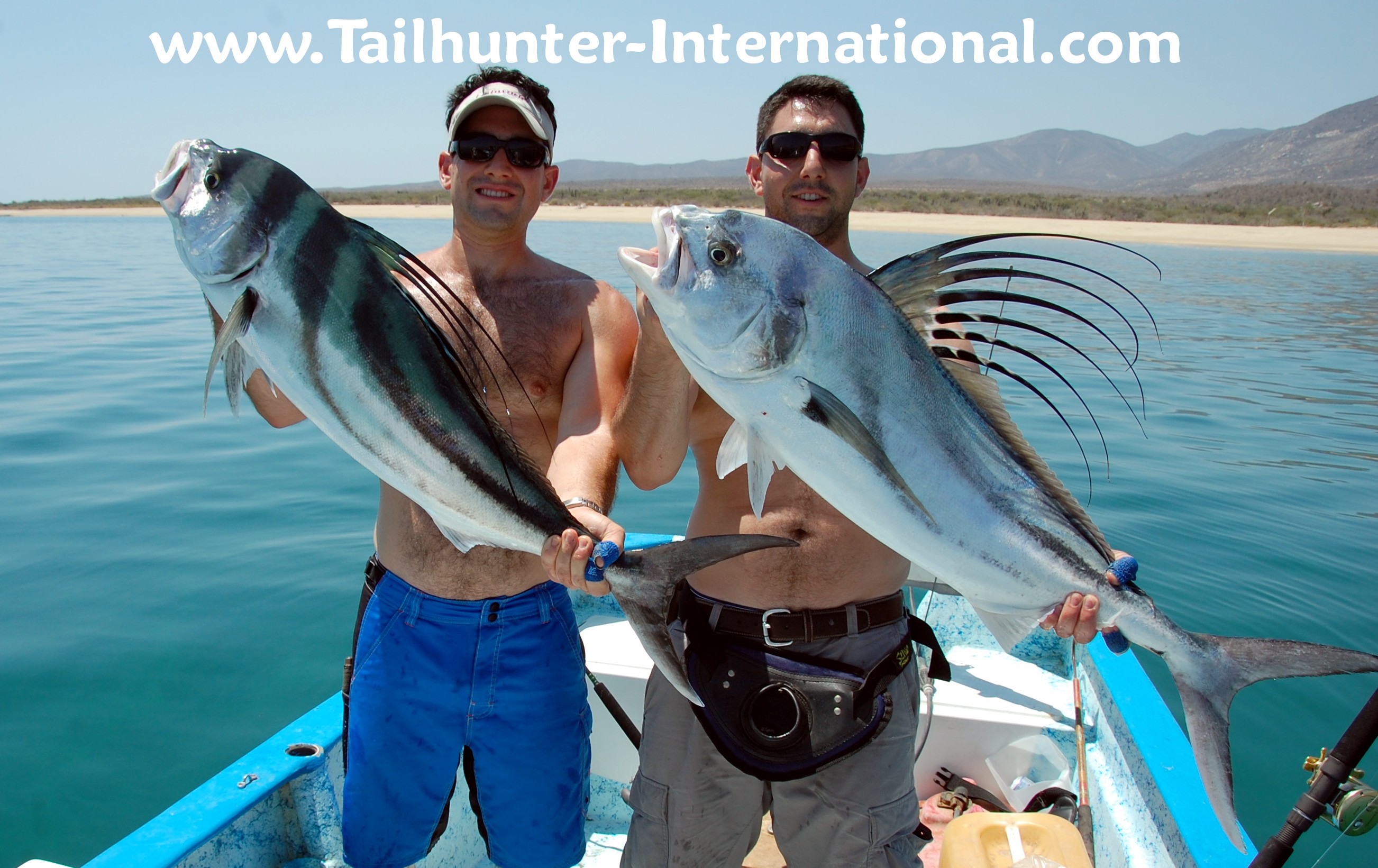 Sean Tennis is a long way from Watertown, S. Dakota, but made it pay off fishing with our Tailhunter Las Arenas fleet and this beast of a roosterfish estimated in the 60-pound-class. In trying to hoist the fish up for a quick photo before releasing it, the fish smacked our burly Captain Archangel so hard it nearly knocked him out of the panga and hit him with enough force to smash the wind out've him. Sean and his amigo, Dan Clift, got a number of roosters of varying sizes this day. It's been great rooster fishing the last few weeks.