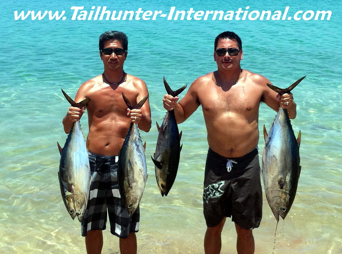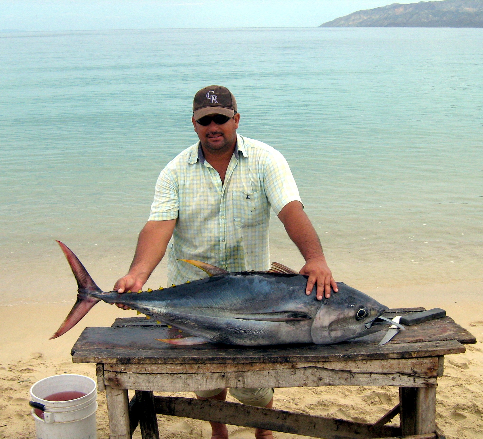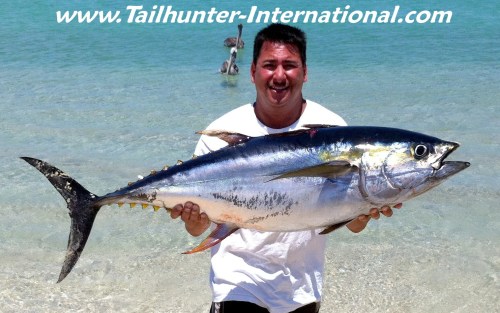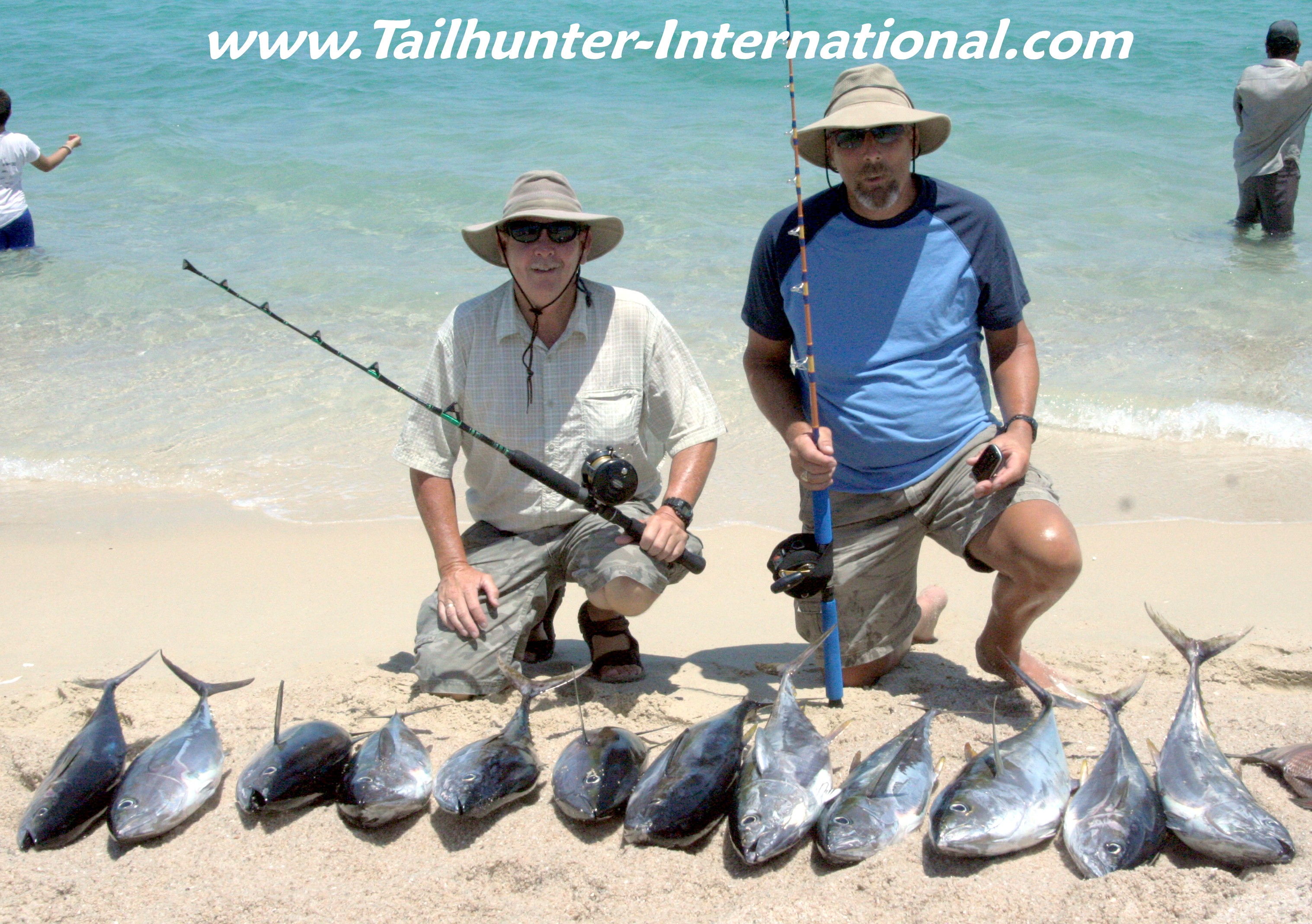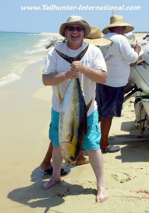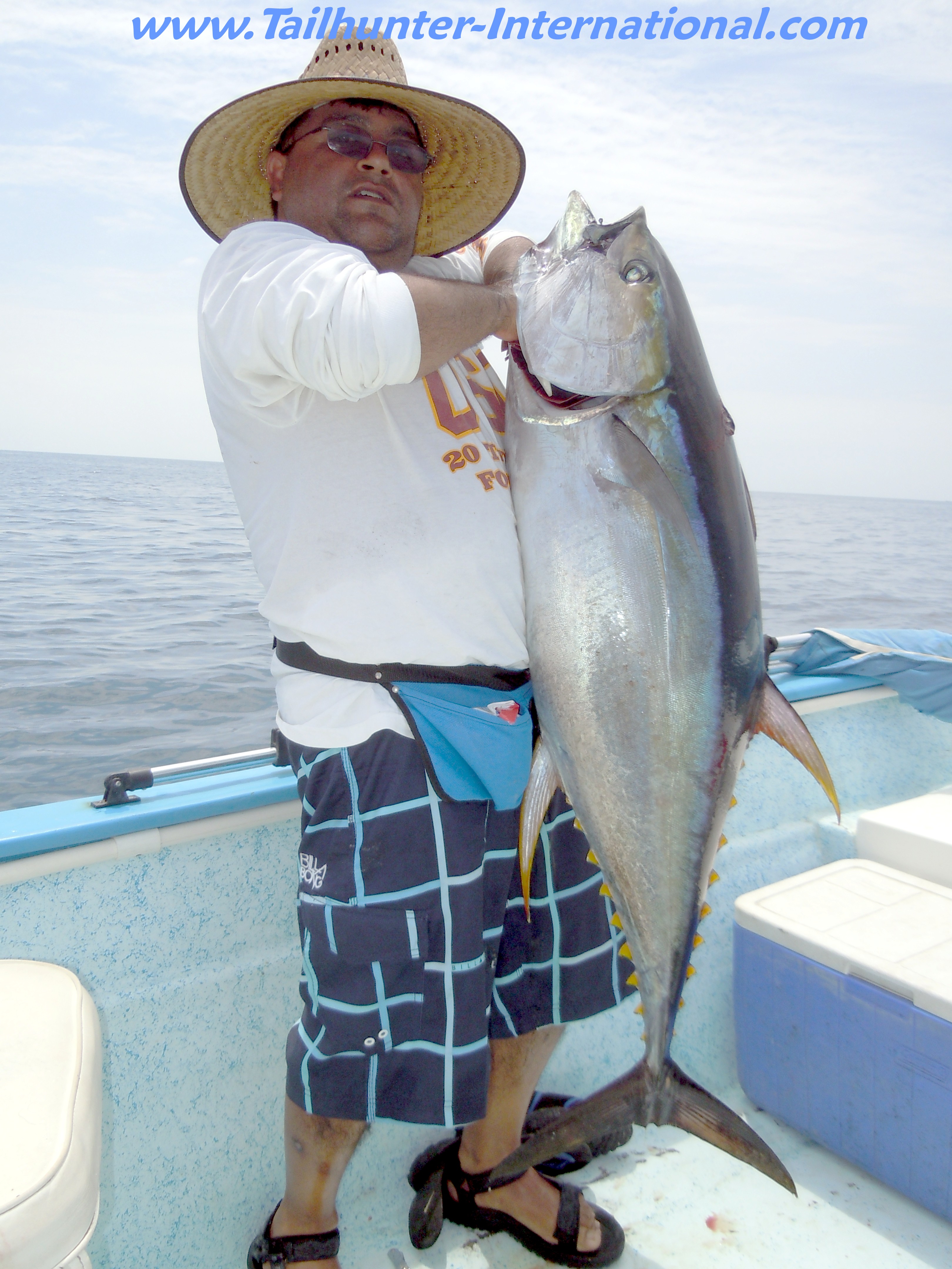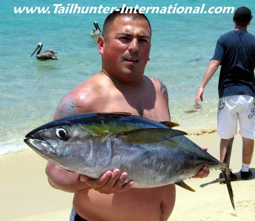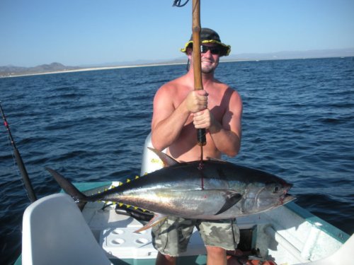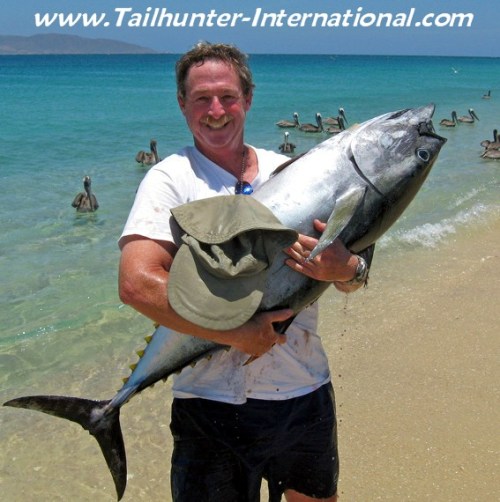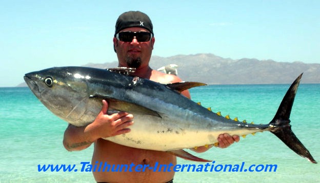 This is the whacked fish story of the week. Take a look at this 45 pound fish and our Captain Armando. . For several weeks we've been telling people how close the big fish are to shore. No one believes us. Captain Armando was running his panga up onto the sand, he was trailing a chunk of big squid. Now...a bunch of clients saw this...suddenly a big tuna comes greyhounding out of the water chasing after the panga! The big fish was so intent on getting the squid and so hungry, the crazy thing charged right up onto the sand where a bunch of captains and clients tackled it like a fumbled football at the Super Bowl. Here's Captain Armando with the proof. Everyone was talking about the crazy tuna! This tuna was only about 20 yards off the beach when it got fired up and turned on the jets! That's Cerralvo Island in the background. Flat as a lake out here! As I heard the story again from several sources, some of the guys thought they saw a big marlin just off shore that appeared to be feading so maybe this tuna was just trying to get out of the feeding zone!