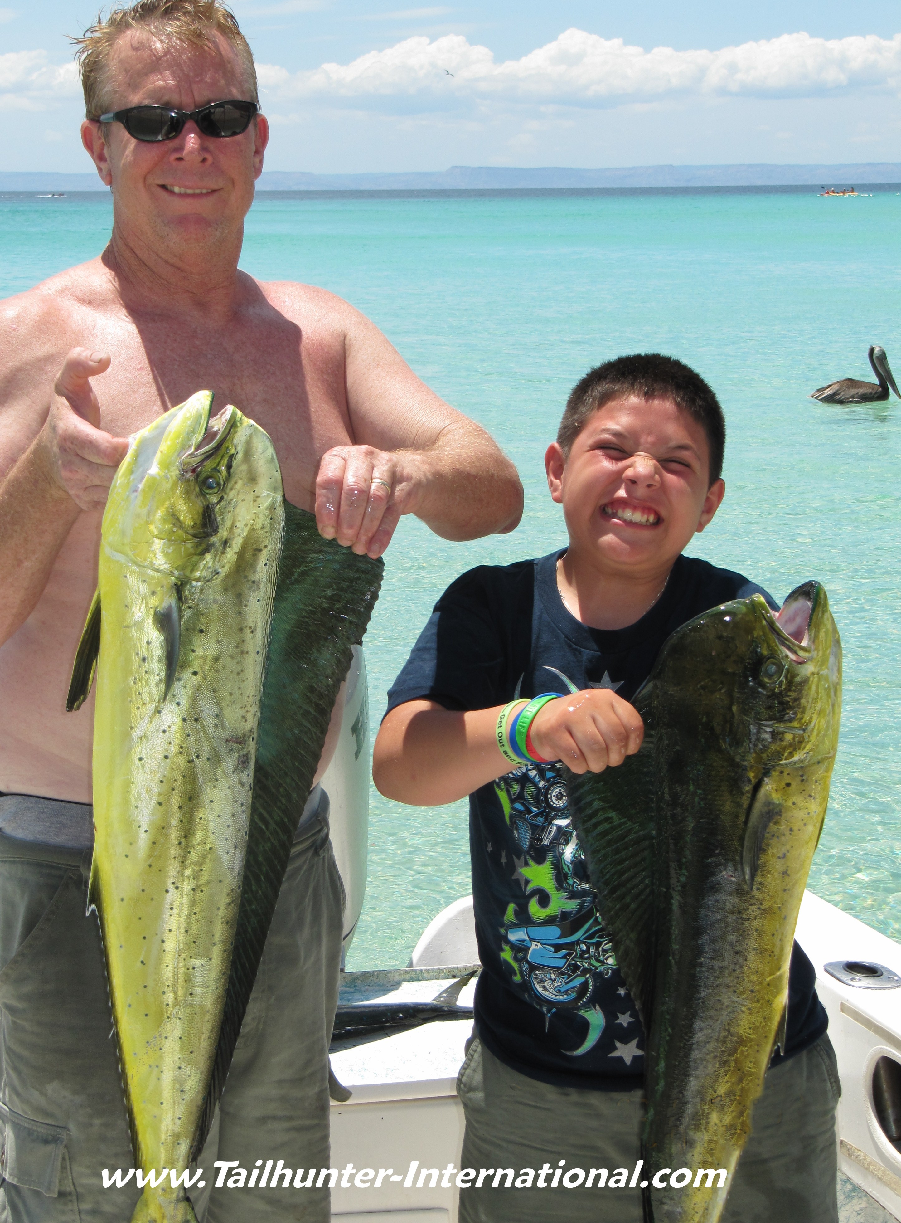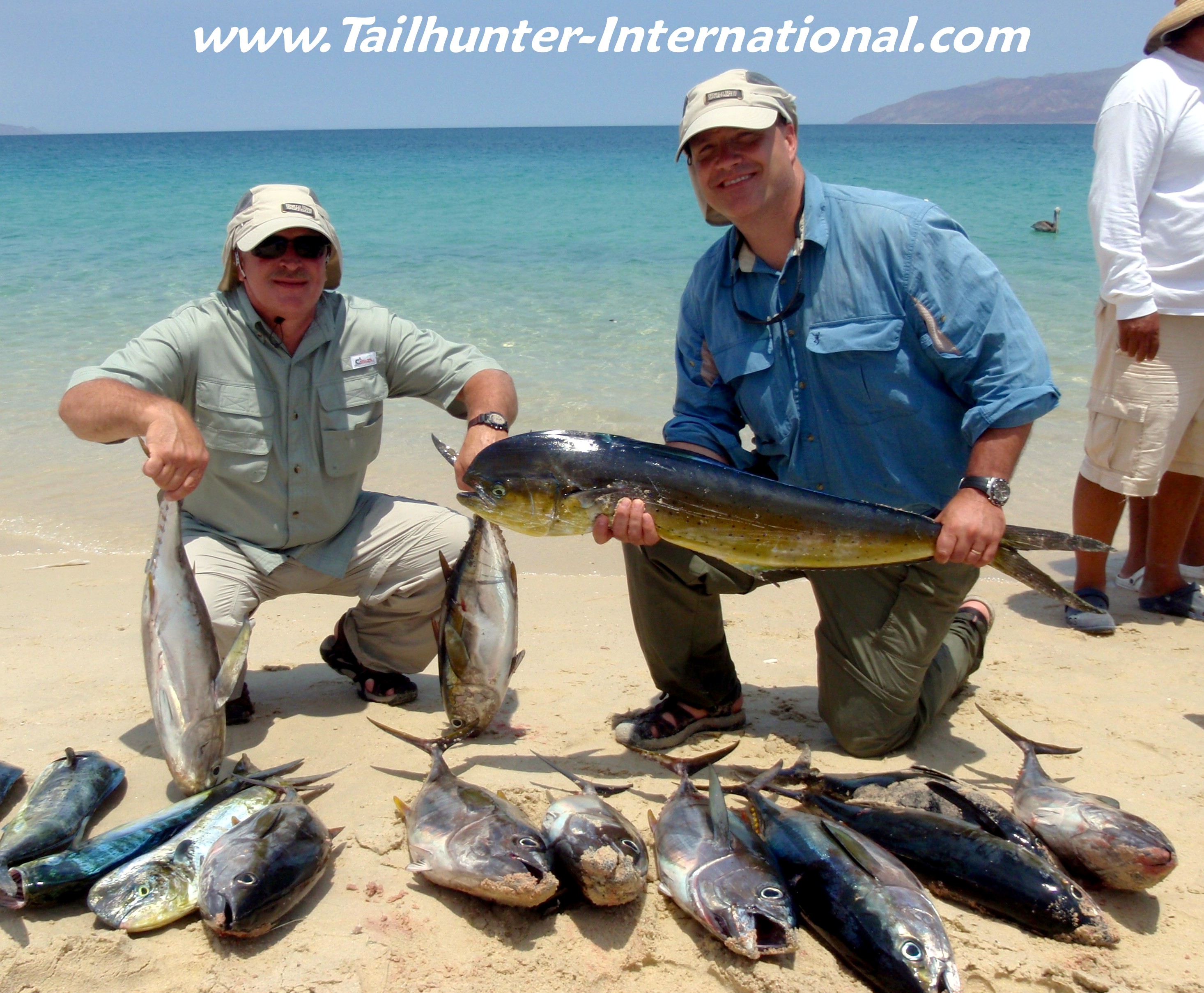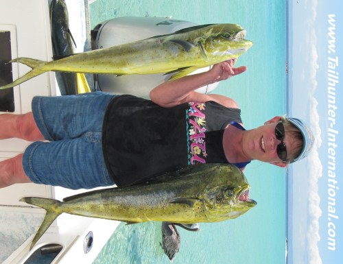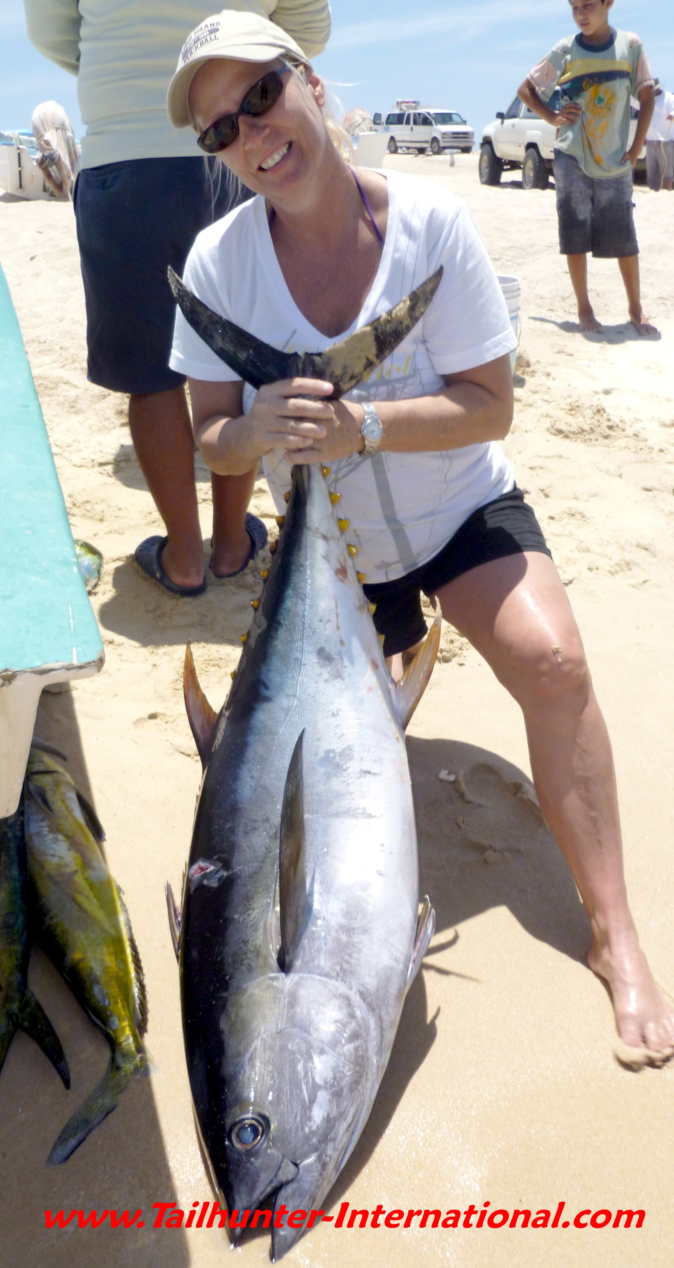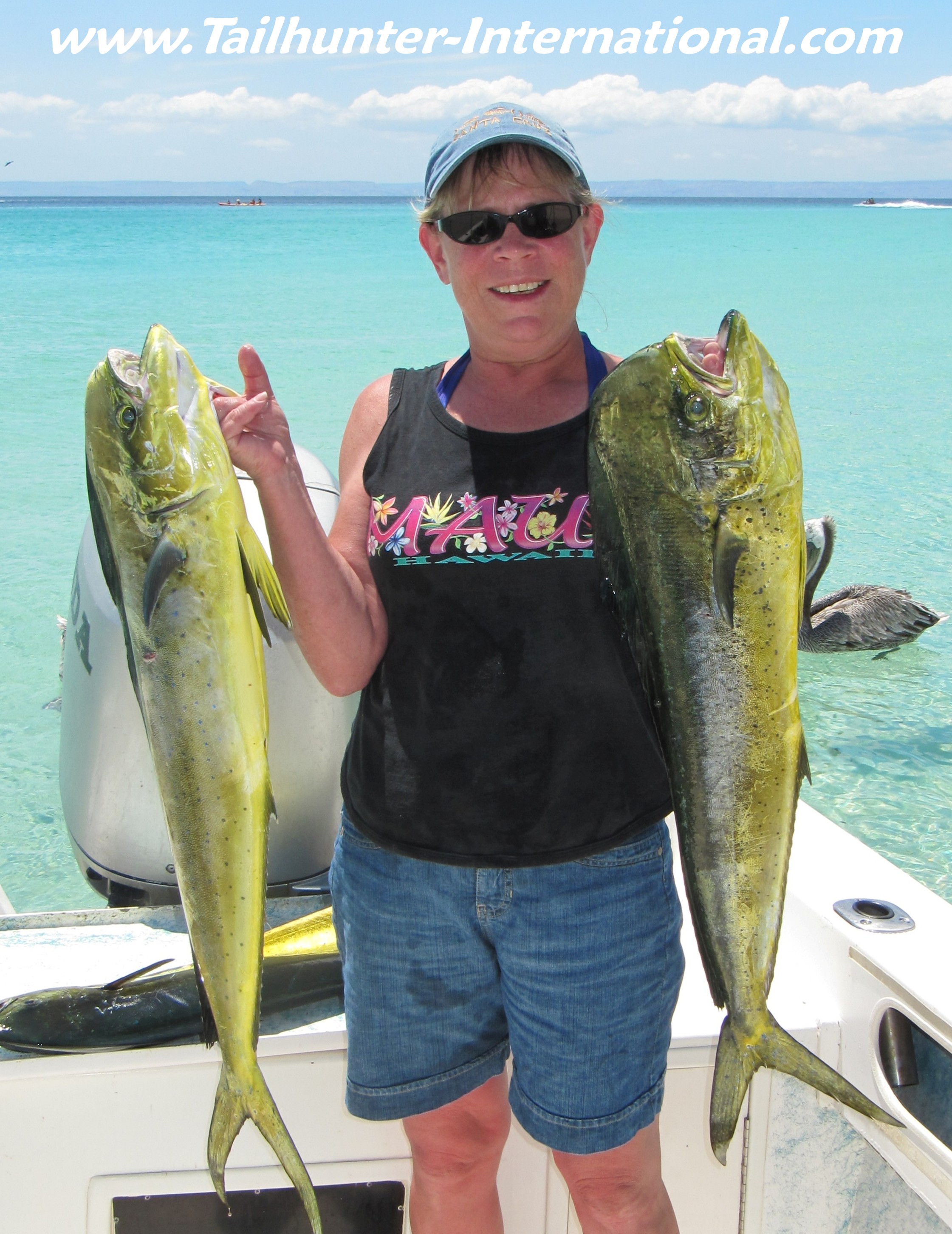 For dorado fishing, ninety percent of our catch with our Tailhunter La Paz fleet has been on dorado. Karen Kruse from Sacramento poses at Balandra Beach for photos and fish cleaning with two of her limits of dorado.