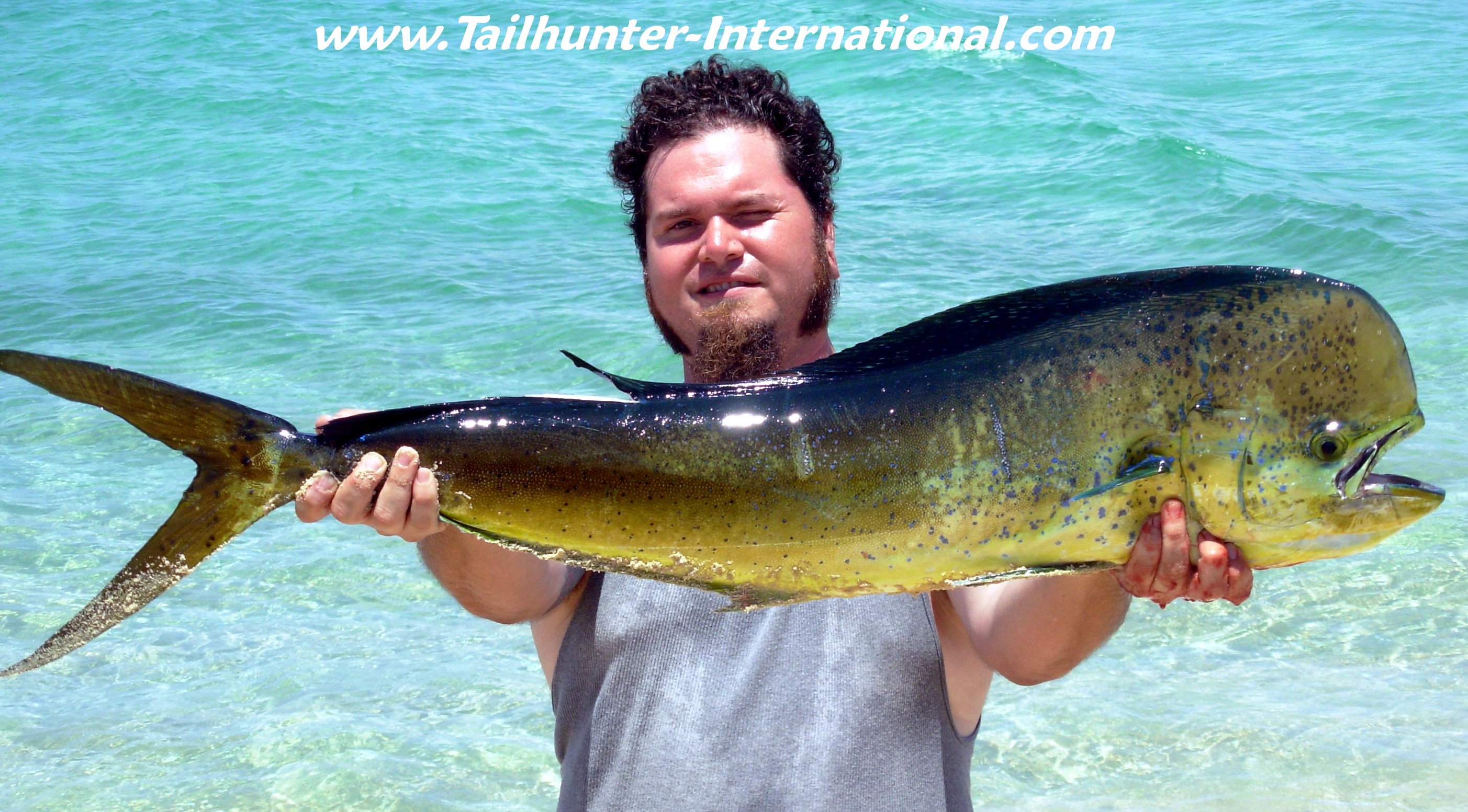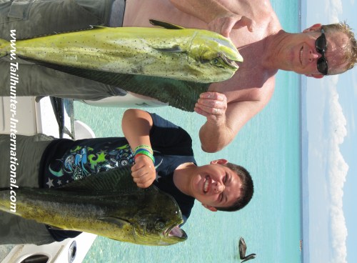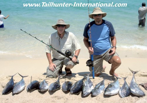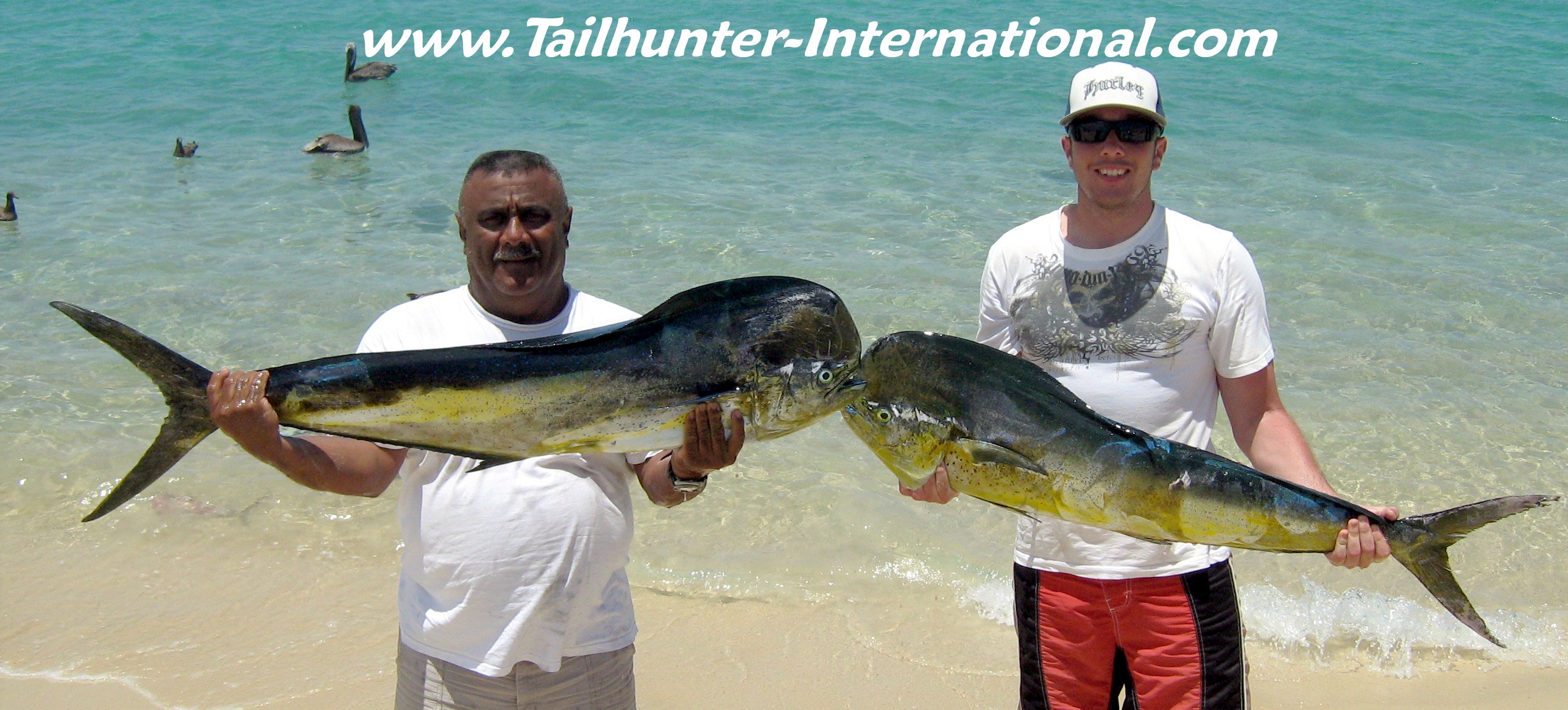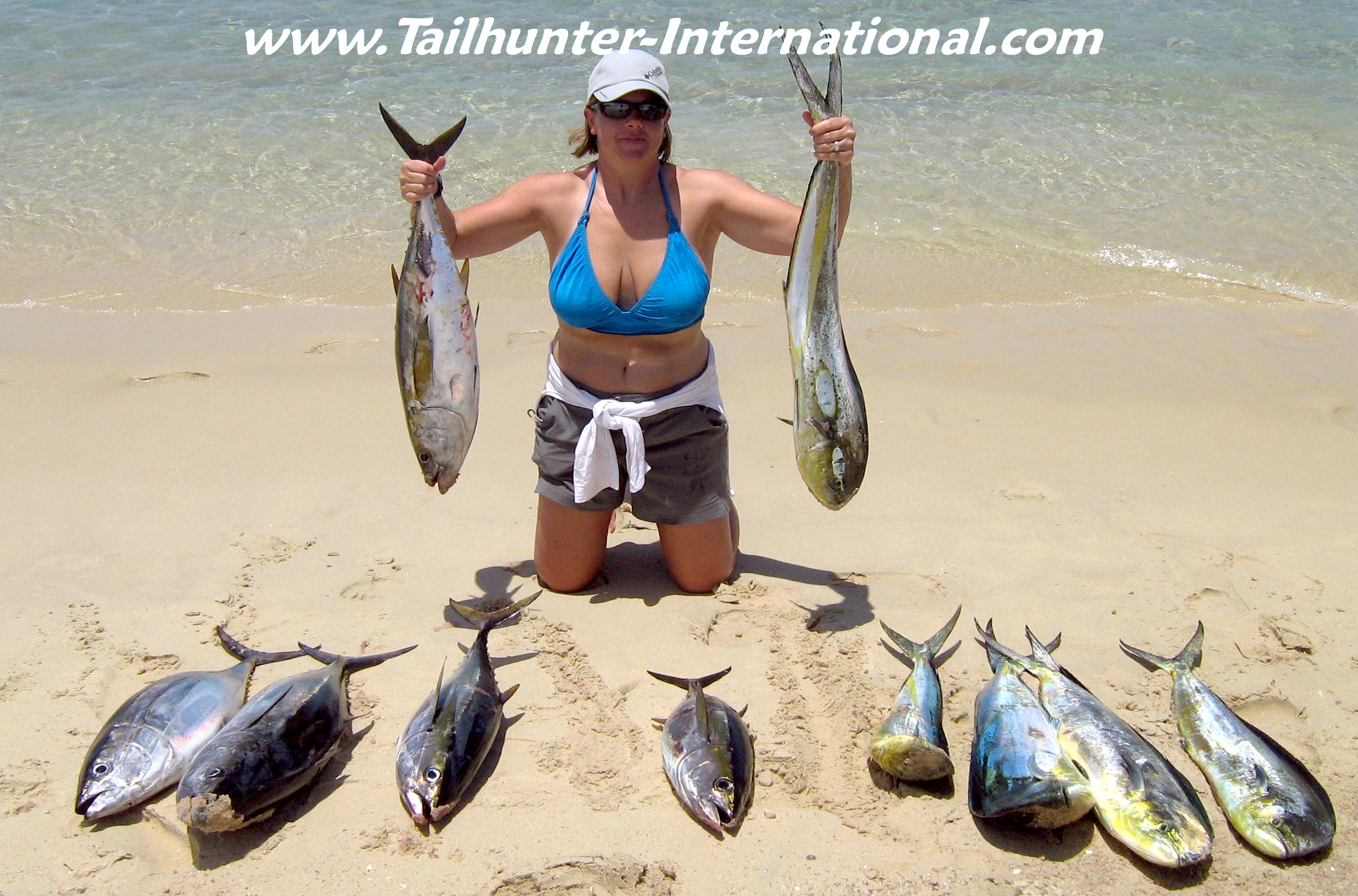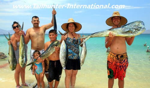 For dorado fishing, ninety percent of our catch with our Tailhunter La Paz fleet has been on dorado. Karen Kruse from Sacramento poses at Balandra Beach for photos and fish cleaning with two of her limits of dorado.