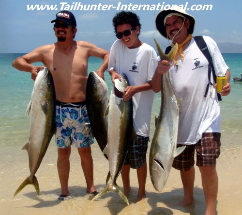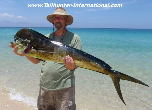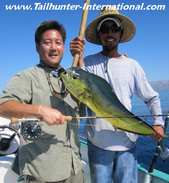 On the flyrod! Mark Aizawa has come several times trying to get at least one dorado on his flyrod and finally succeeded on getting this one to hit his pattern and was kept for dinner. I get asked often how come I don't post up more flyfishing photos. It's not that we don't get flyfishers. It's that most of the catch gets released so unless the shot is taken on the panga, there's no fish to photograph on the beach! I personally rarely get on one of our pangas with flyfishers since with all the gear and all the lines shooting all over the place, there's no room for two flyfishers, me and the captain without me getting in the way. Plus, I'm a real hack on the flyrod anway. I stink. I play golf better than I flyfish! It's a real art.
