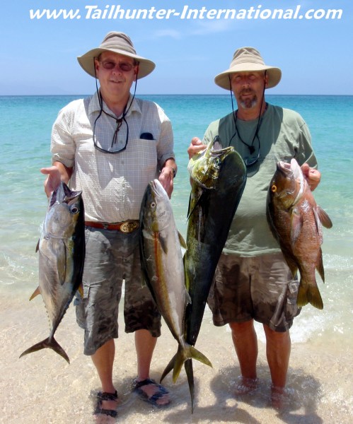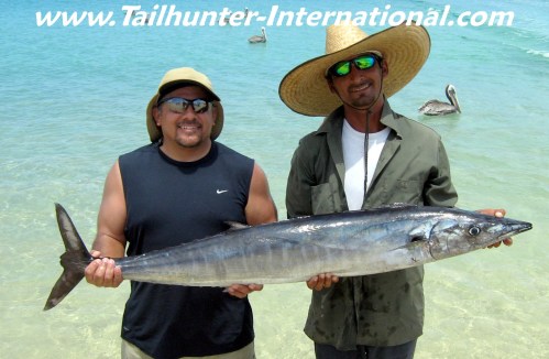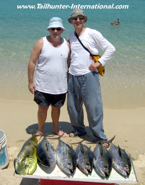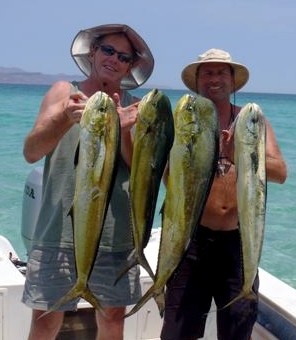 Dave Rose from Colorado helps out his amigo, Jack Garcia from San Bernardino CA who was on his first trip to La Paz. This dorado was caught just off the beach near Punta Perrico.