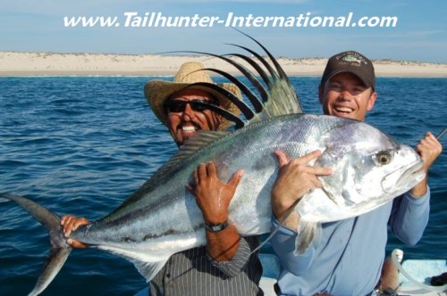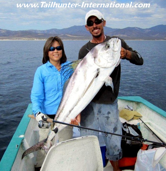 Light tackle big roosterfish for Caryn Aizawa from Pasadena CA. Captain Pancho put her on the fish near Muertos Bay just offshore. Caryn had a great 2 days of fishing taking roosters, tuna, dorado, and other species. The big roosters are still prowling the shallow waters off the beach. The big fish was released.
