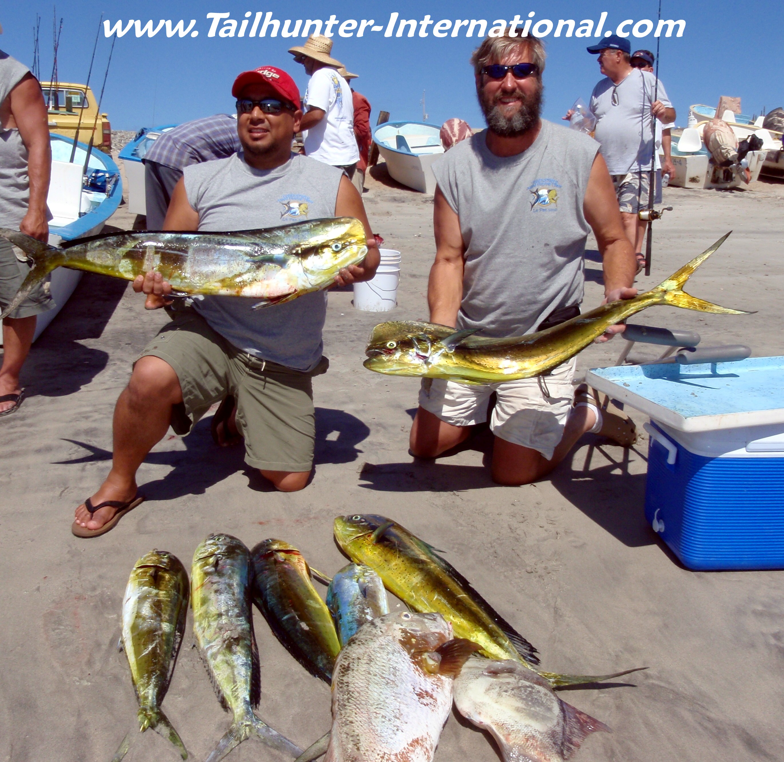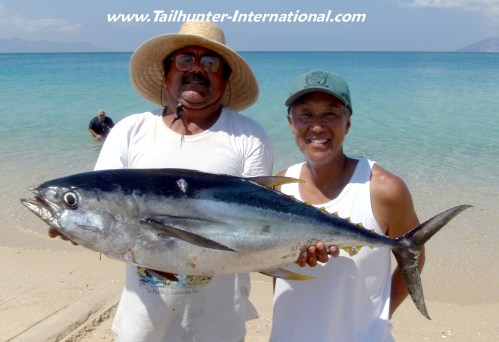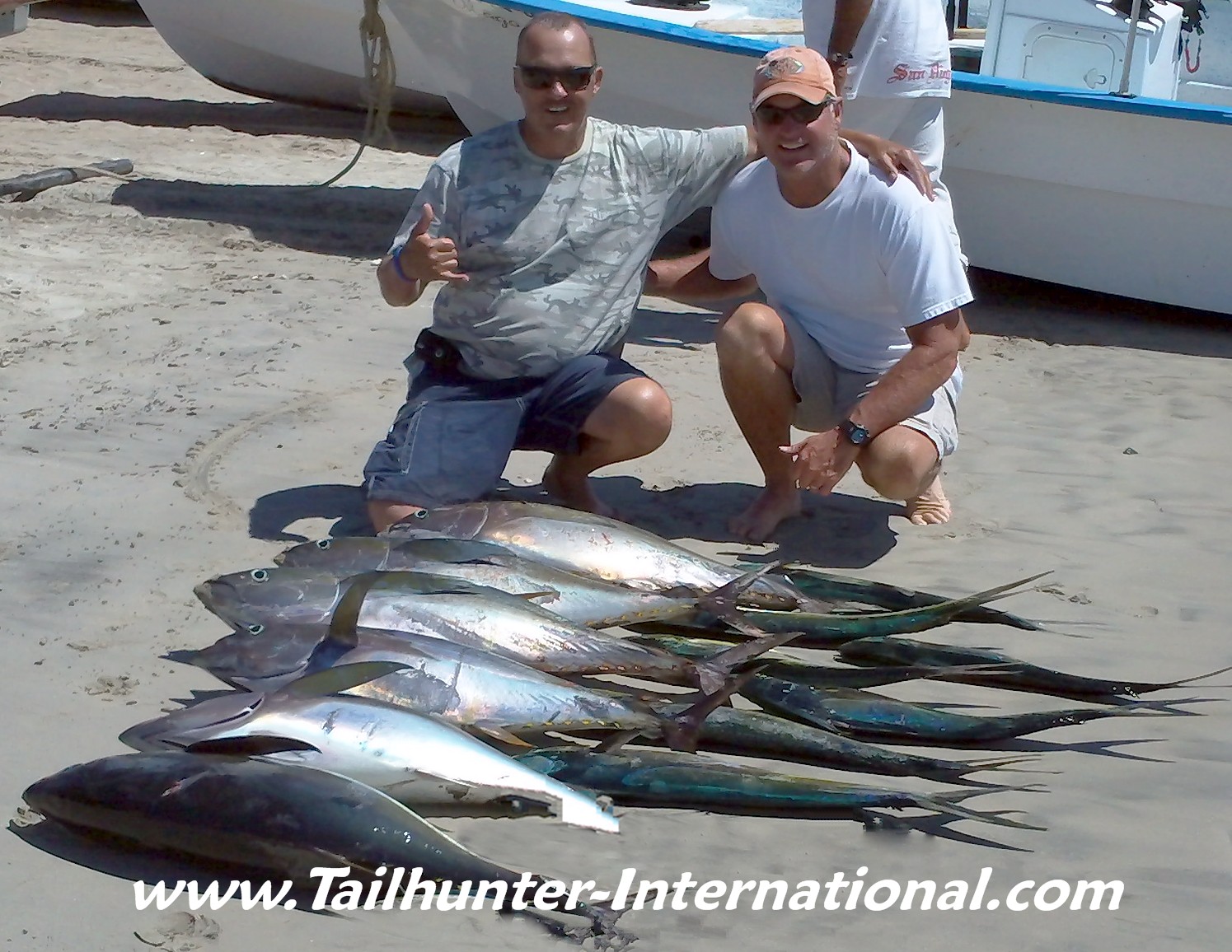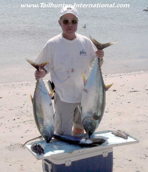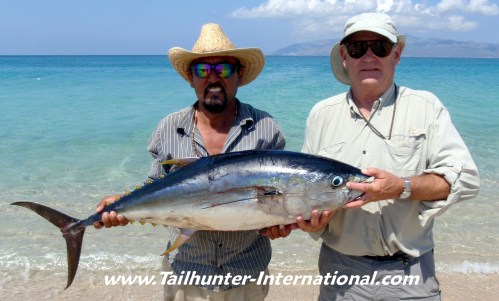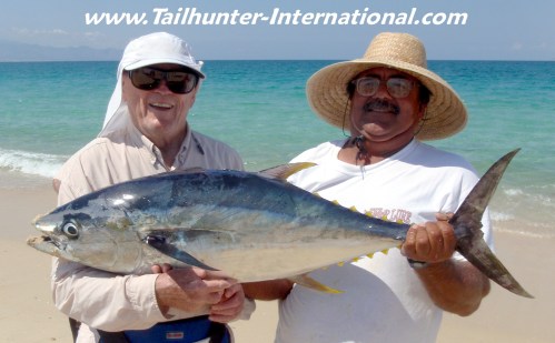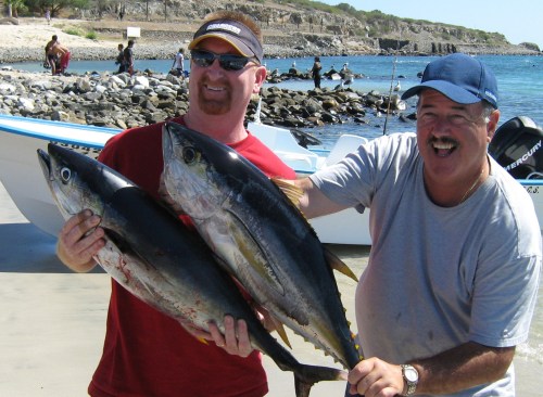 It's always a good day when the fish bite! Maxx Garris from Bakersfield CA and Ken Mitchell from Scottsdale, AZ do a little happy camera mugging on the beach with their tuna.