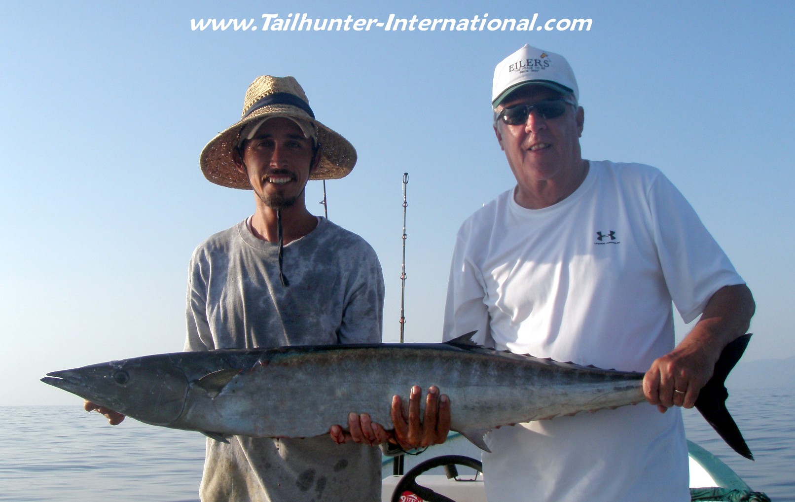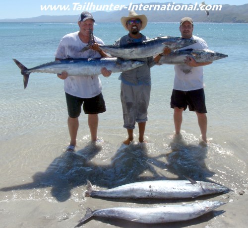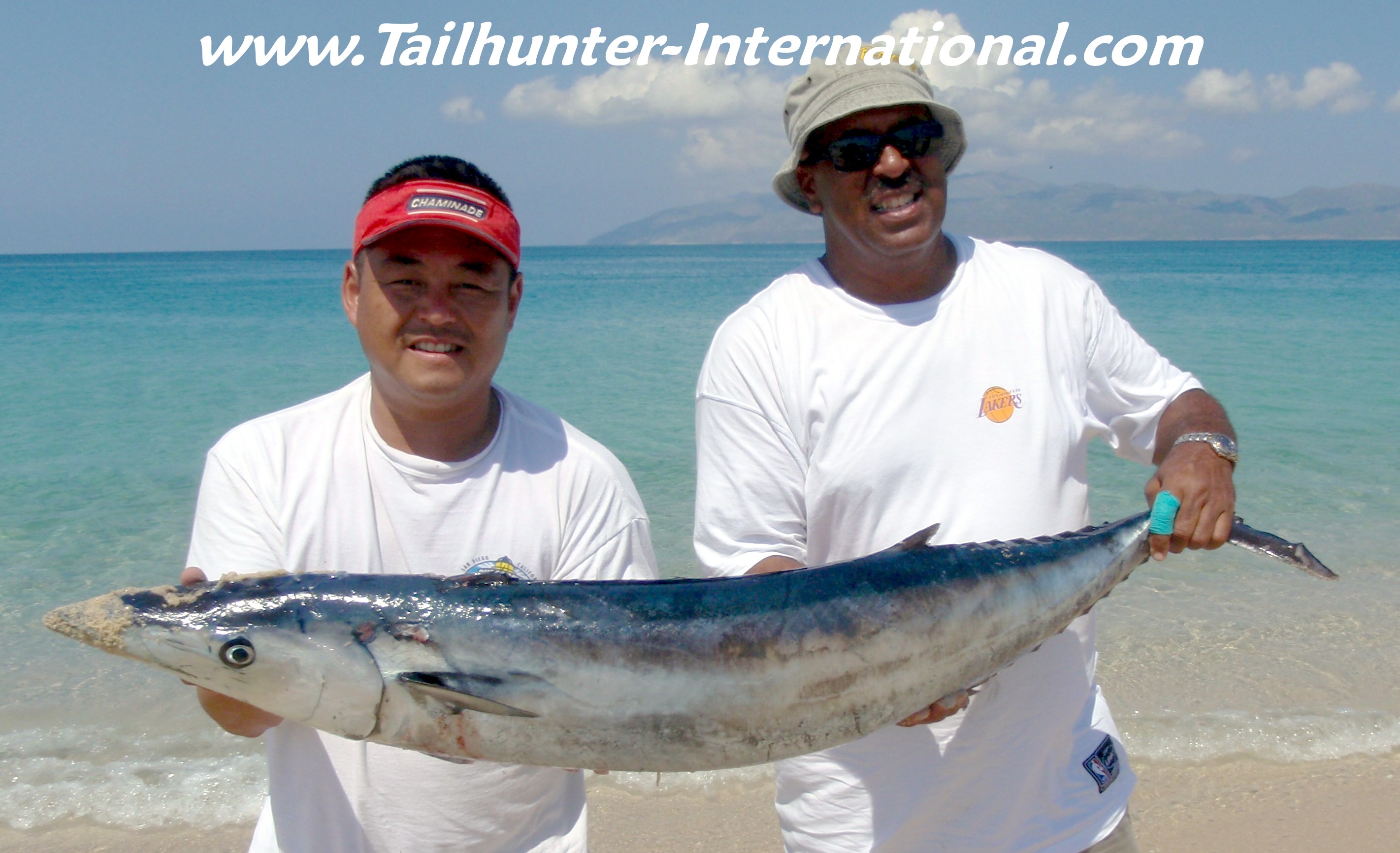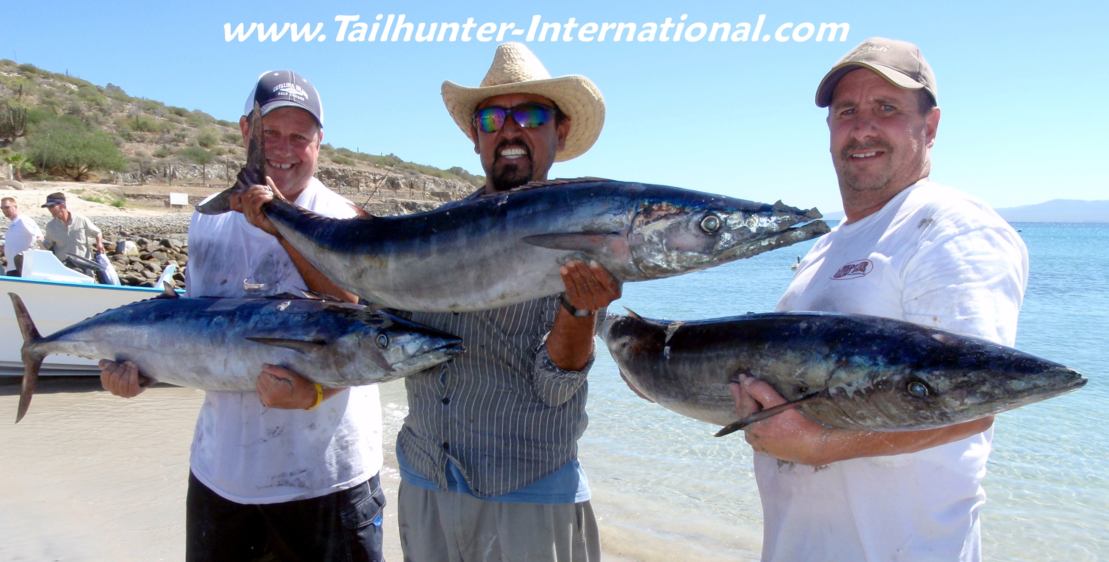Six wahoo in two hours? Chris Cribbs (on the right) from Arcadia CA comes down twice a year to fish with the Tailhunter Fleet and Captain Jorge (middle). He usually doesn't even plan to take home any fish! But this time he brought first timer amigo, Mark Phelps (also from Arcadia on the left) and had to re-think their plan about bringing home fish after getting 6 big wahoo off the south-end of Cerralvo Island. The reason you don't see the 6th fish...a big sealion grabbed the entire wahoo just before they were about to gaff it and tore it right off. They were using dark Rapalas slow trolled behind the boat.