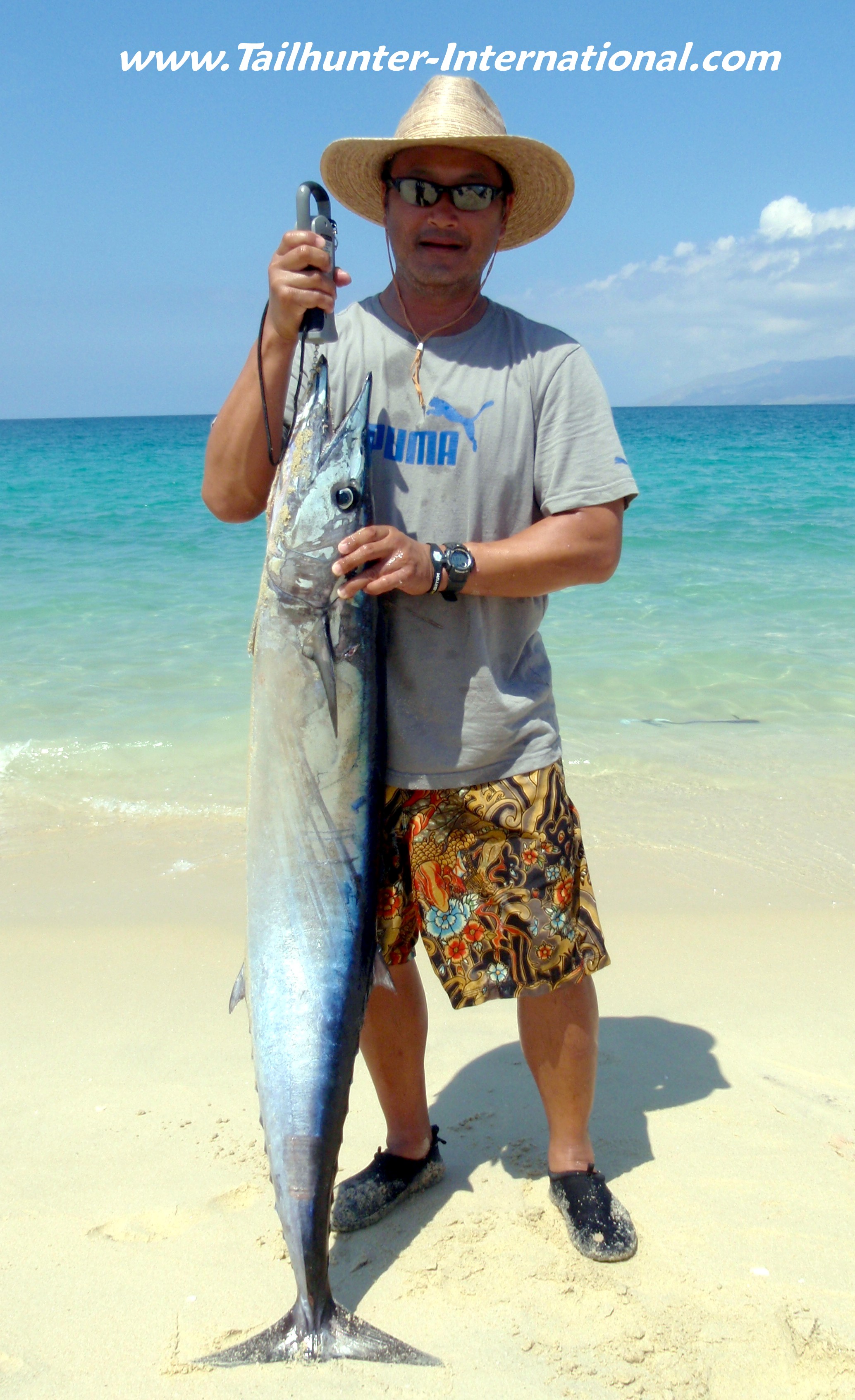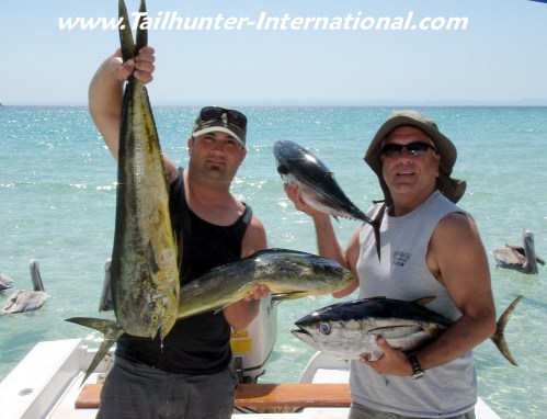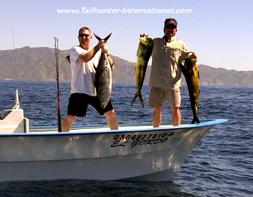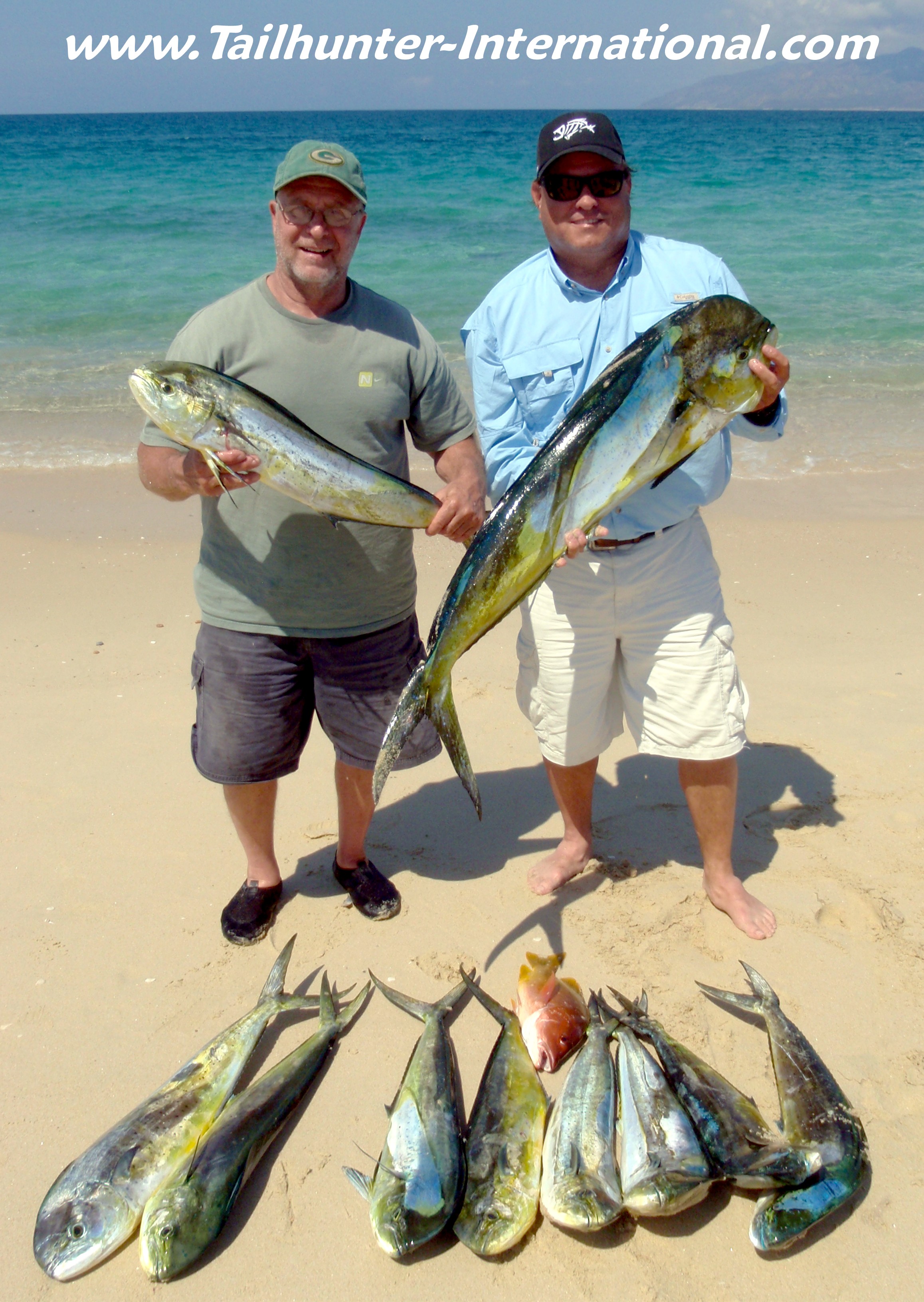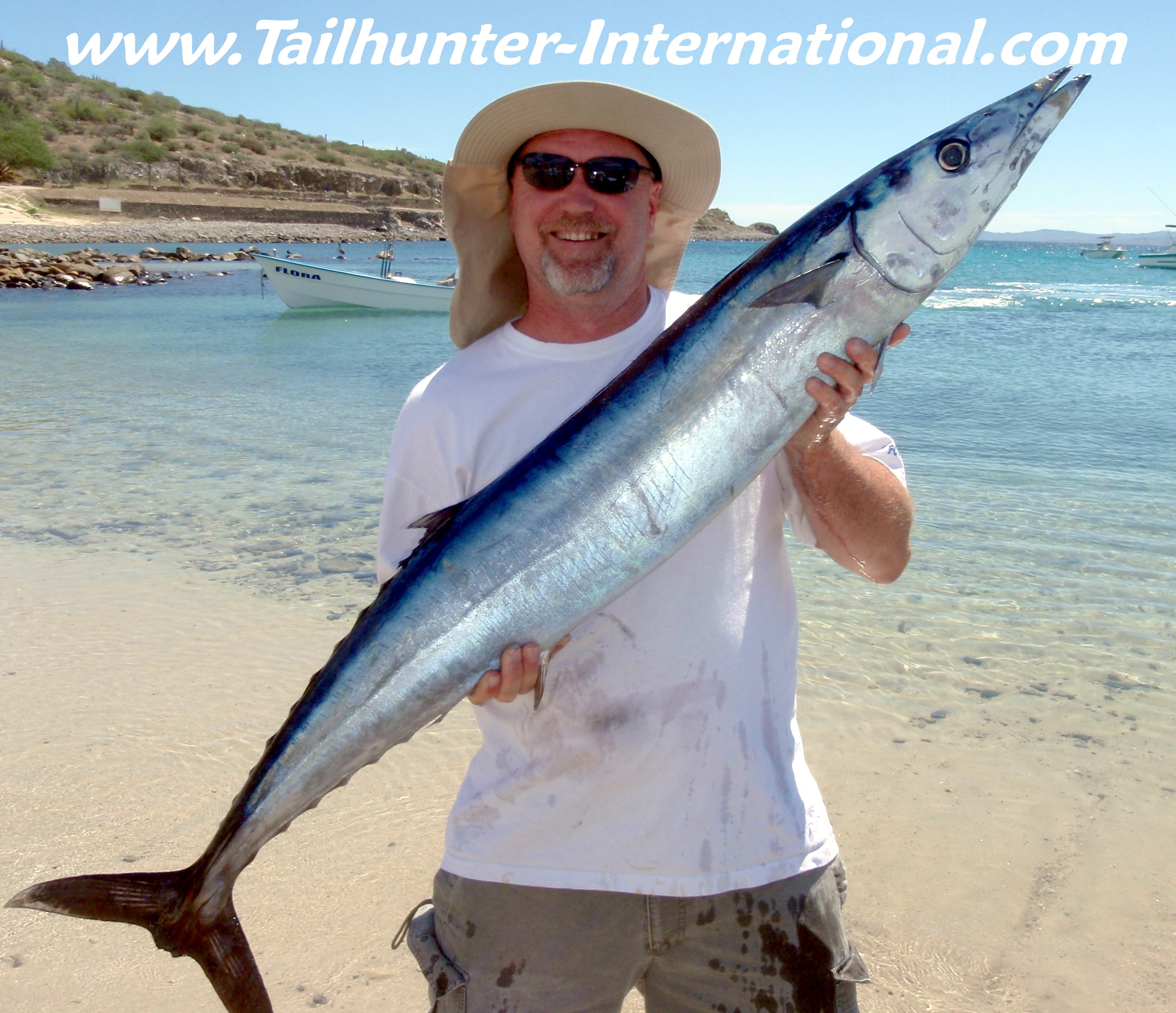 Six wahoo in two hours? Chris Cribbs (on the right) from Arcadia CA comes down twice a year to fish with the Tailhunter Fleet and Captain Jorge (middle). He usually doesn't even plan to take home any fish! But this time he brought first timer amigo, Mark Phelps (also from Arcadia on the left) and had to re-think their plan about bringing home fish after getting 6 big wahoo off the south-end of Cerralvo Island. The reason you don't see the 6th fish...a big sealion grabbed the entire wahoo just before they were about to gaff it and tore it right off. They were using dark Rapalas slow trolled behind the boat.