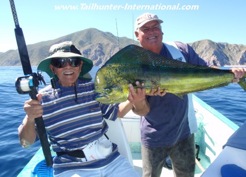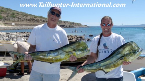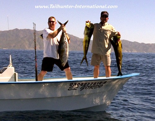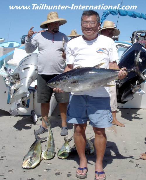 Fresh ones! Bakersfield in the house! Ken Gragg holds up a couple of his dorado and Maxx Garris fins a nice yellowfin tuna.