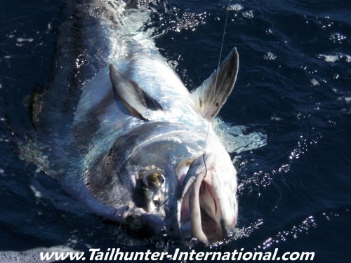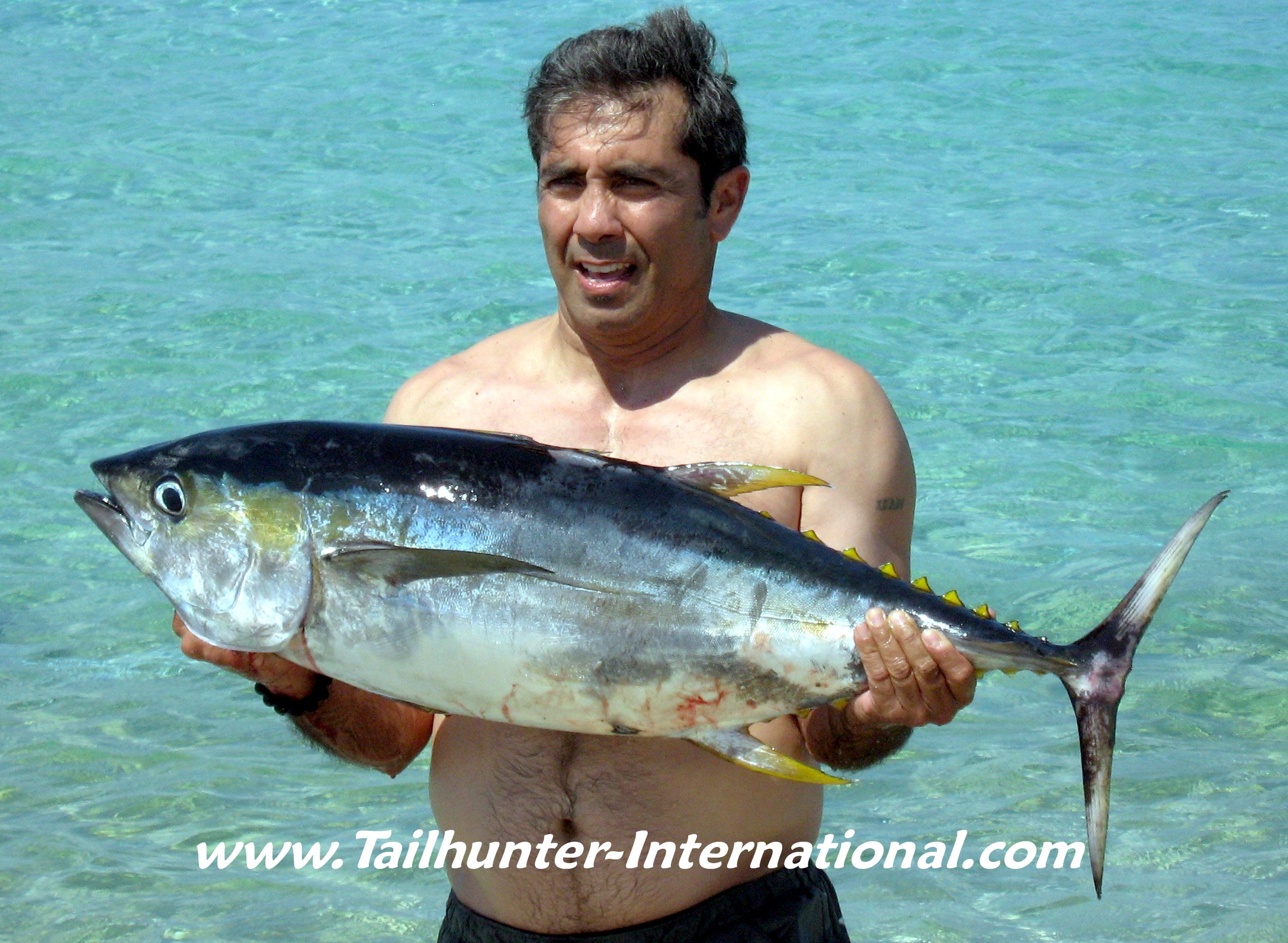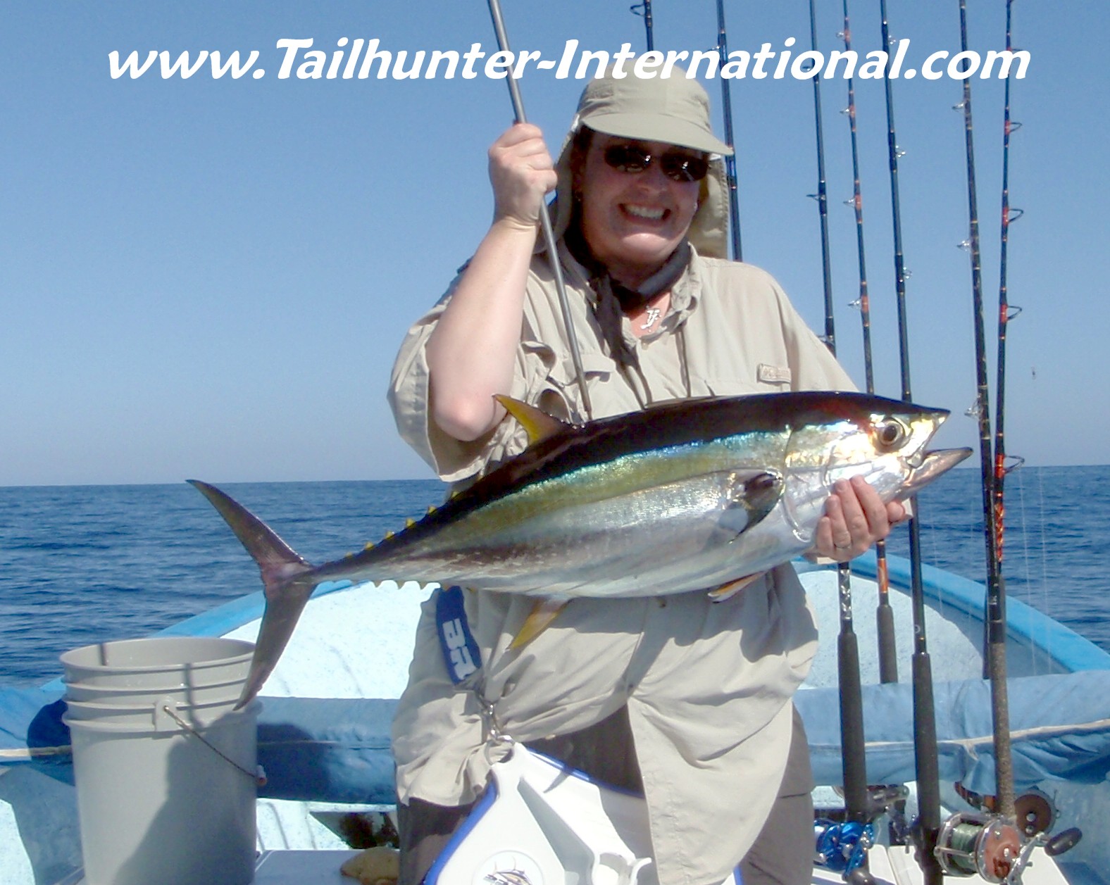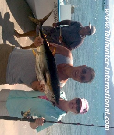 Yea...my windblown lifeguard hat looks stupid, but even I got into the bite this week. During a slow period, I started throwing a blue/chrome heavy iron on 30 pound test just to pass the time on some kick-butt bonito and see what I could generate to get the bite turned on again. I saw some big shapes cross under the boat and let fly about a short 30 yards. I let it sink then started a fast-retrieve yo-yo action and WHAM! The rod went double bendo and I knew it wasn't a bonito! It turned into this nice fast yellowfin tuna! The jig is still hanging below the fish. I think it was a Tady or Sumo iron. Maybe a AA. Not sure. I just grabbed something shiny out've the tackle box really fast. Jigging is a good way to get fish going that are hunkering down deep that might not want to come up on the surface to eat bait. Many avid jig fishermen will tell you that the fast-moving jig often gets the largest fish of the day. You may not catch the most, but you often catch the larger fish.