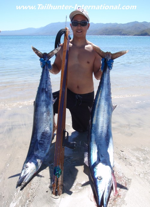 Corey Fujita from Los Angeles got in the water off Las Arenas for a little freediving spearfishing. He had no idea what he was in for but said "the wahoo were so thick!" He nailed two of the big fish...his first time getting wahoo...and said he could have gotten more but missed 4 other shots! Check out the photos below! Spearfishing in Mexico is real "diving" as not air tanks are allowed. This is real X-sport stuff. Imagine shooting a fish that can take off in bursts of 70 mph (fastest fish in the ocean!) and all you have is a single breath of air. Freedivers are incredible athletes. Corey is also a dentist too!