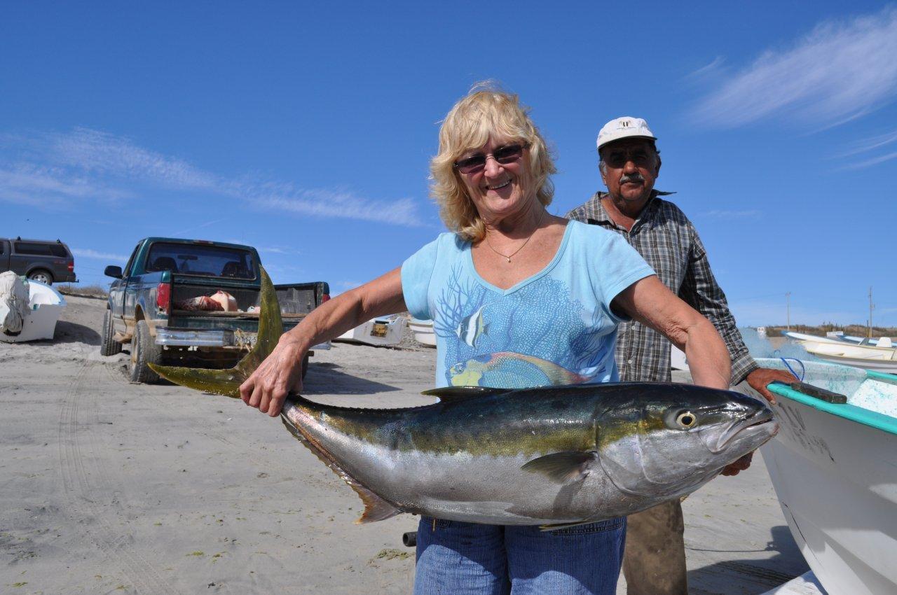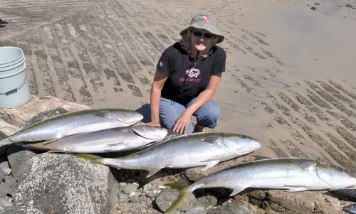 Lately, Donna Thomspson has been making a habit of outfishing her husband, Roger. Here she's showing off a great quad of big yellowtail that have been "on the chew" all week, especially for our Las Arenas/ Muertos Bay anglers.