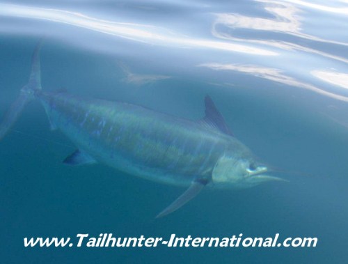 - As the waters got warmer we had alot of billfish (sailfish and striped marlin) show up. As one person described it…”there were dozens and dozens just sitting on the surface.” Many weren’t willing to bite having gorged themselves during the full moon, but we did get some biters like this one that Rich Jones holds…his first striper and among three that he and his partner, Ron Hepner, hooked but got released. Rich got this one on 40 pound test and swallowed the hook.
