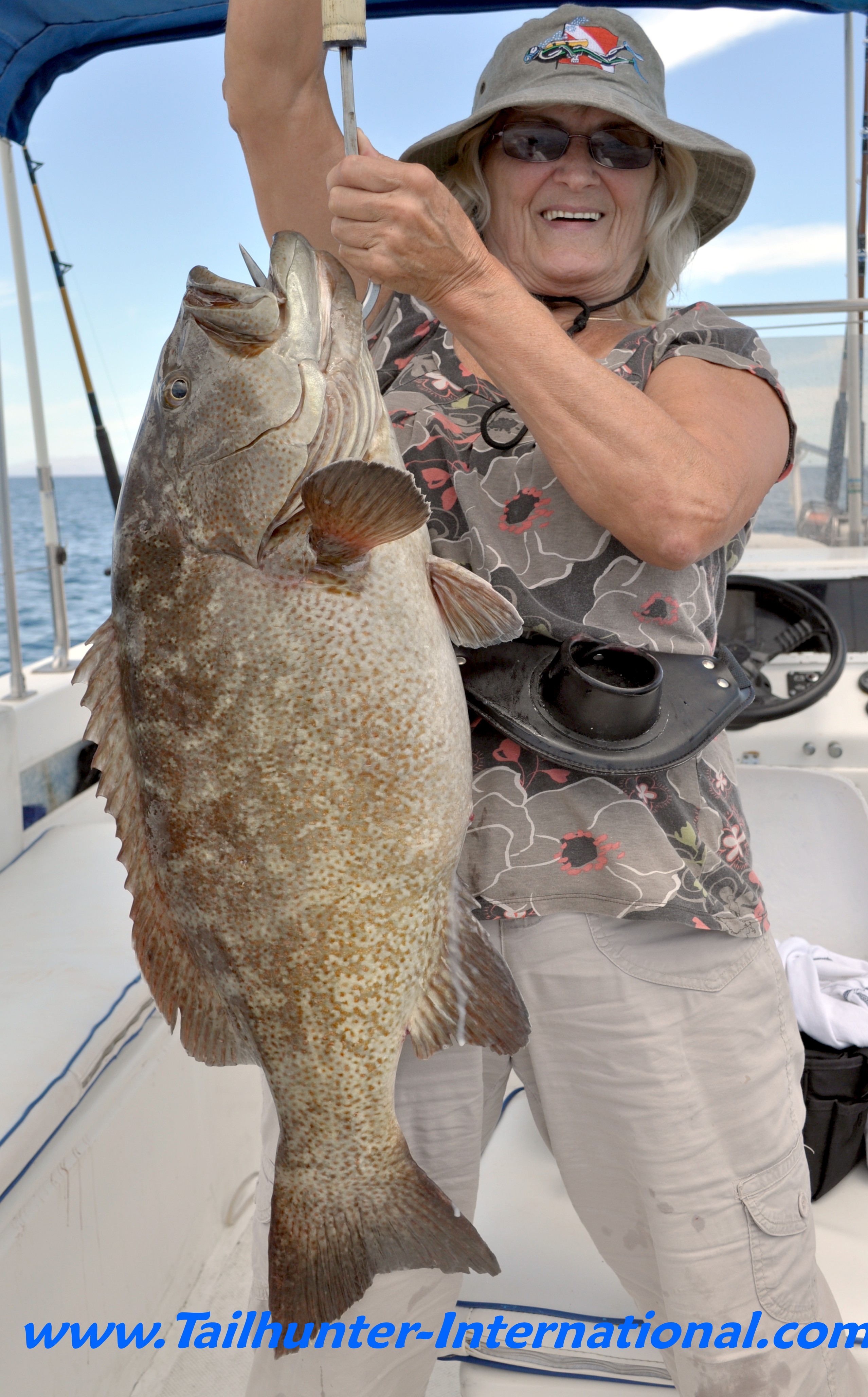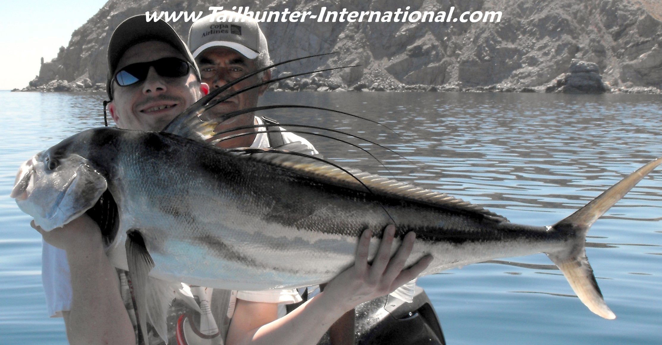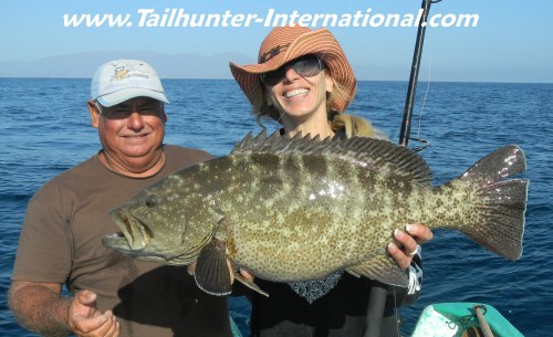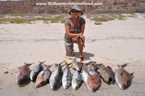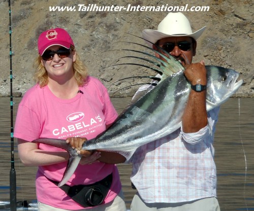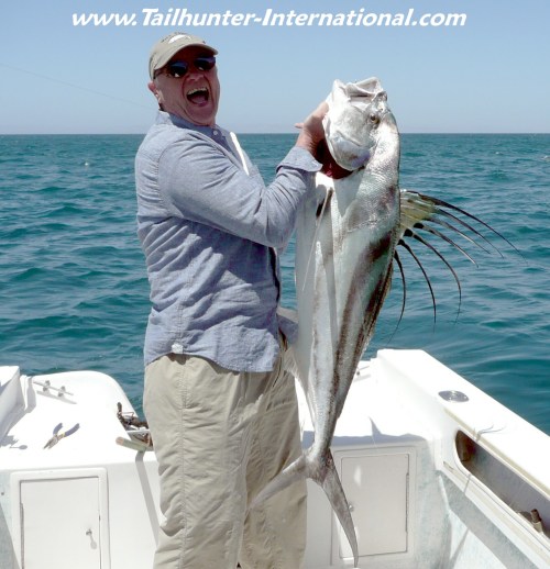 The roosters were biting for BOTH our Tailhunter La Paz and Tailhunter Las Arenas fleets. Captain Jorge with our Las Arenas fleet helps Marsha Schearer pose with this slug rooster caught in shallow water just outside Bahia de Los Muertos.