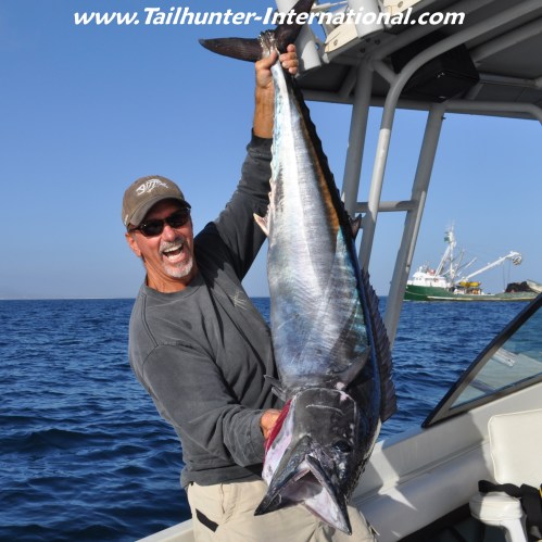 Wahoooo! We finally got one to the boat. For weeks, I've been saying the conditions are right and Roger Thompson finally nailed one on a rapala at the north end of Cerralvo Island. He said te day was going slow (note the tuna boat in the back!) but he usually comes through and this 60 pound class speedster topped the day!