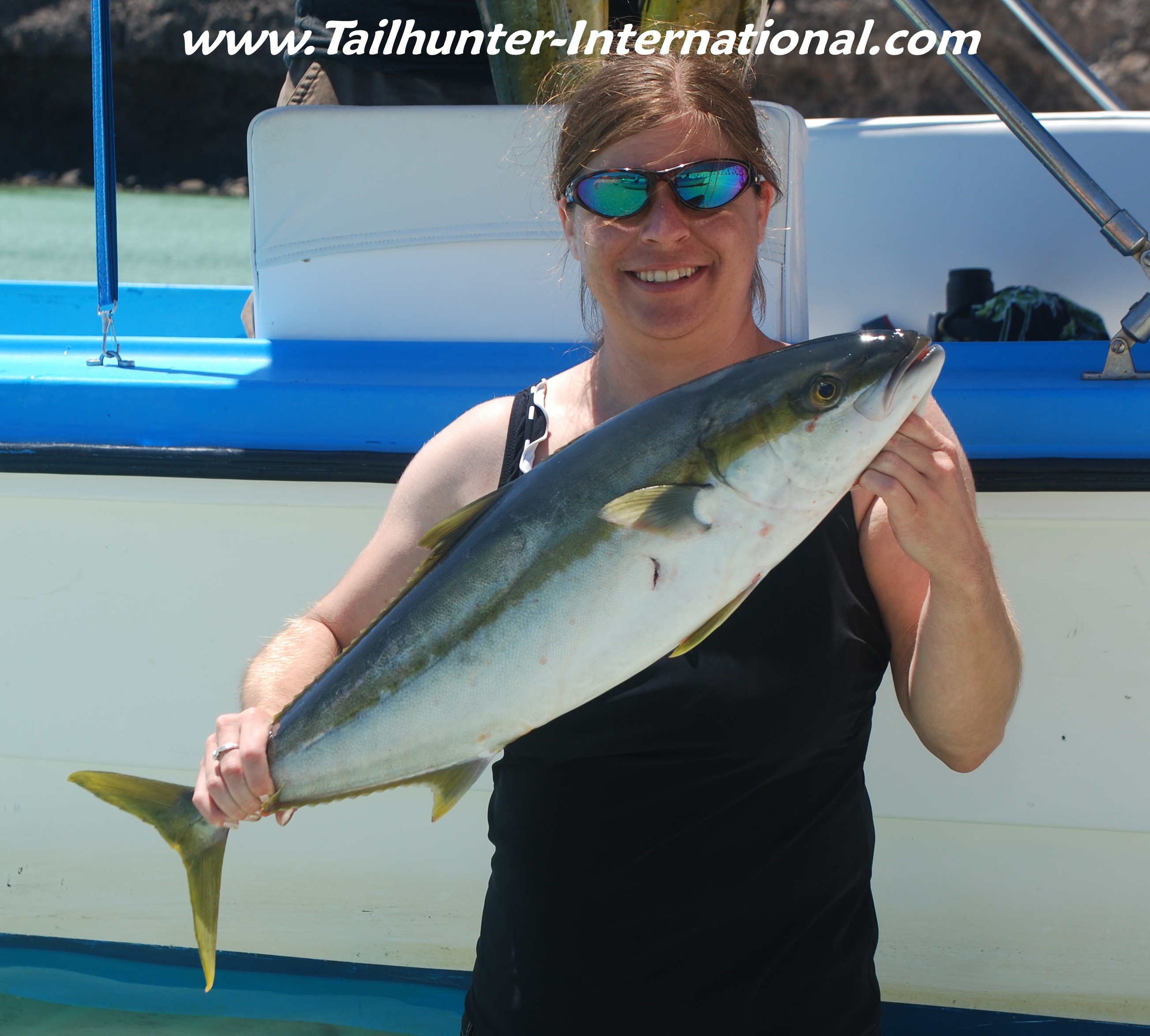 Even tho' waters kicked into "summer mode," there were still some "cooler water" fish around like this decent yellowtail held by Lisa Chandler of La Mesa CA. We actually took a few of these YT's this week.
