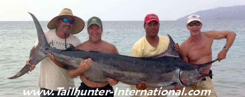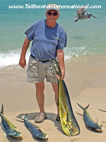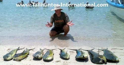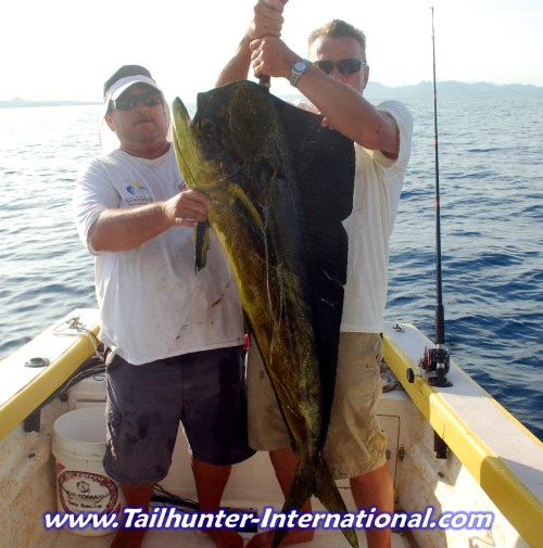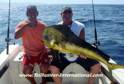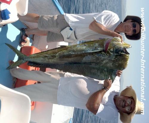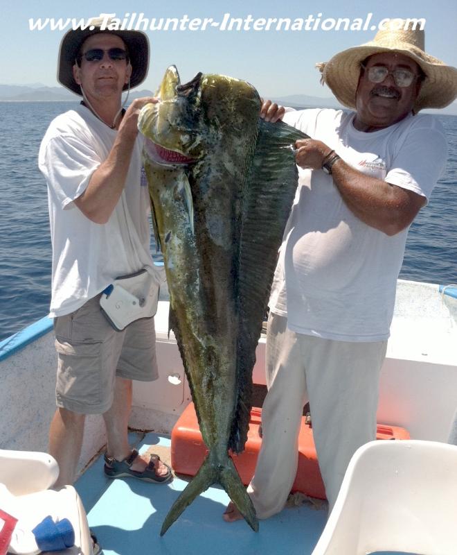 Our amigo, Ken Gragg, has made three trips to fish with us this year...and the year's not done yet! He's given a hand here by Captain Victor to hoist up a big-boy bull dorado estimated at about 45-pounds.