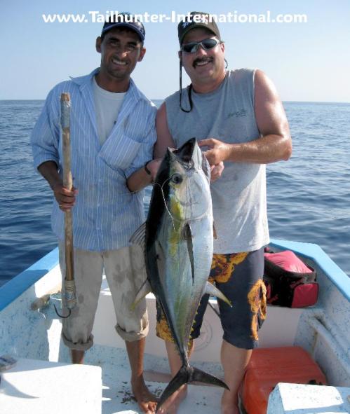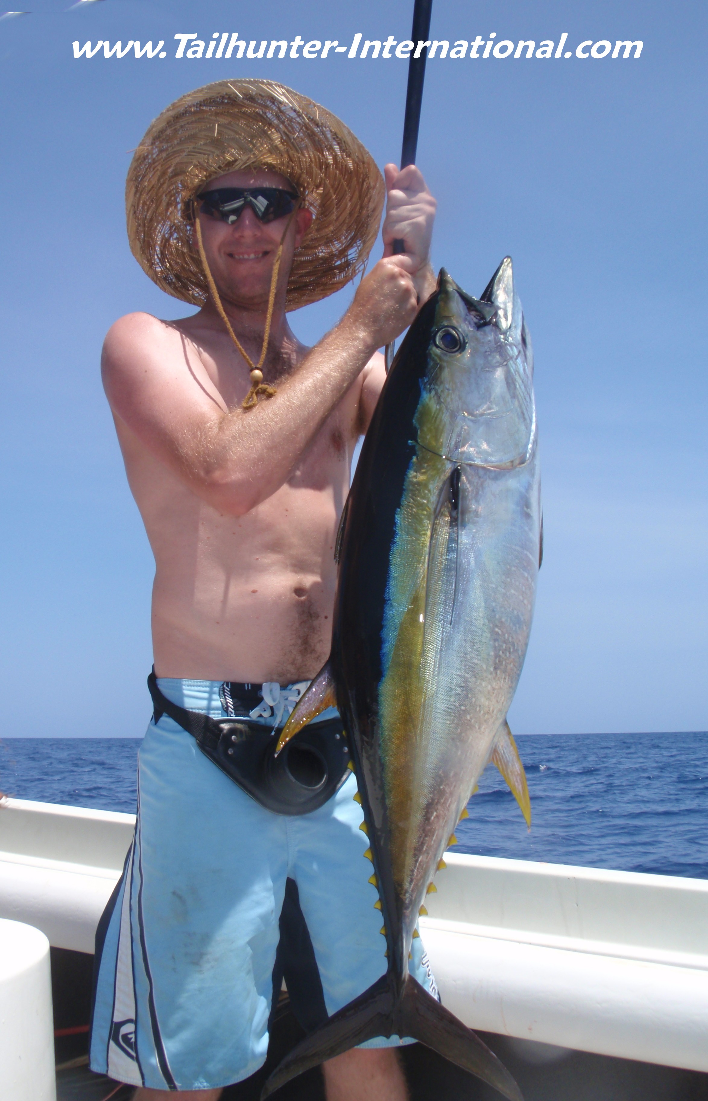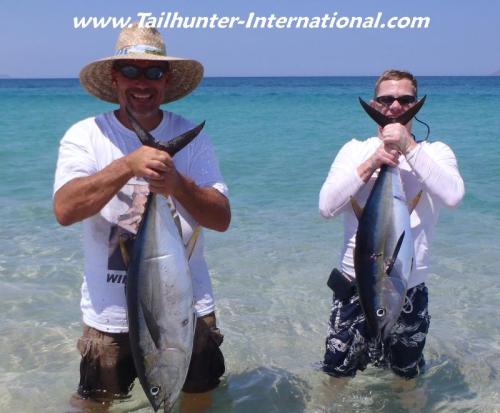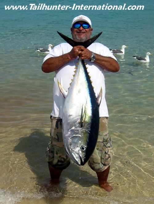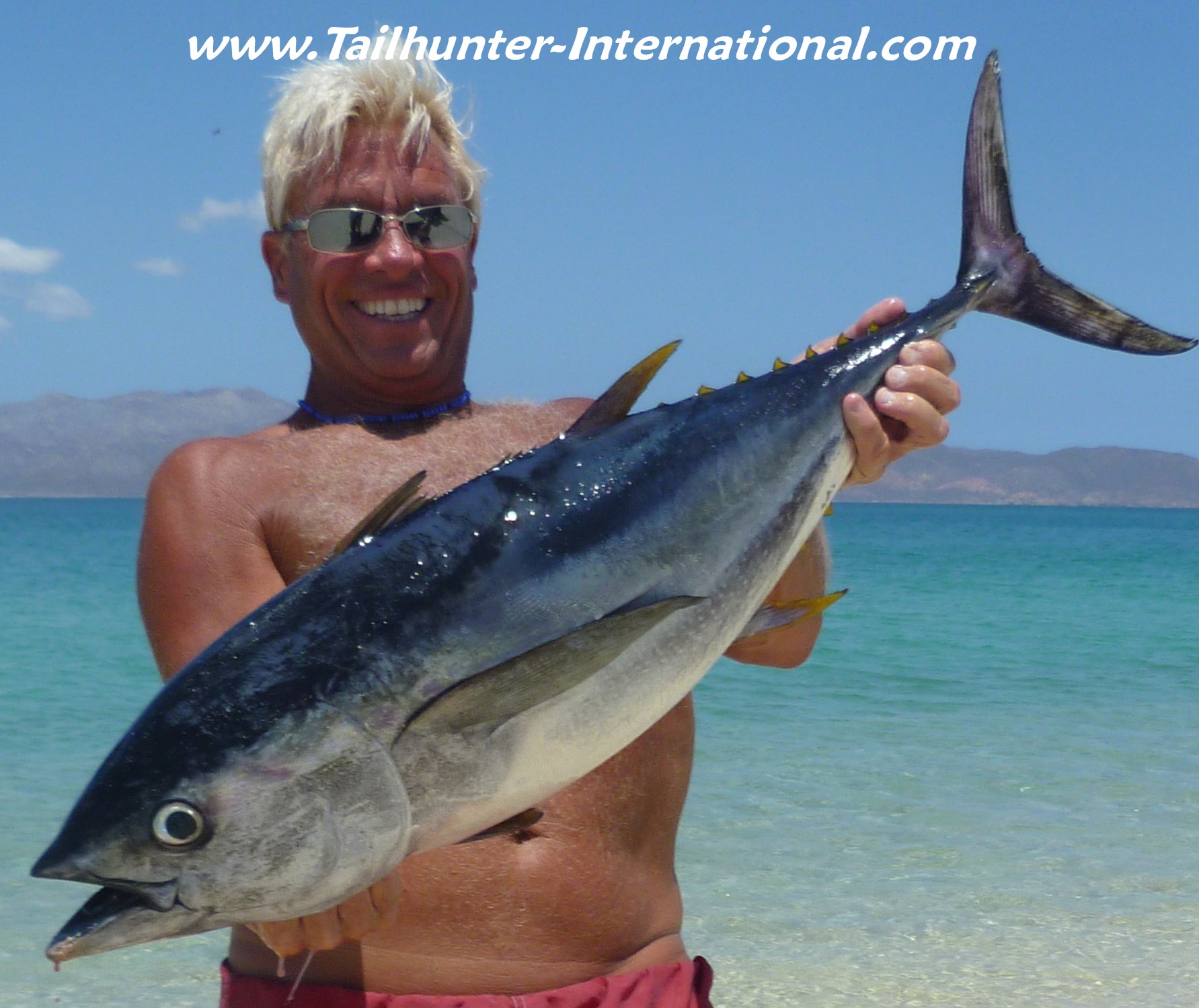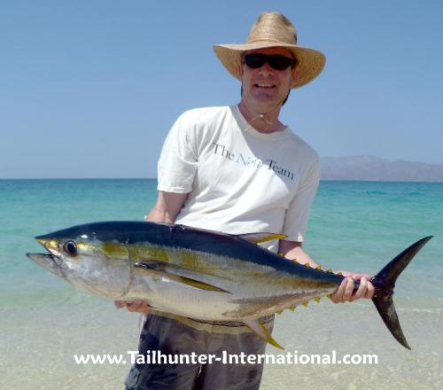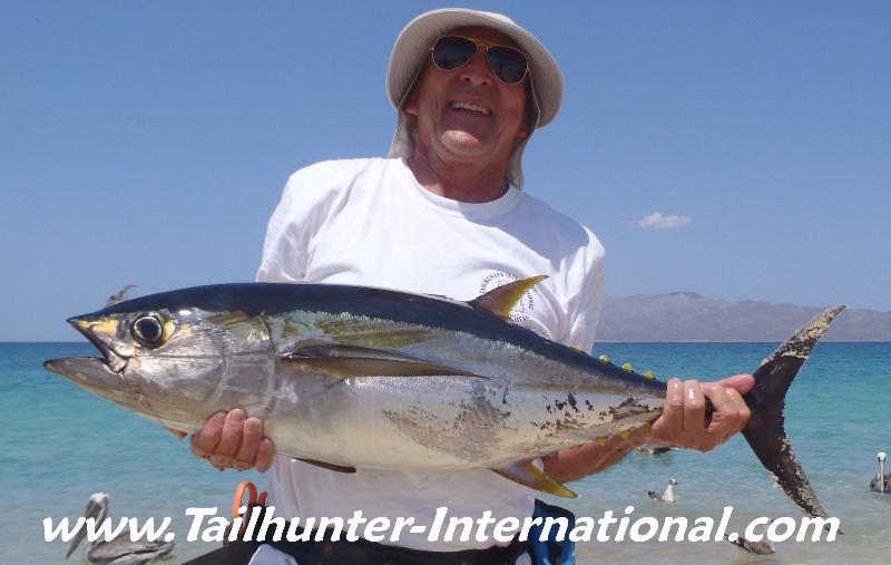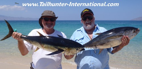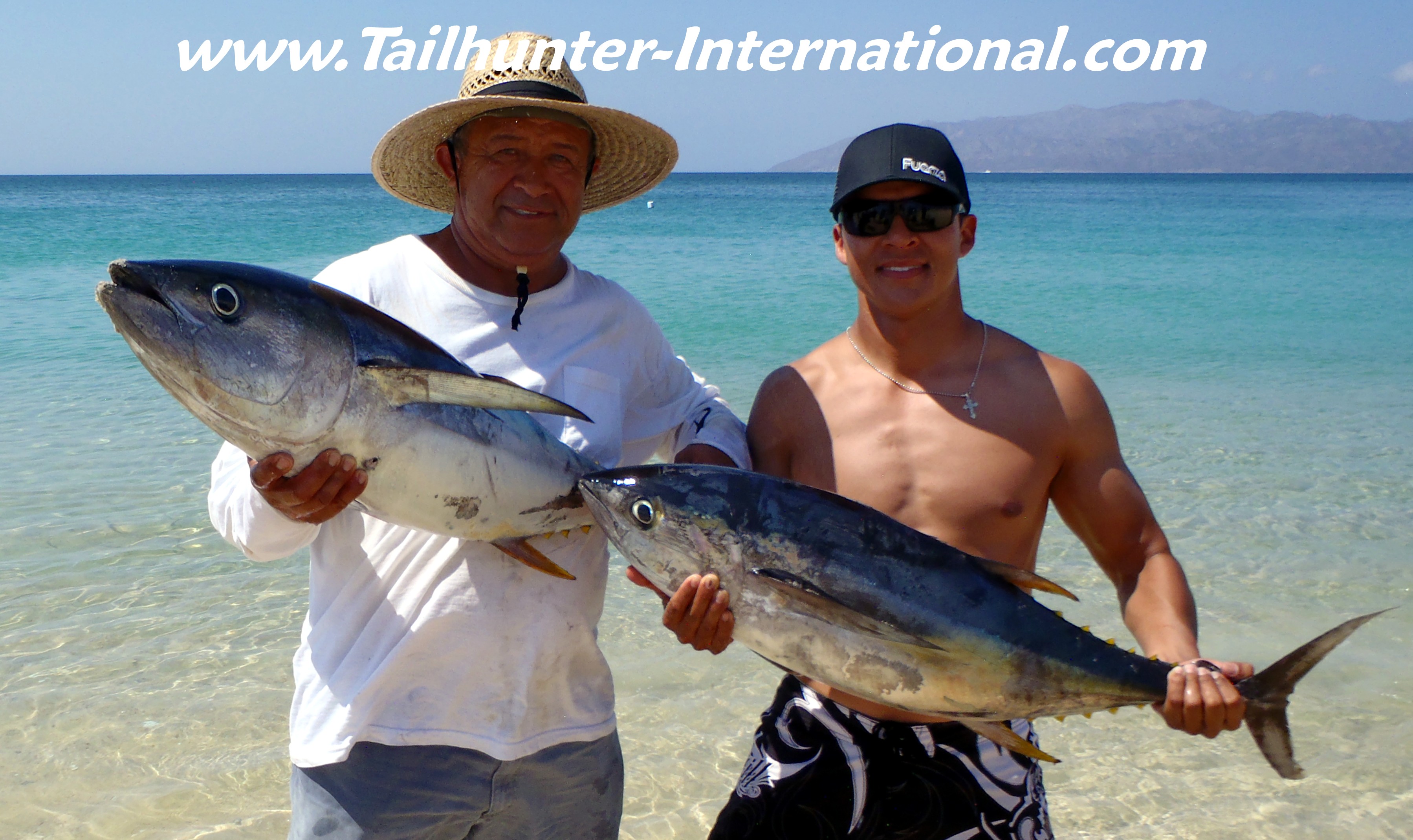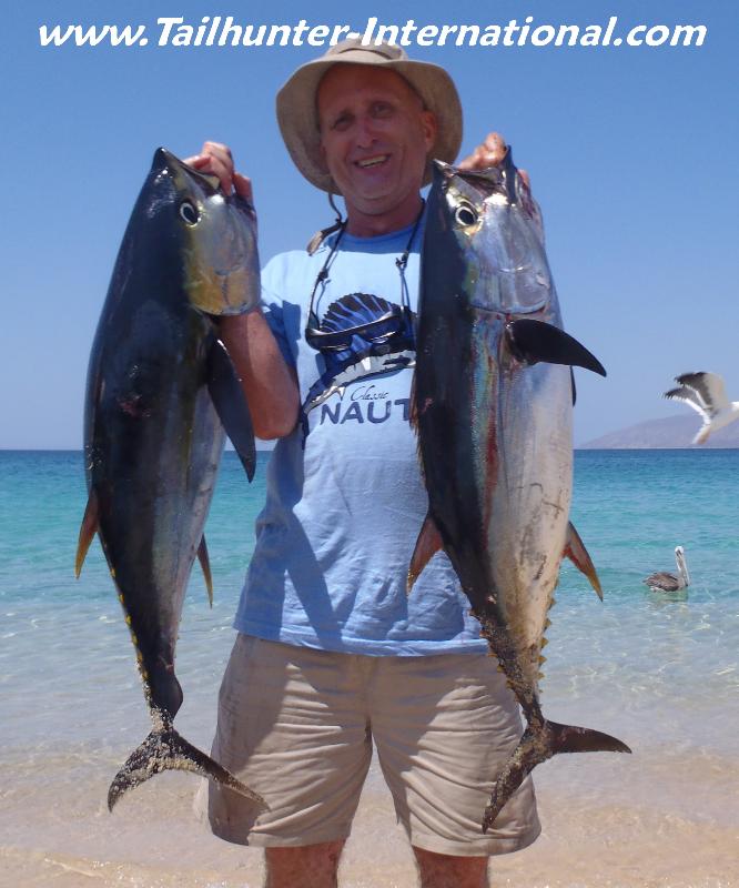 First timer to La Paz, Bob Chadwick holds up a couple of his nice tuna typical of the fish we were getting this week with our Tailhunter Las Arenas flight. While not crazy biting, the fish were definitely "on-the-chew" better than the week before when a full moon seemed to keep the bite down. Bob's biggest fish here weighed 38 pounds.