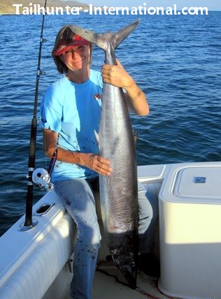 Again, it's pretty late to see wahoo pop into the counts, but after waiting all year for wahoo in what has been one of the poorest wahoo season in many years, a few of the big skinnies were taken sporadically off the north and south end of Cerralvo Island. Fishermen in the areas said it wasn't consistent and if you go there be ready for some possibly rough water and wind as both areas take currents from all directions which can be exacerbated if the winds are blowing. As one of our anglers said, "We were soaking wet, but it was worth it to finally get a wahoo." Our amiga, Sue Paul, holds up one that she took at north point.