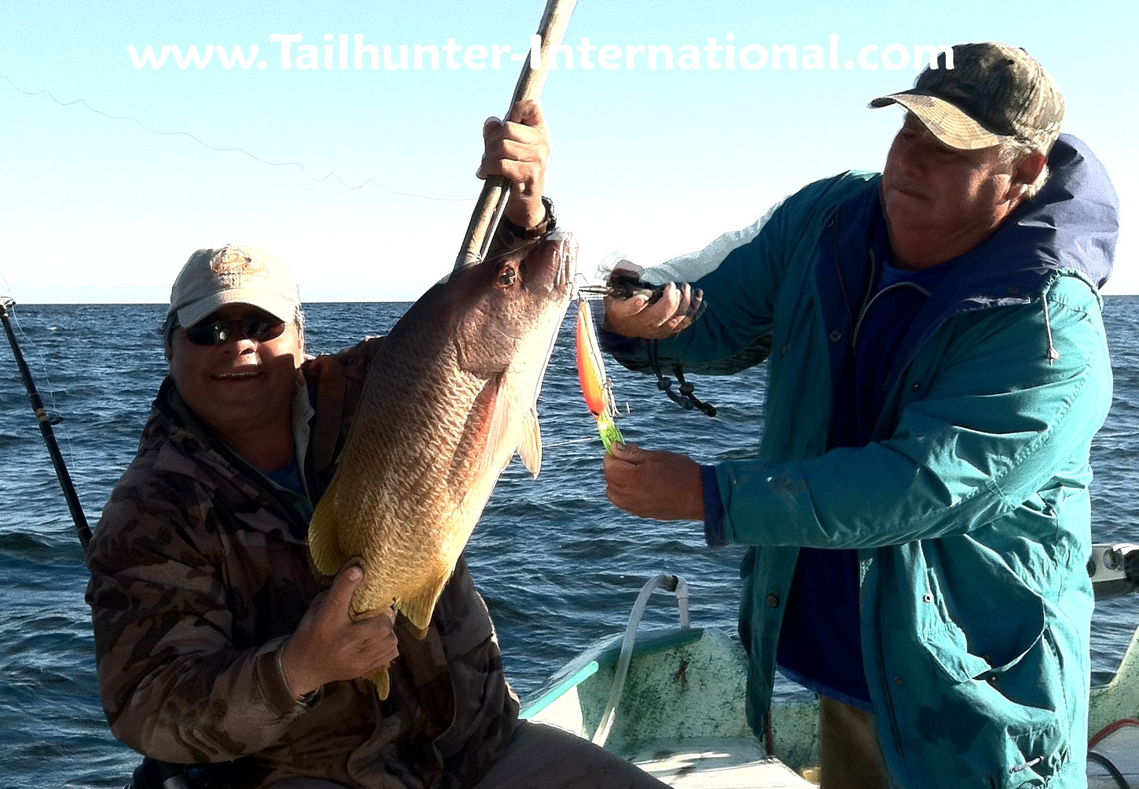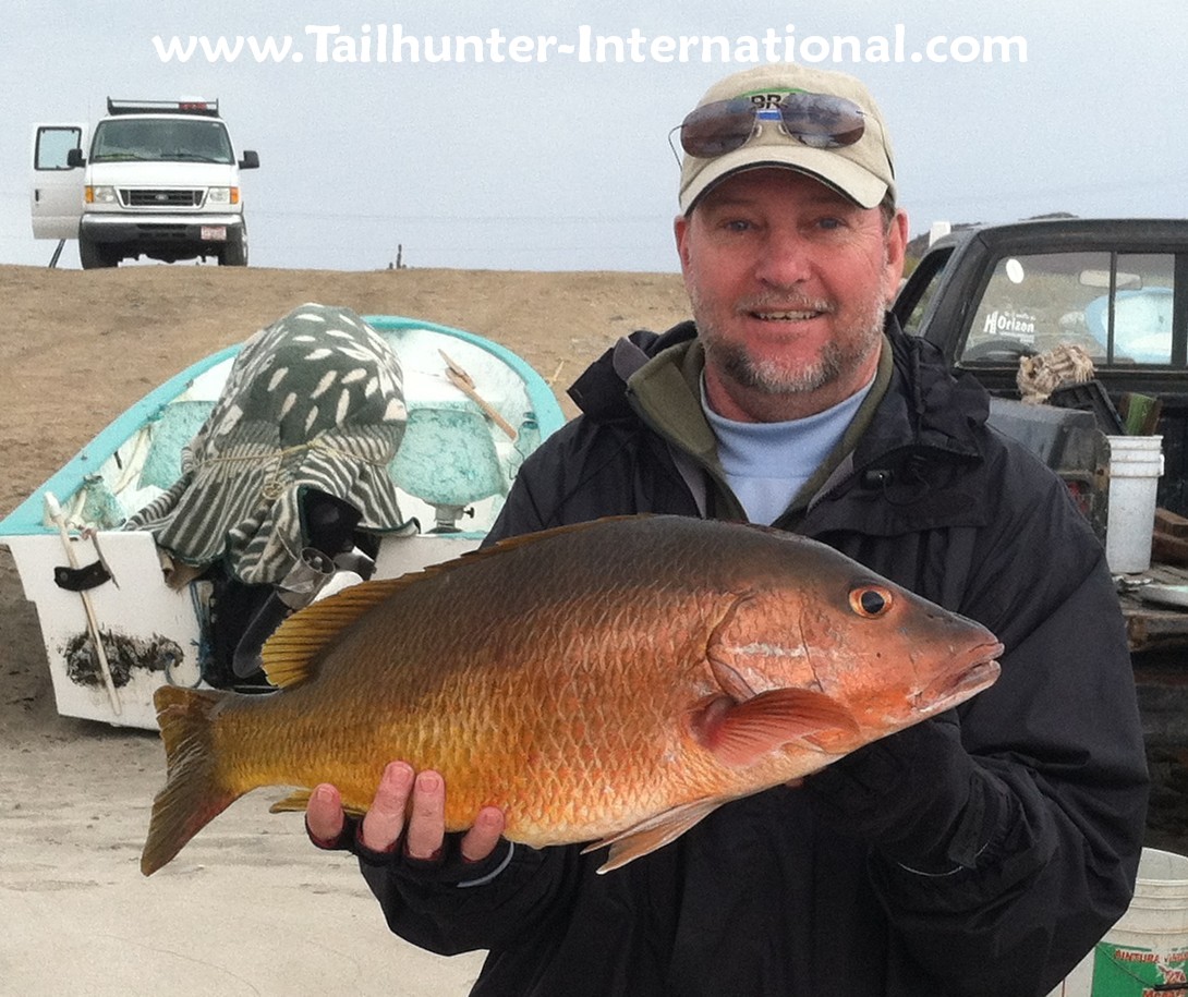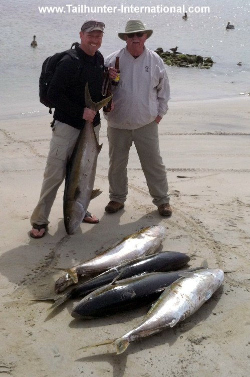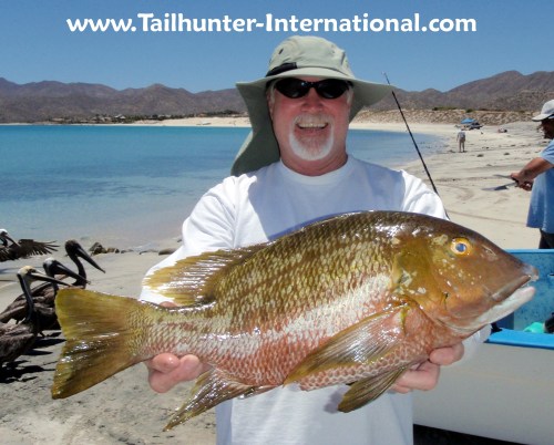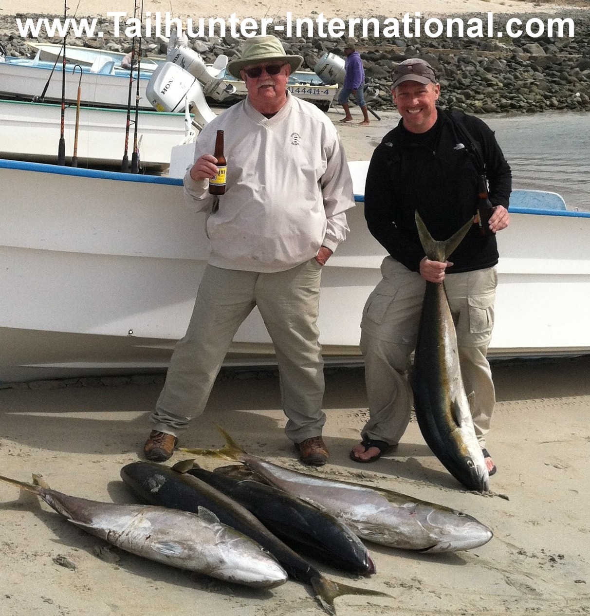 Typical of this time of year, pargo like this trophy barred pargo (pargo mulato) that Stacy is holding here at Muertos Beach are good targets. Again, these guys are in the rocks but attack the baits ferociously with a big set of teeth and powerful shoulders. The pargo were really hot for the guys using ballyoo as live bait slow slow slow trolled over the reefs.