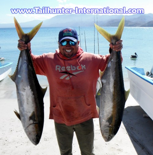 Big yellowtail were again the focus and highlights of the week with good actions just offshore close to the beaches and rocks. This big fat yellowtail is so thick, it almost looks like a yellowfin tuna! Jerry Clark from Kansas City poses on the beach at Bahia de Los Muertos. Our pangas this week took 2-4 of these yellowtail per day but lost others to the rocks!