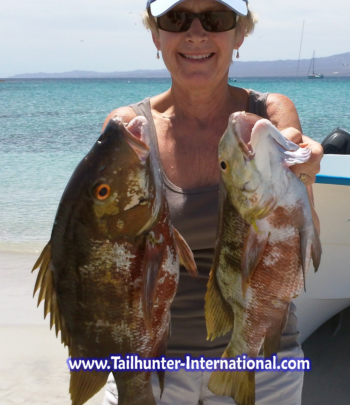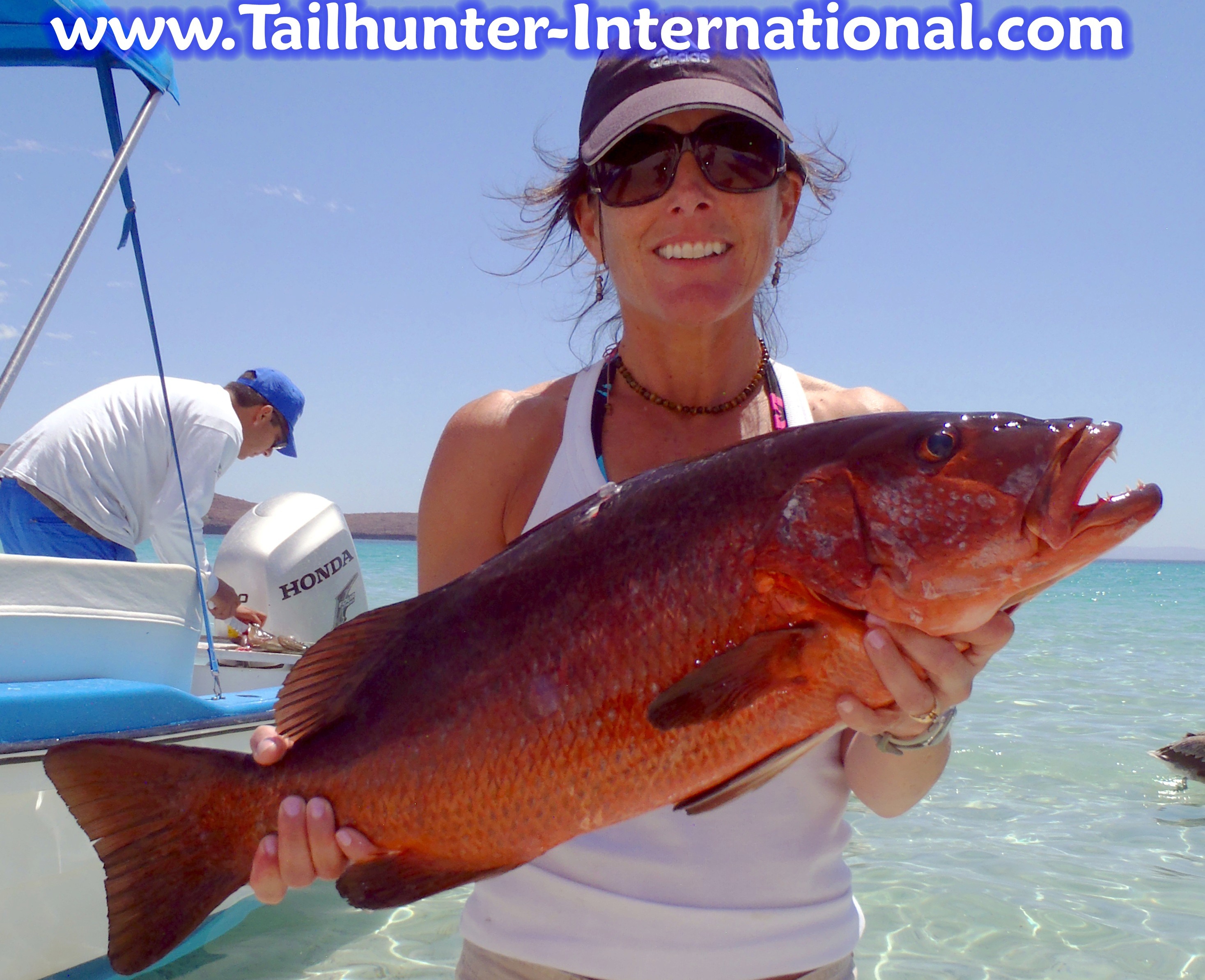 First timer from Oregon, Sheila Maloney, had a big smile for this cubera snapper and a bunch of others she picked up working the east side of Espiritu Santo Island using a combination of sardines and live mackerel.