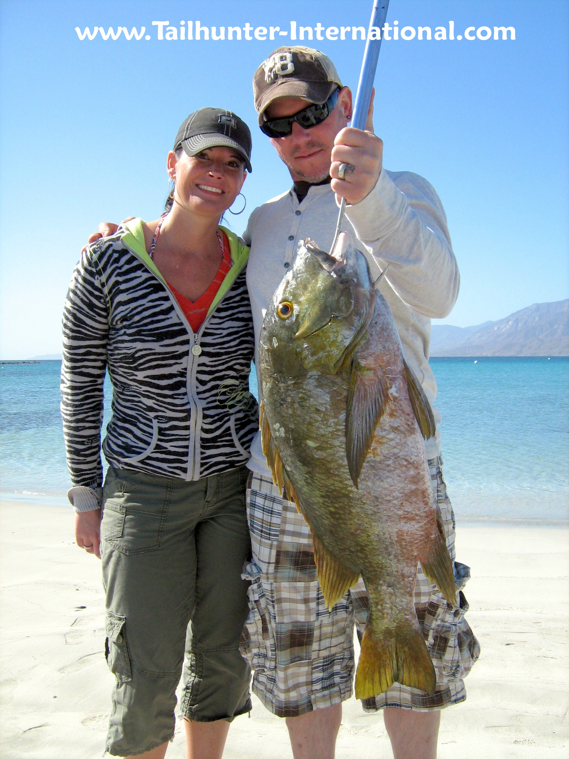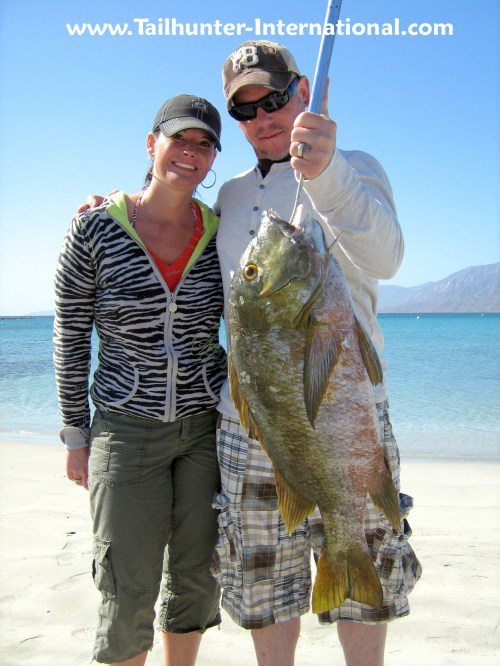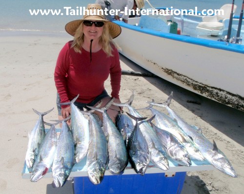 She's the pargo queen! Carol Darby put 7 of these barred pargo in the panga compared to just one for her husband who said "She was on fire!" These are tough fish and this is quite an accomplishment. She stands here on the beach at Muertos Bay.