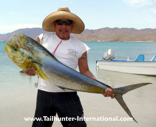 Yes, I do get out now and then and we had our 11th Annual Cabin Fever Classic here in La Paz and it was a blast. This dorado turns out to be the first of the season and quite a big boy for so early in the year! But it was swimming through a school of bonito when we spotted it and threw a live bait and it! A great catch. I'm standing on the beach at Bahia de Los Muertos.