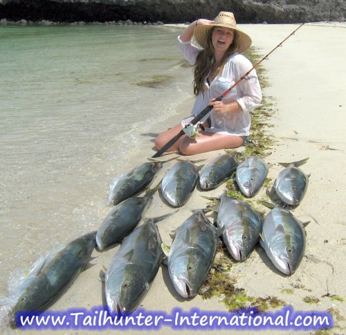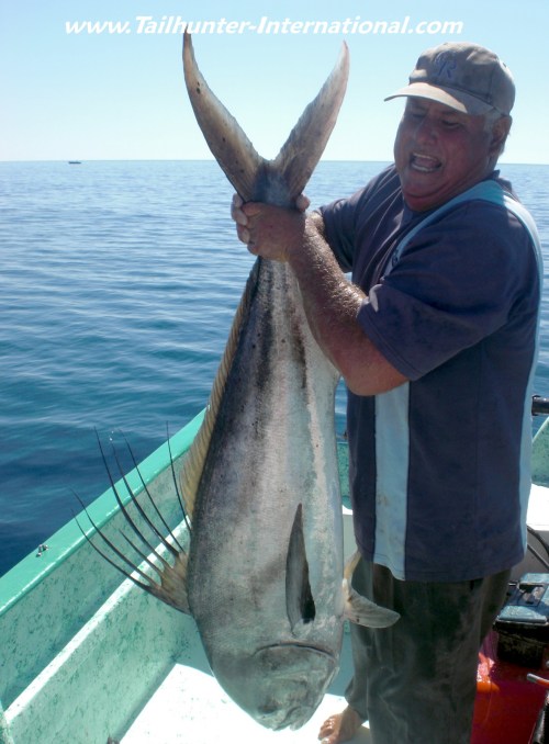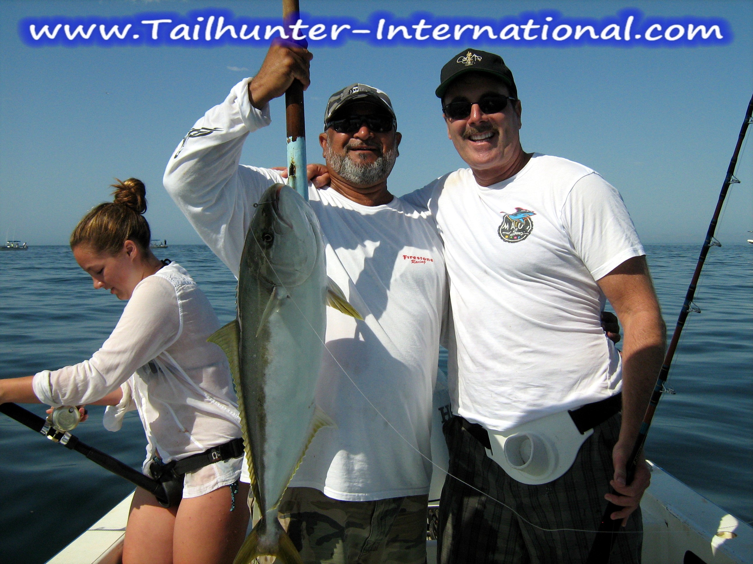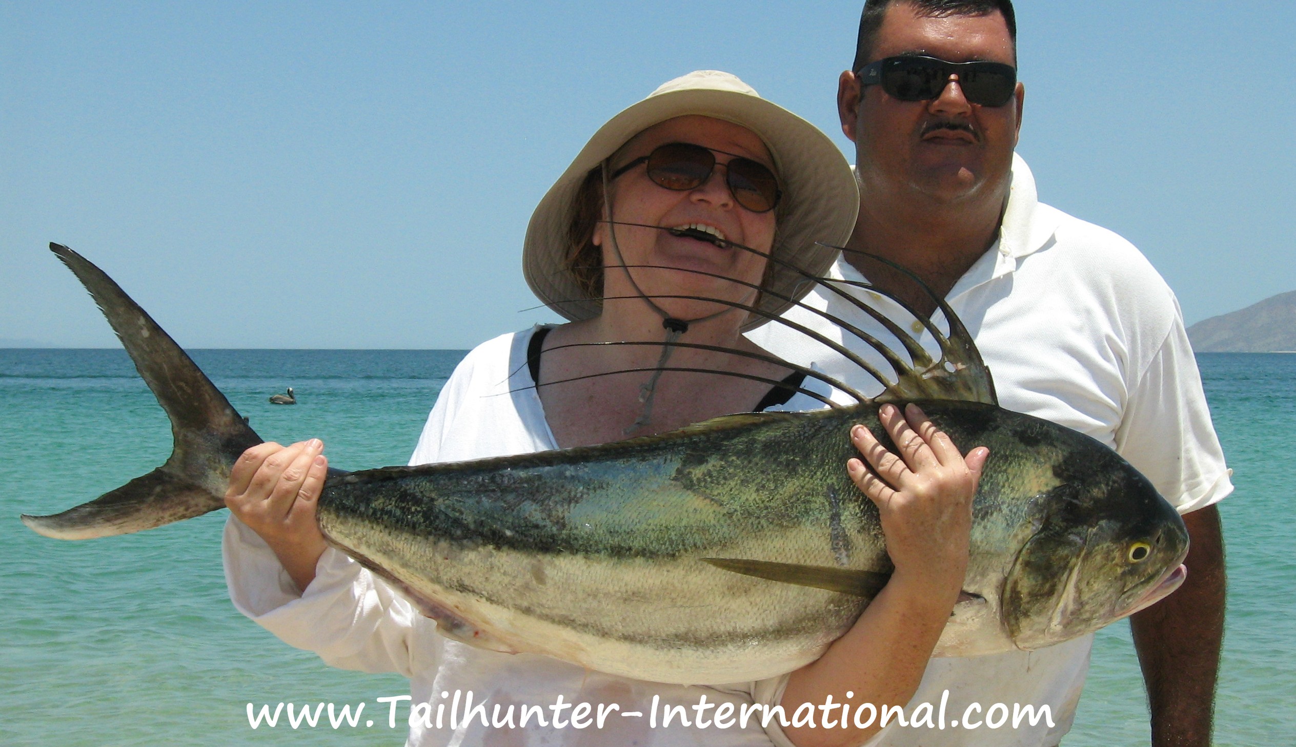 Tbis is Gerda Siewart from Anaheim CA with Captain Gerardo of our Tailhunter Las Arenas Fleet. Gerda had never been fishing before. She was also nervous because she just had surgery last week. But she went out anyway…and had a blast! She says she’s hooked. First day 7 roosterfish. 2nd day 5 roosterfish. 3rd day big yellowtail and cabrilla. 4th day a box full of dorado. She just let the captains fish and said, “Let’s have some fun!” She’s never stopped smiling the whole time! This was the only rooster she couldn’t release.