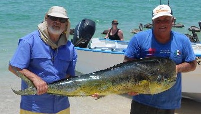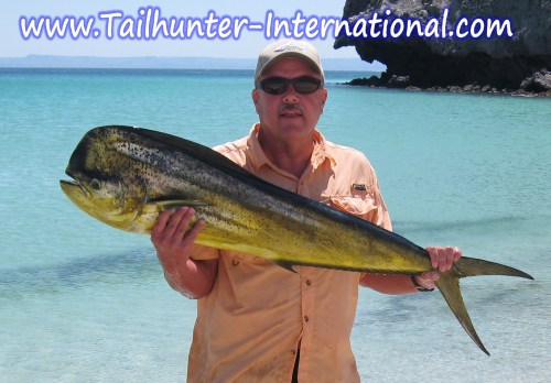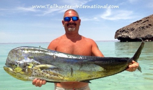 It was another good week to get a trophy-sized dorado, especially if you fished with our La Paz fleet. Solid good dorado fishing pretty much all of this past week, like this bull taken by Brent Fischer and posing at Balandra Beach.