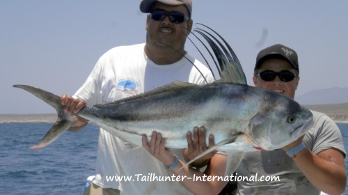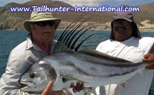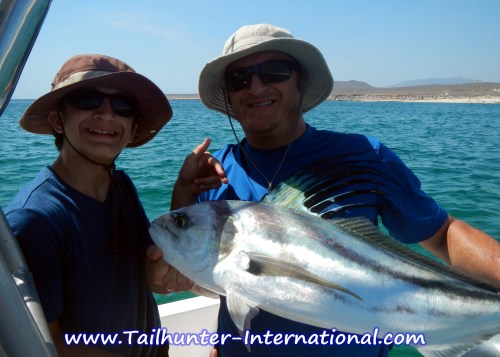 A beast of a roosterfish and the kind of fish that helps give Las Arenas the reputation of being the “roosterfish capital of the world!” John Rygiol gets a hand from Captain Pancho to take a photo of this big boy before they release it. That’s the south end of Cerralvo Island in the background.