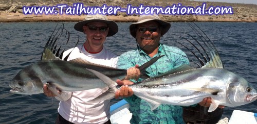 Here’s a pair…and I don’t mean the roosterfish! Darrell George and Bo Herrera are two of our funniest fishermen and fly out from New Mexico several times a year. They post up two of their double-hook-up roosterfish just off the rocks at Punta Perico. They released a week’s worth of roosterfish includingthese two!