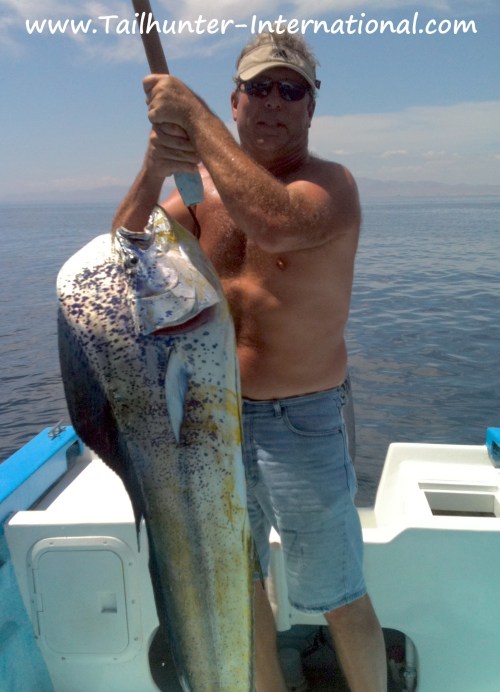 Almost too big to lift! Steve Hanson from New Mexico put the gaff to this huge bull dorado he got on live bait north of La Paz just outside the bay fishing with Captain Marcos.