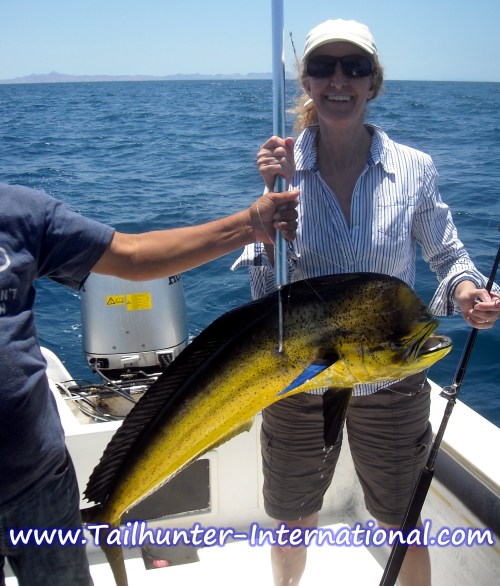 Overall, a really good dorado week, especially for our anglers that fished with our Tailhunter La Paz fleet. Fishing north of the city around Espirito Santo Island then around the tips near Las Cruces and the channel in between Espirito Santo and Cerralvo Island, nice schools of the mahi were being found my locating floating sargasso weeds or bringing schools to the boats by slow-trolling live or dead bait; getting a hook up; then chumming the rest of the school to the panga resulting in multiple hookups.