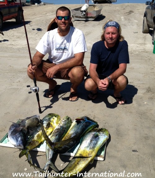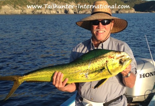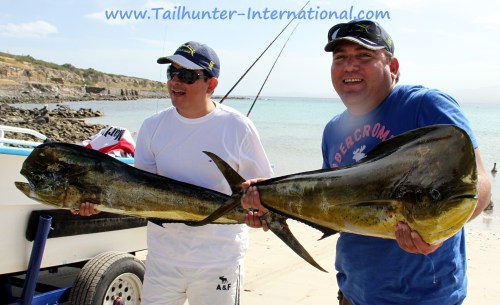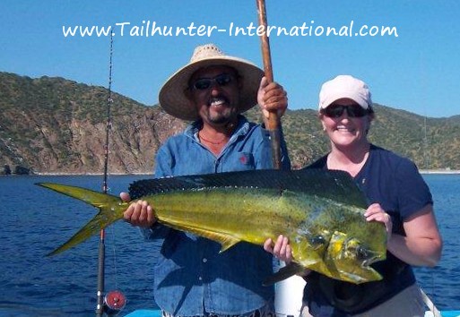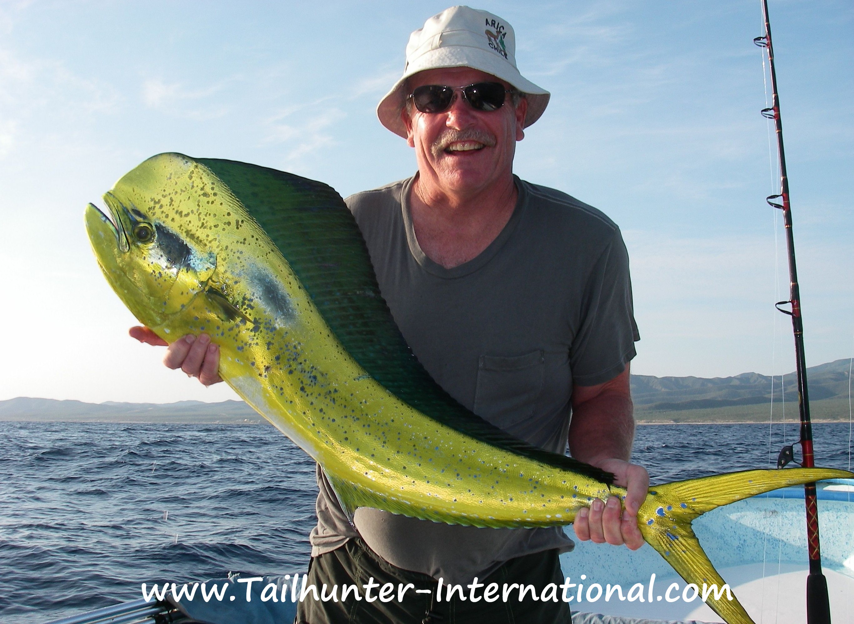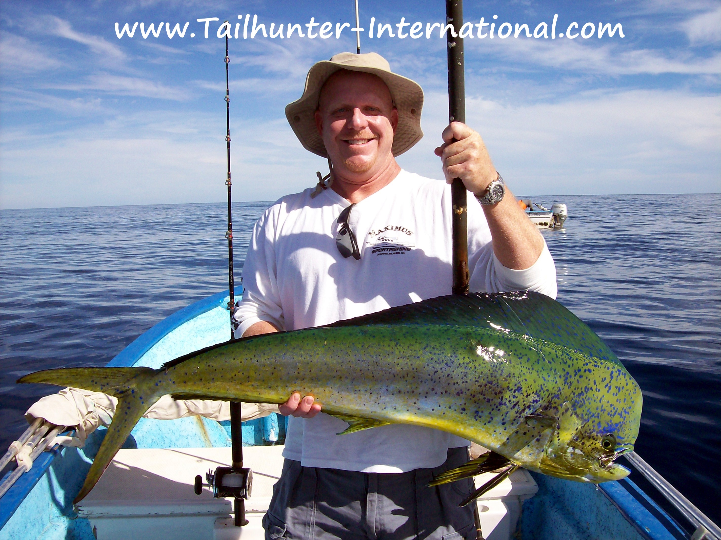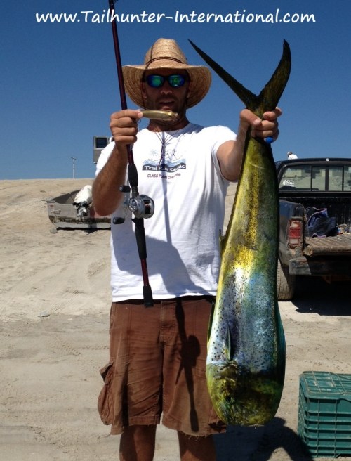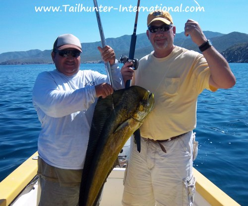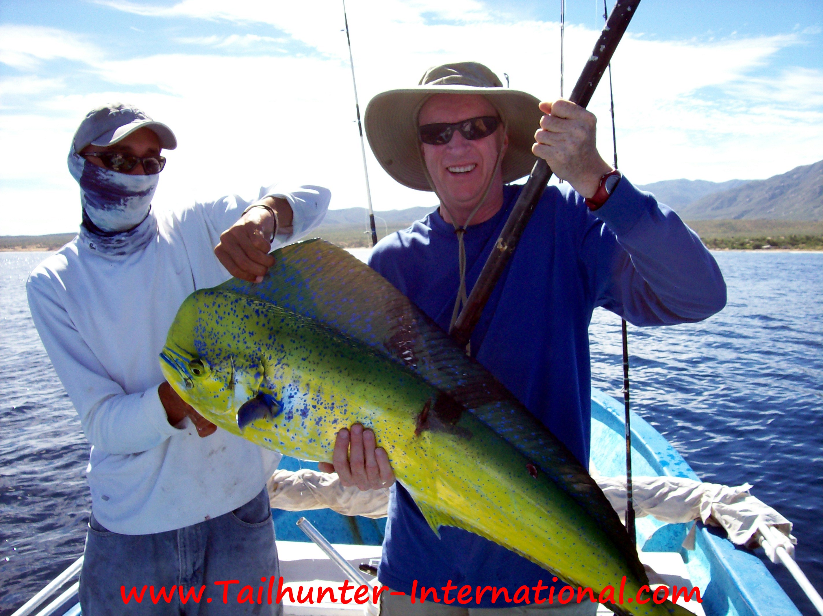Great photo! Dan Neale of La Verne CA holds up a beautiful late-season bull dorado caught just outside of Bahia de Los Muertos on a live sardine. Dan was on his first trip with Tailhunters in La Paz. The dorado are still biting!