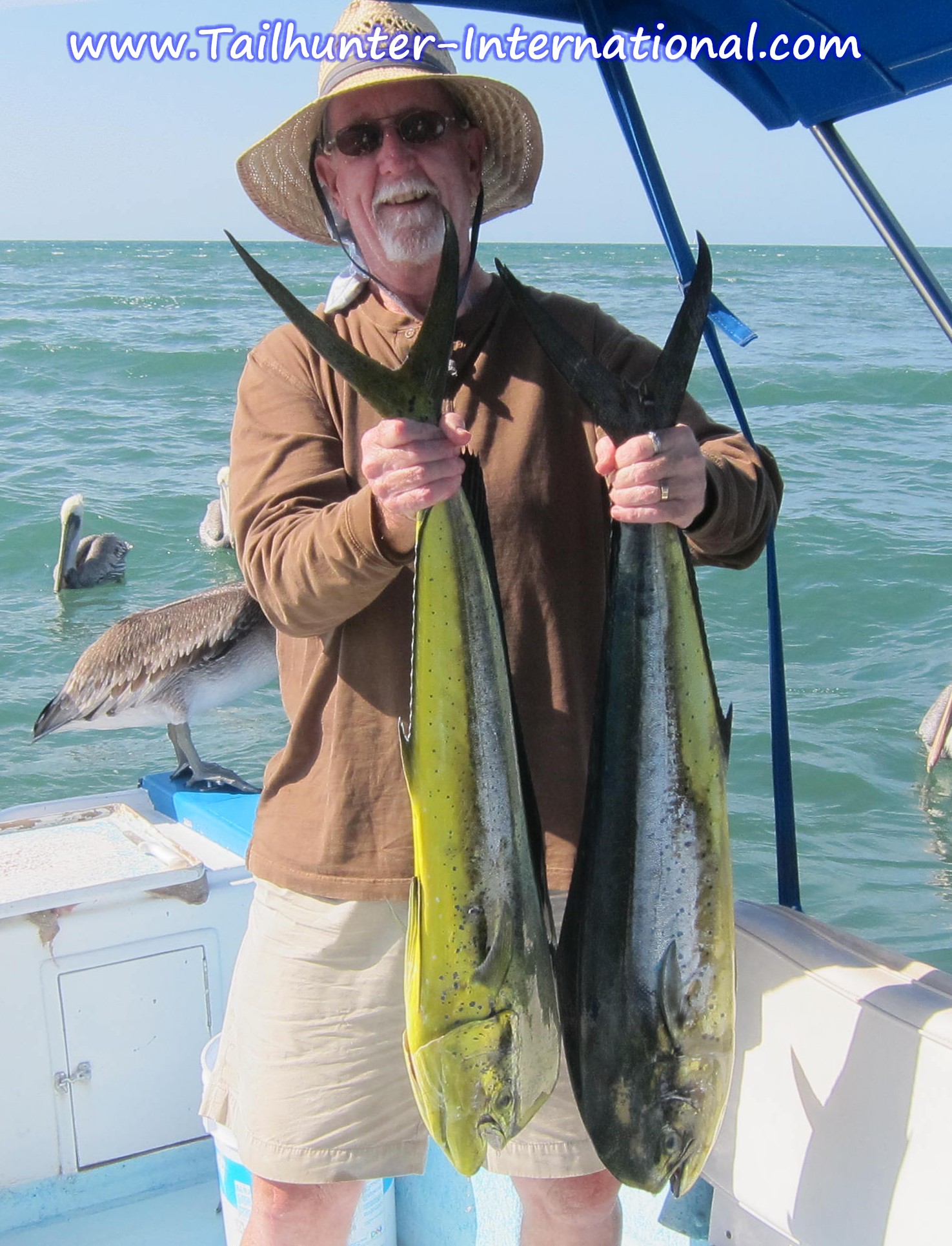 With Captain Pancho all wrapped up (he has an allergy to dust!) he helps out my high school classmate Gary Howarth who poses with another dorado he caught south of La Paz. Don’t know how much longer the dorado will be around, but they’re a welcome catch right now with the seasons changing!