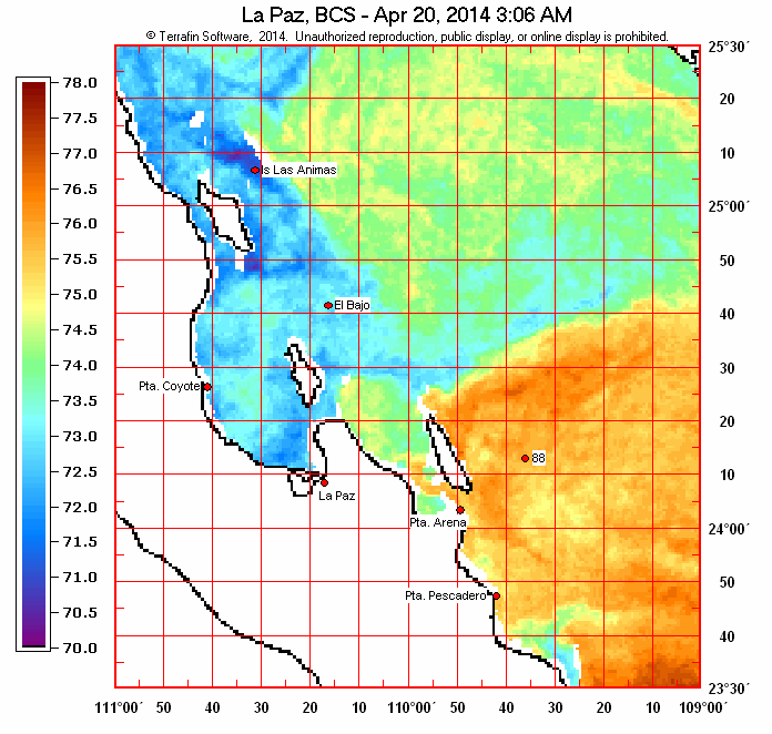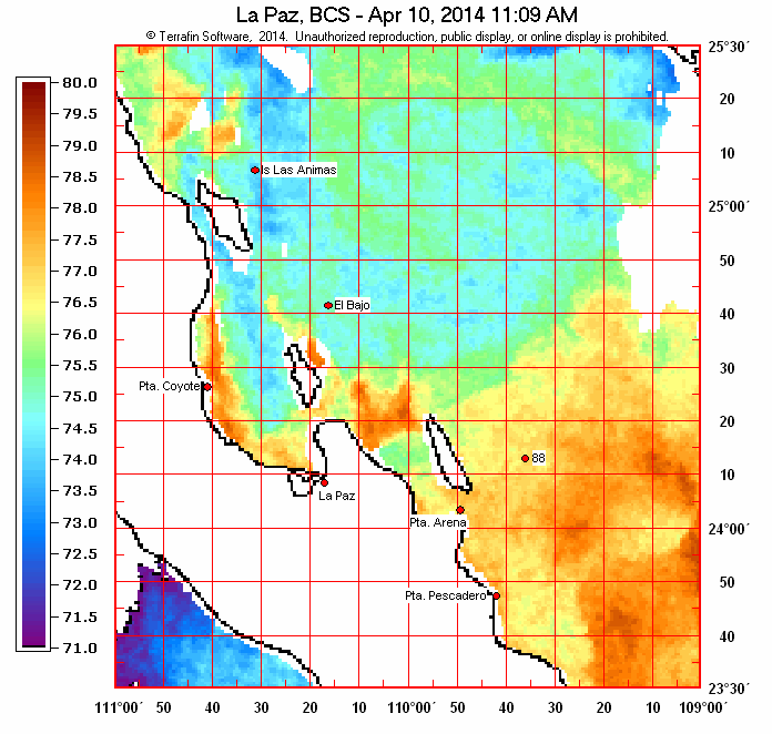 The latest satellite shot from http://www.terrafin.com shows the heavy bodies of warm water around Cerralvo Island while cooler waters still hold north of La Paz city.