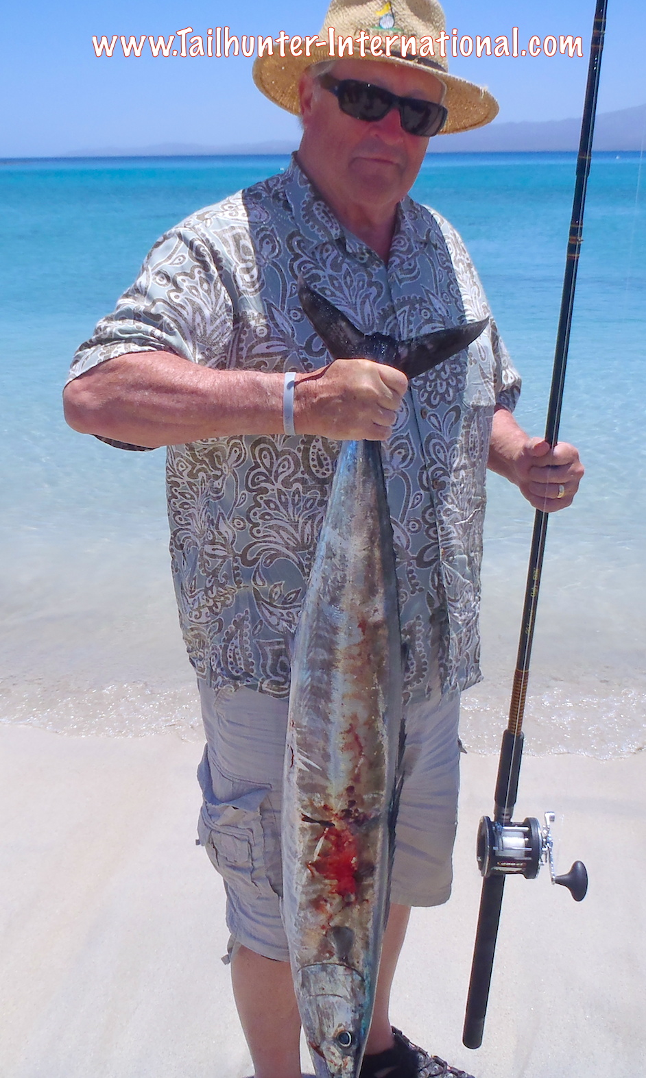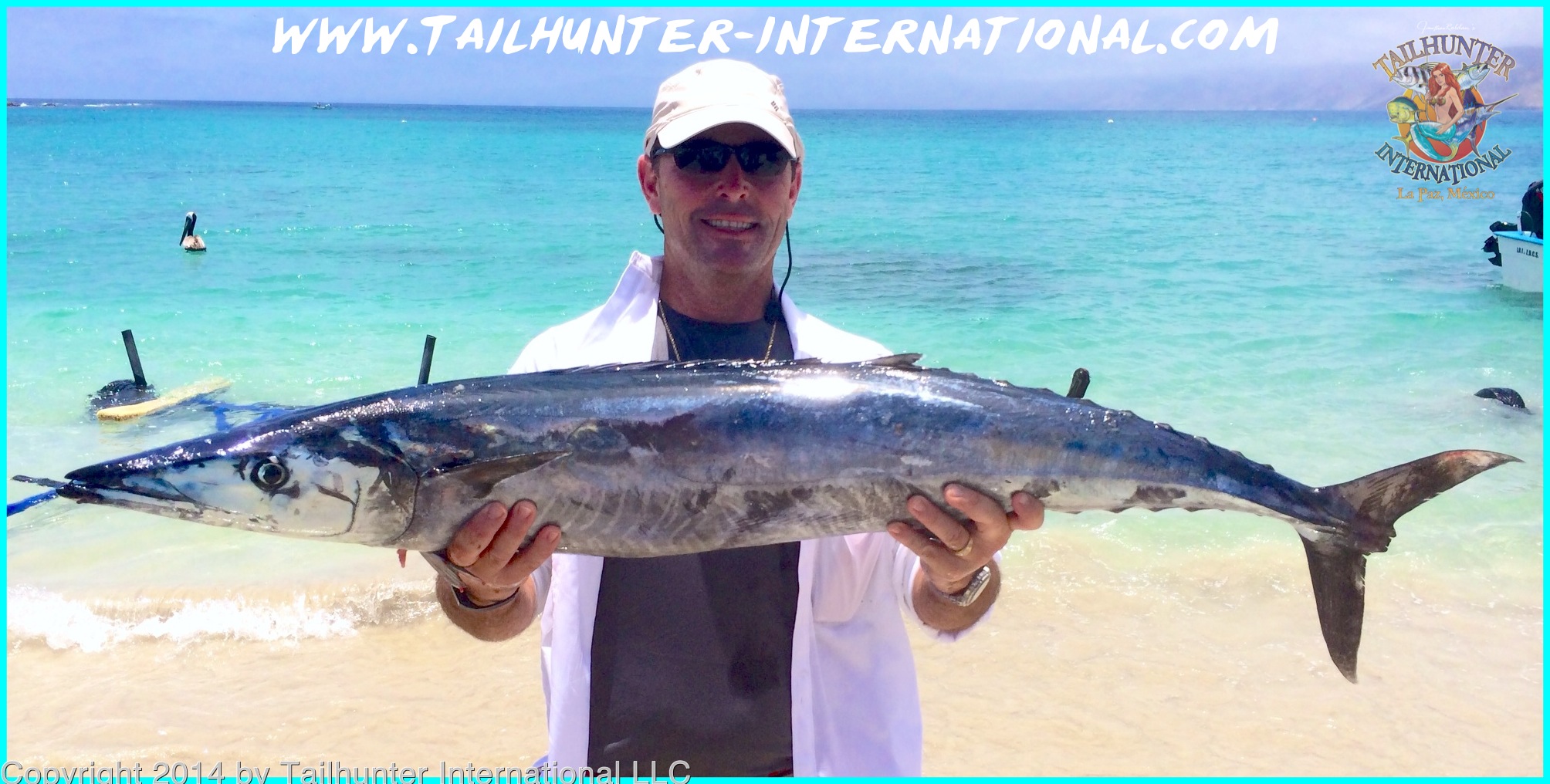 Biggest wahoo of the week and winner of $100 best from his amigos, Eddie Flanigen posted up this nice fish he hooked off the south end of Cerralvo Island on his first day of fishing. Ed is from Louisiana and is holding his fish on the beach at Bahia de Los Muertos.
