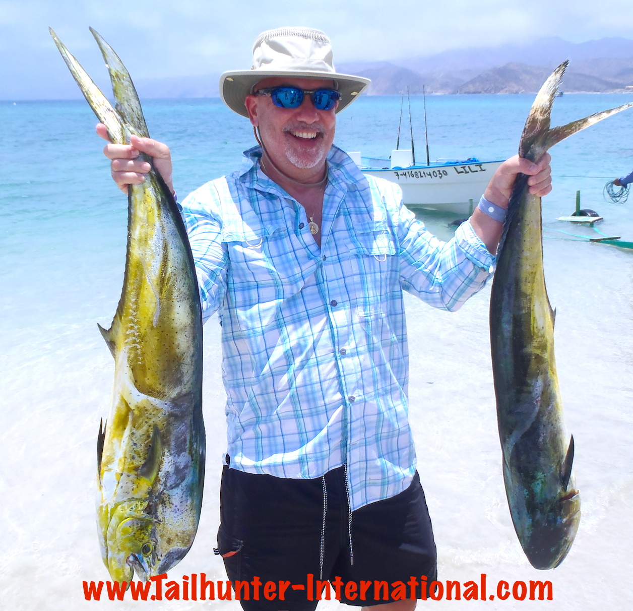 Maybe one of the happiest guys of the week. Great fun to have Felipe Yanez with us fishing all week. He holds up a paid of dorado caught with our Las Arenas fleet.