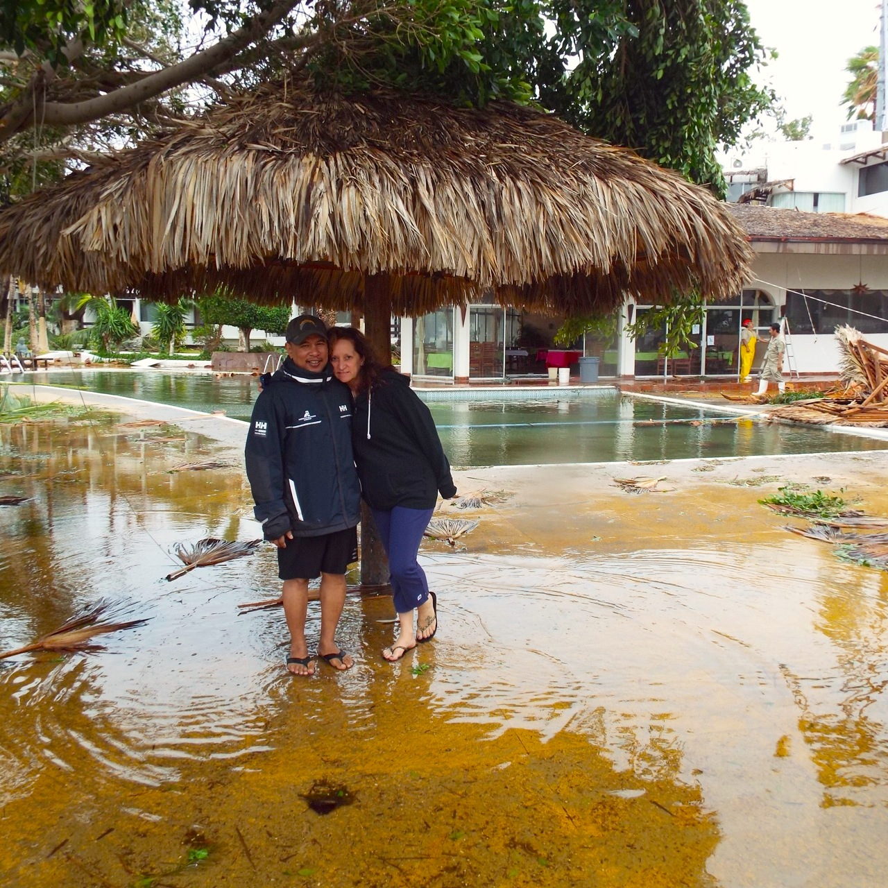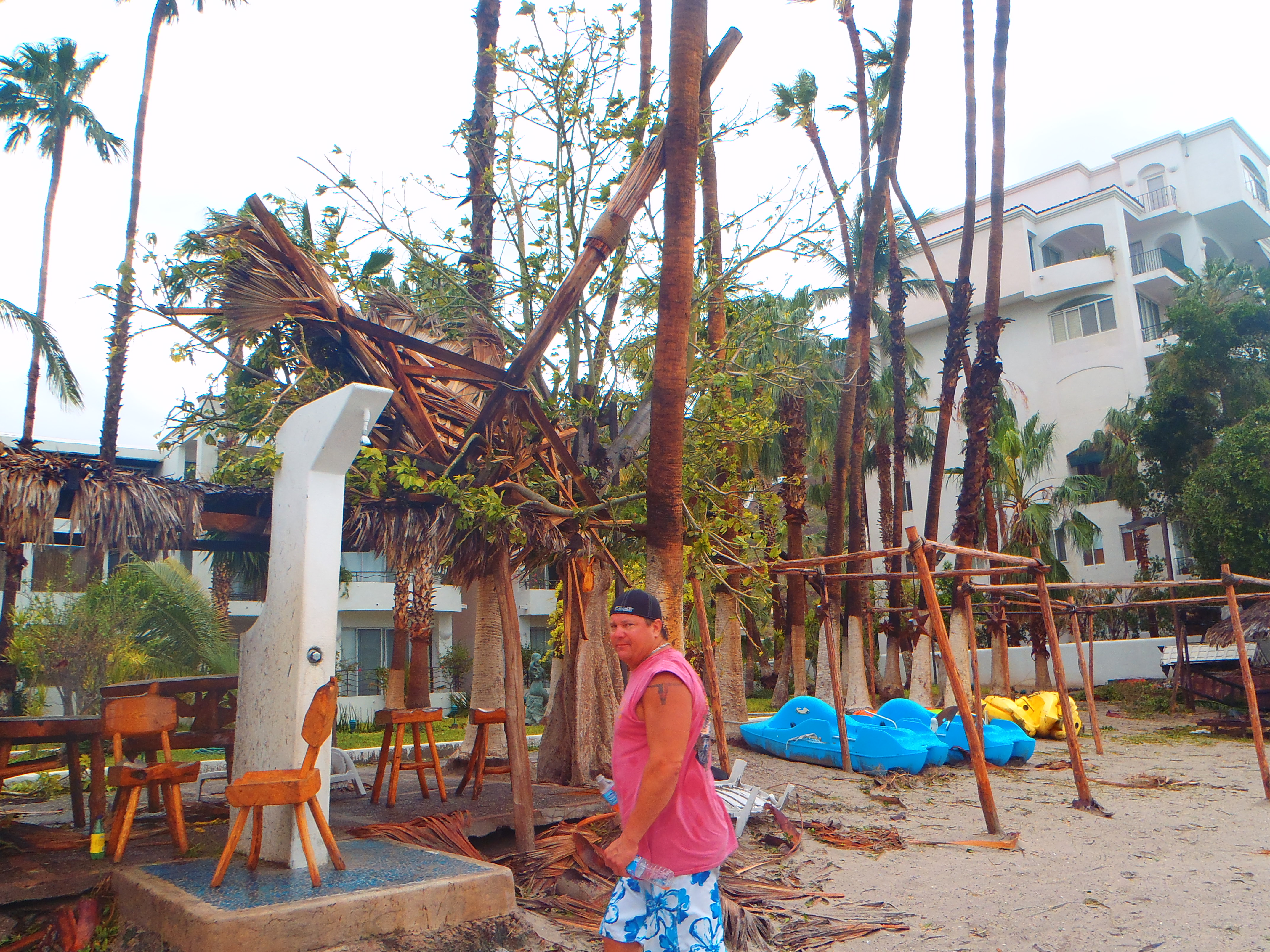 Two weeks ago, we were ankle deep and surveying the damage the morning after Odile struck La Paz. Fallen trees…broekn windows…shattered glass everywhere. It had been a long and sleepless night. The start of many to follow. The hotel has made a remarkable recovery!