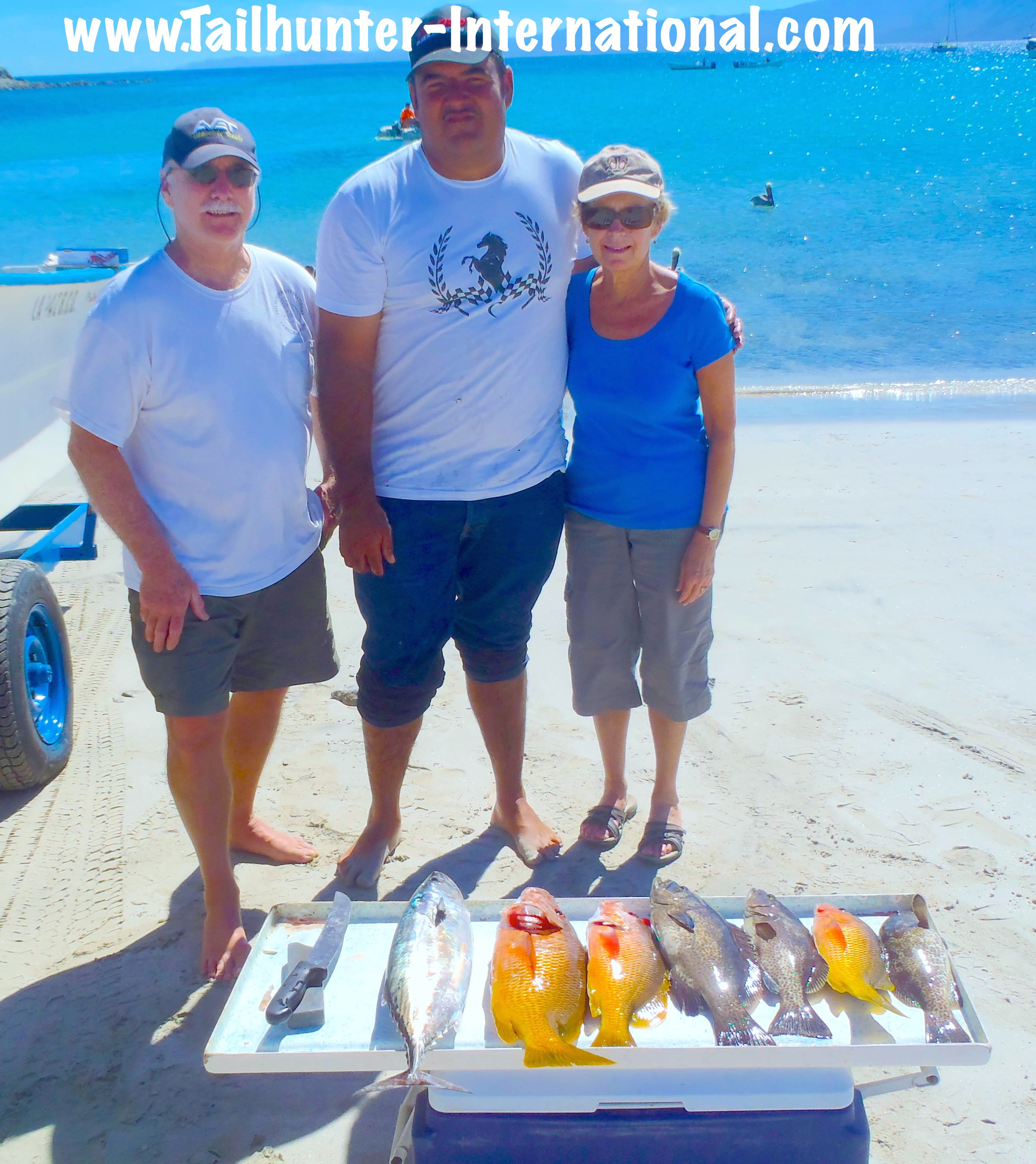 Washington amigos in the house! Grant and Carol Darby with our Captain Gerardo and a colorful selection of the day’s catch including pargo, yellow snapper, cabrilla and sierra! All great eating fish.