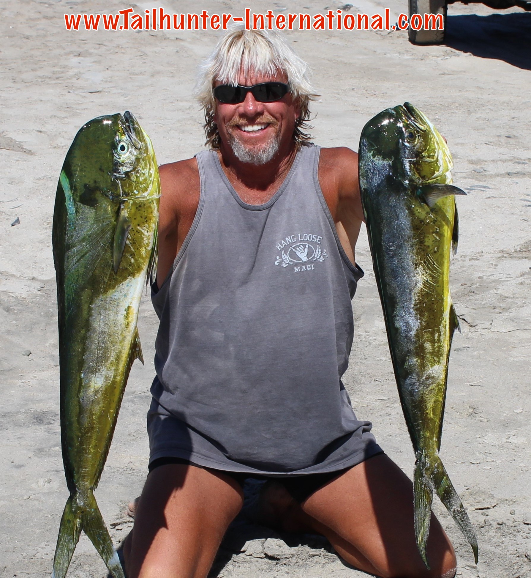 TV show host and actor, Rick Kasper on the beach at Bahia de Los Muertos. Rich had a nice day of dorado including these two and a few others.
