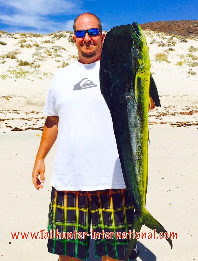 From Washington, Nyle Miyamoto, with one of our early season dorado no the beach at Muertos. Waters are warming and we expect to see more dorado anytime now.