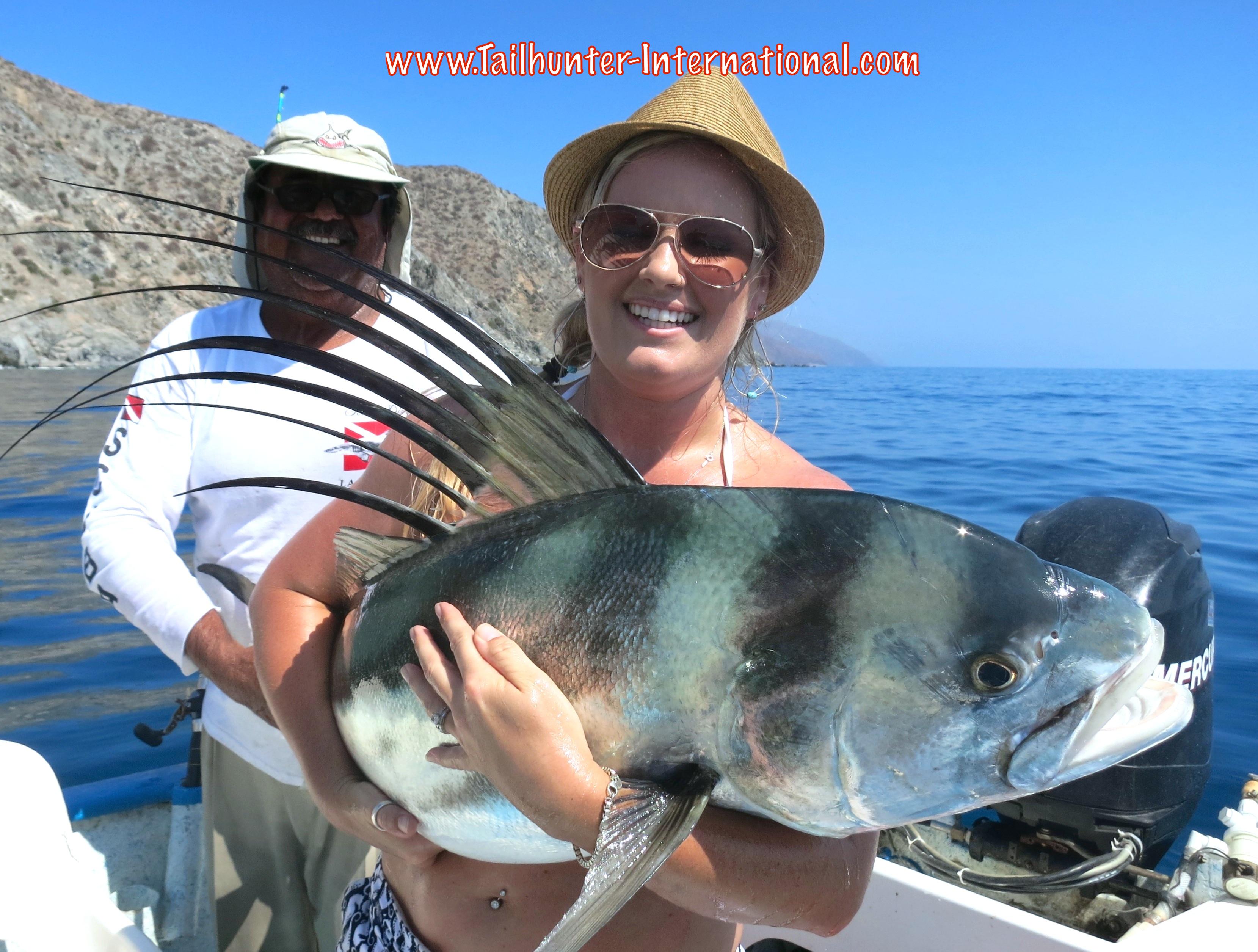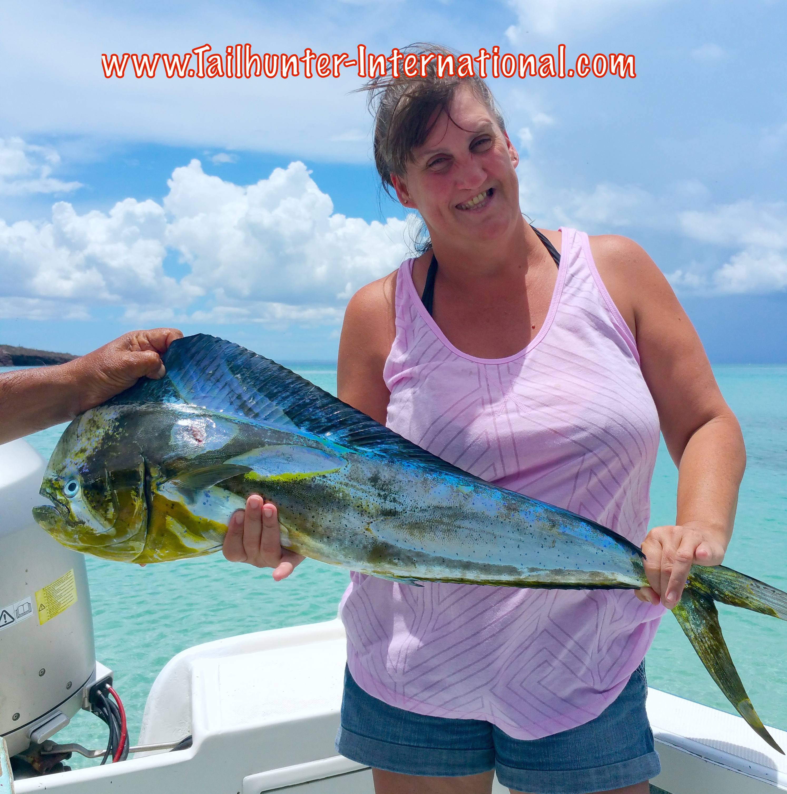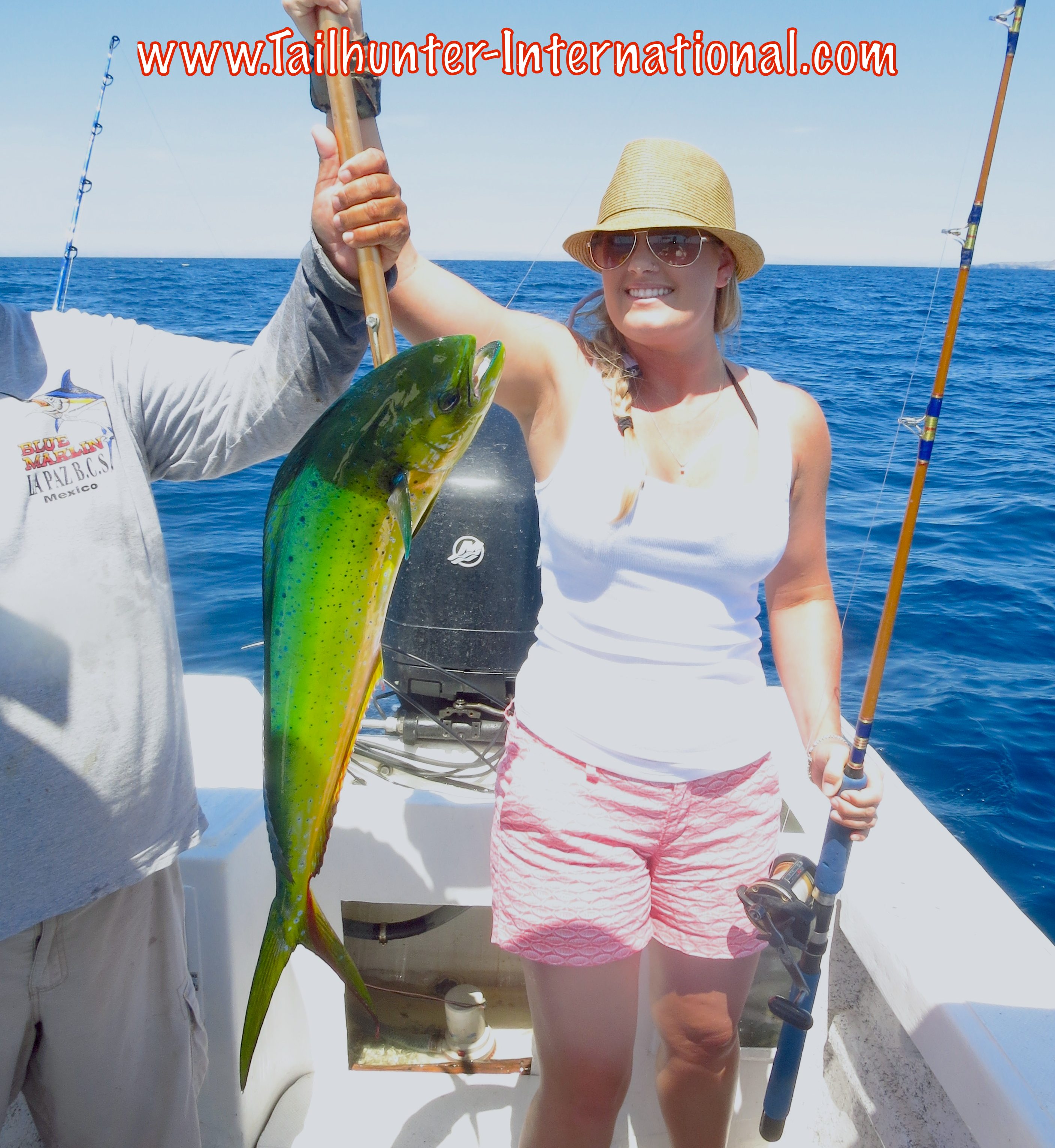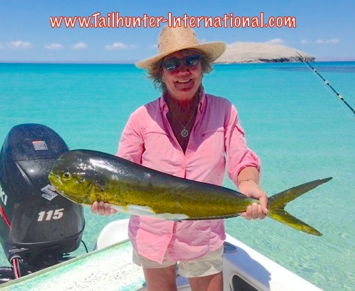 Katie Olson with another dorado and a picture-postcard photo after a day of fishing with out Tailhunter La Paz fleet. Always good to have her and husband, John, visiting us.