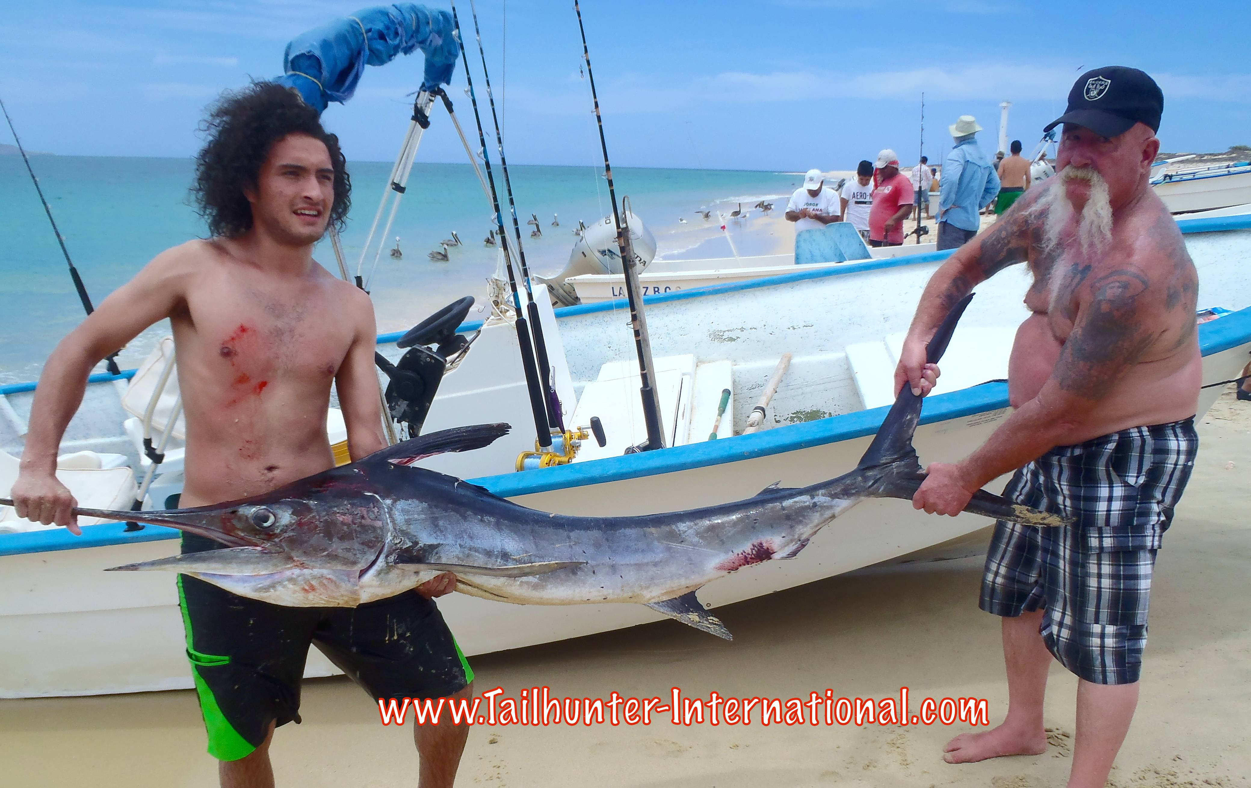 Our buddy, Alex Trasvina from San Diego (white shirt in front) always brings a fun group of guys every year, but last year they showed up just as a hurricane broke on our heads and we all had to come back and cancel all the fishing. But this year…all went smooth so we toasted a bunch of beer in the Tailhunter store!