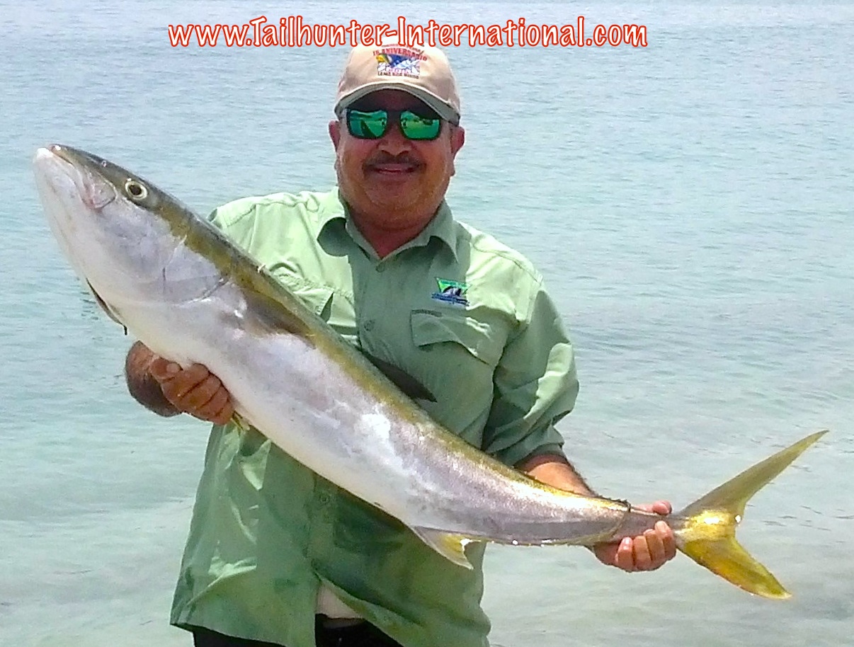 The man behind the mask is Jorge Santana with a real surprising catch for August…yellowtail and two trophy cabrilla. All those fish are normally caught when the waters are much cooler in the winter and spring. He was fishing deep off the Las Arenas lighthouse where there must be a current of cold water holding the fish.