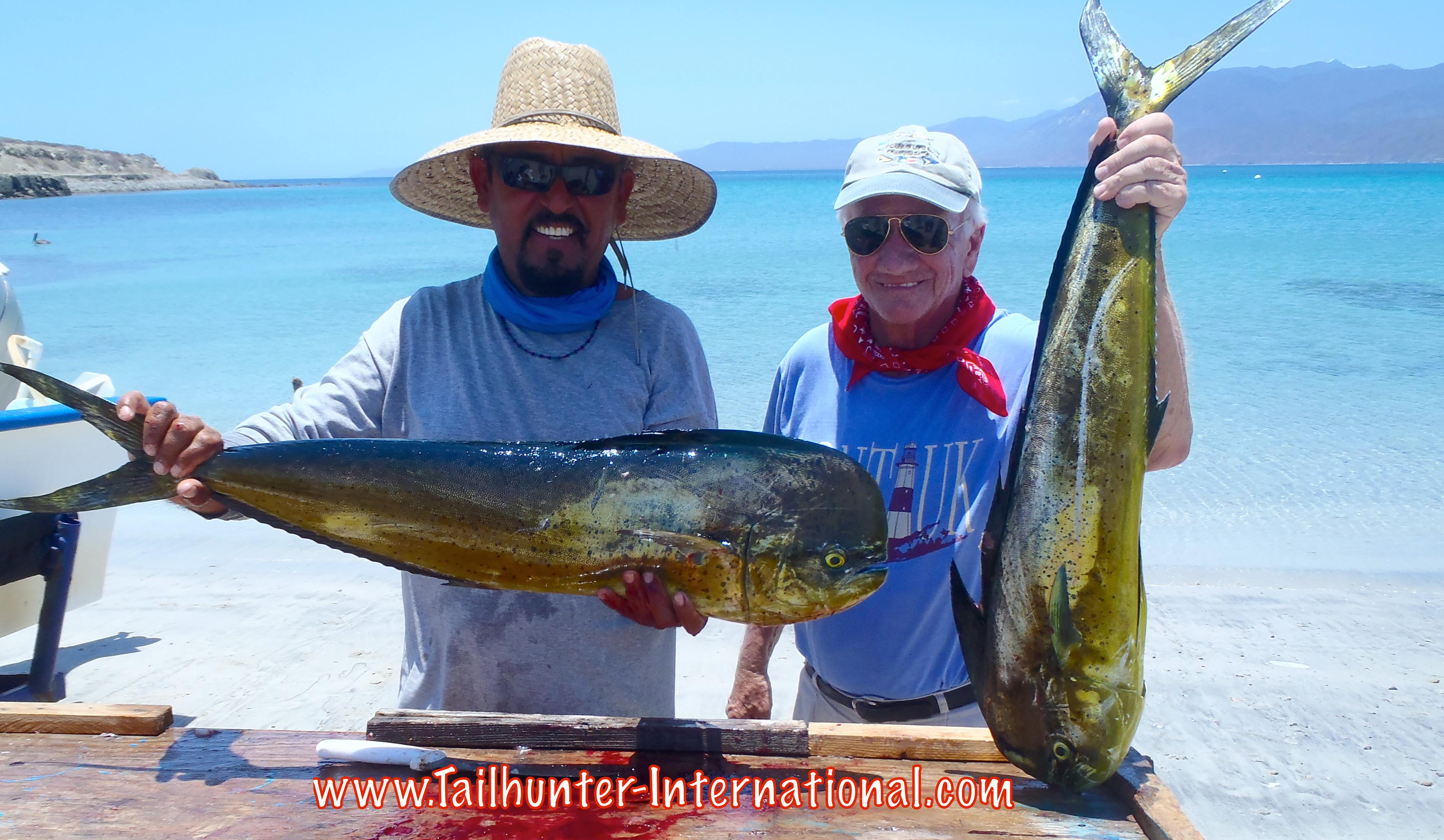 Captain Rogelio poses with Meng Foo and one of his several dorado he caught fishing north of La Paz near Espirito Santo Island.